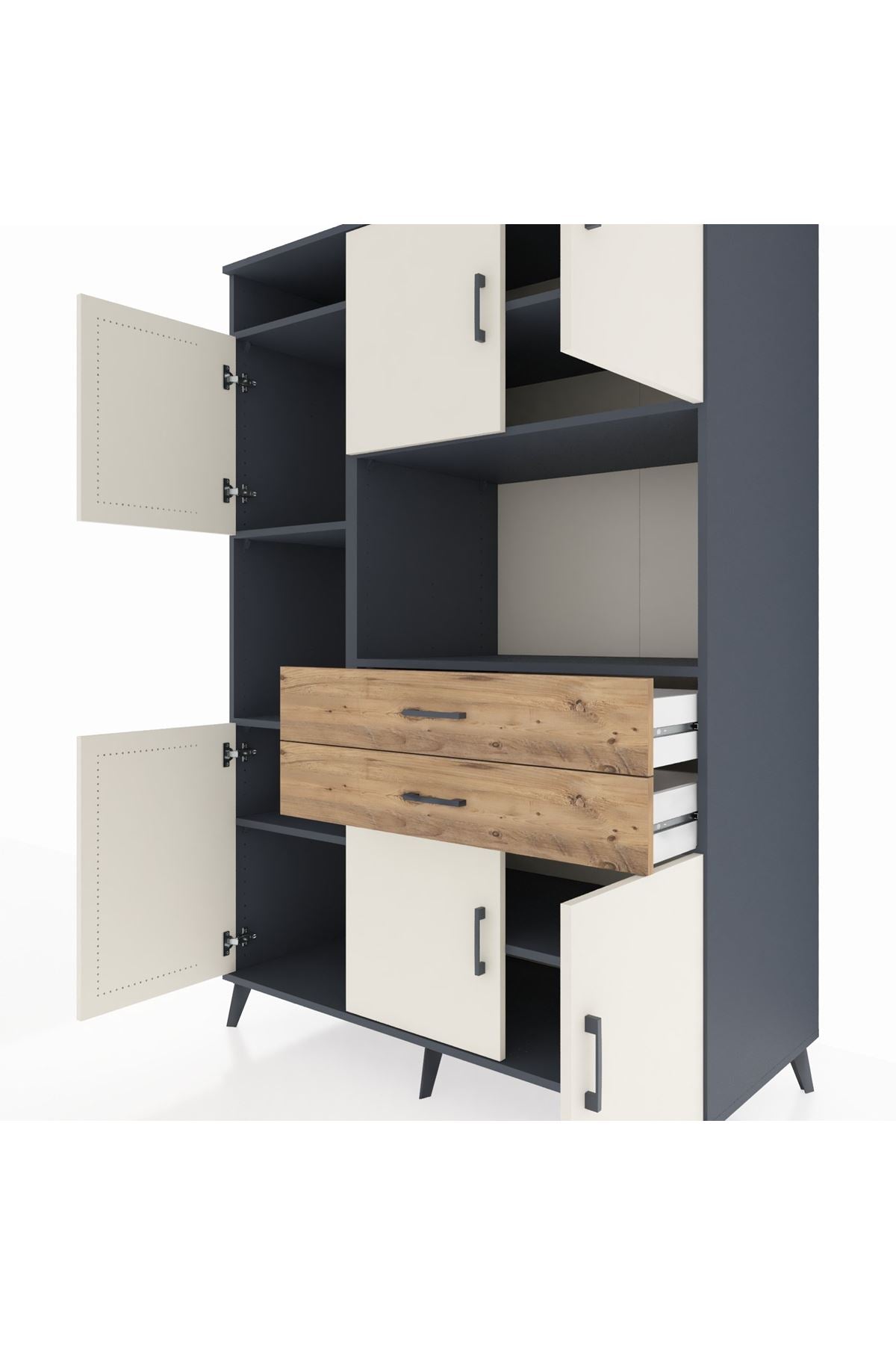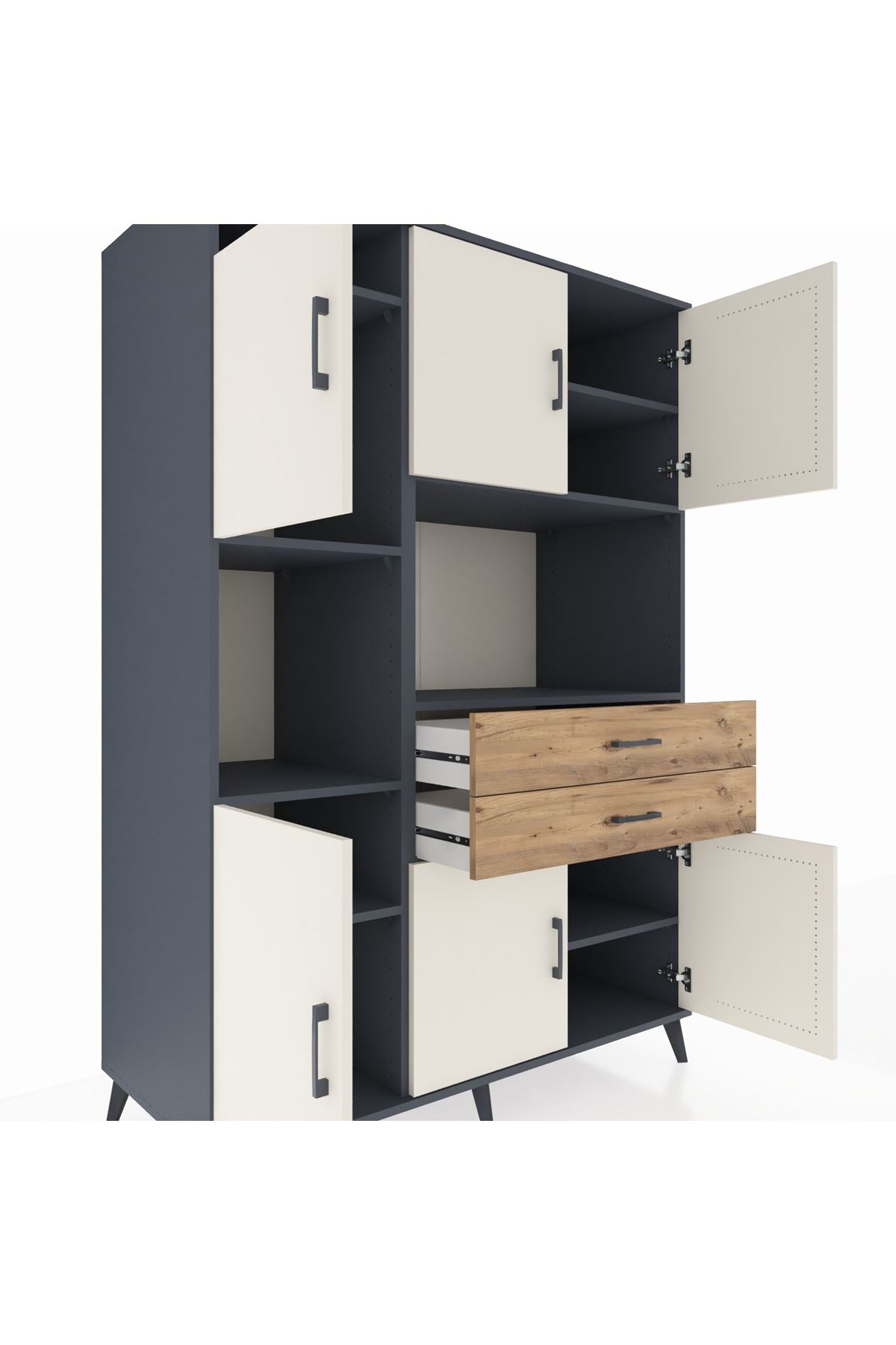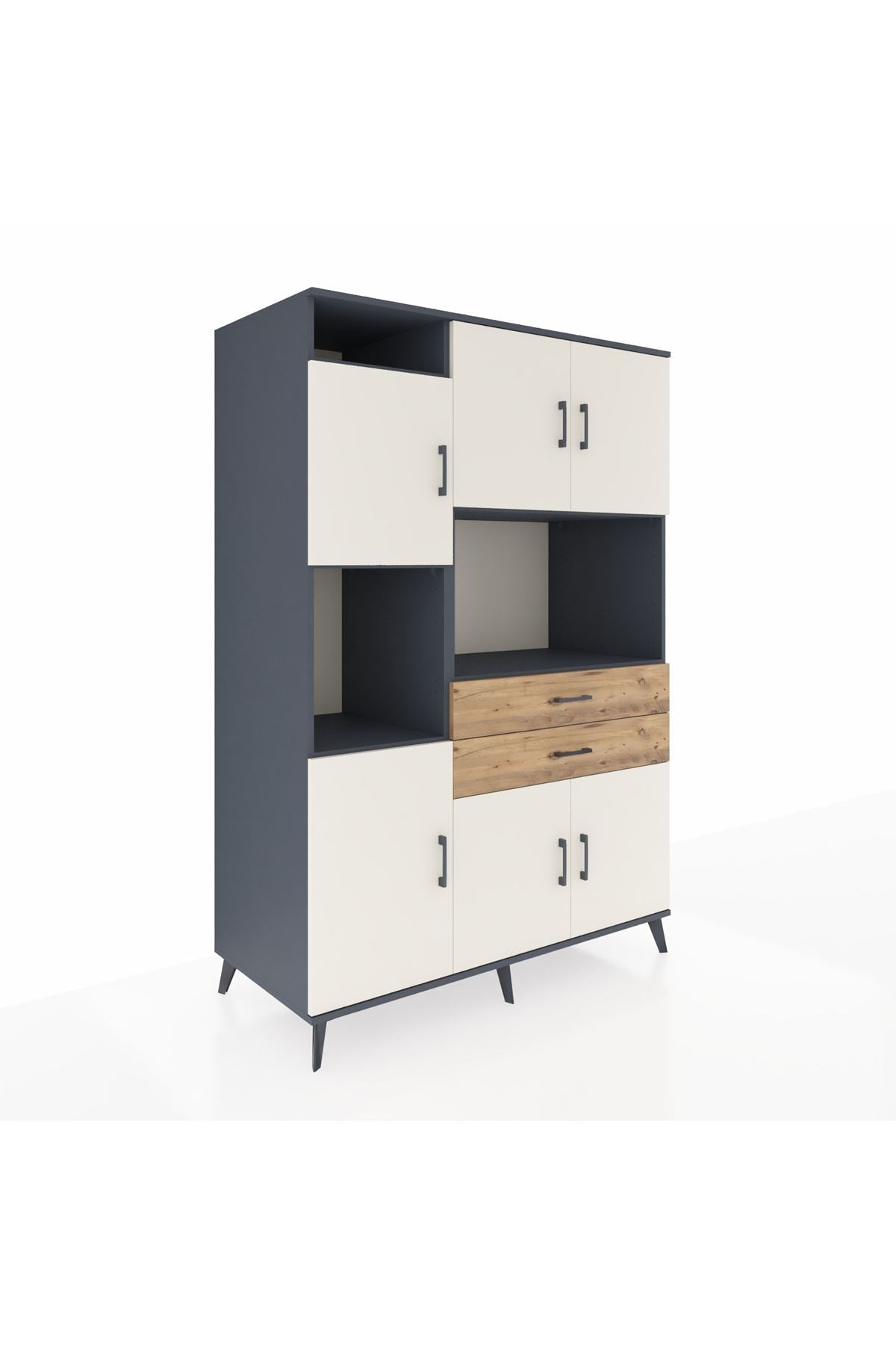 Fonksiyonellik ve zarafeti bir arada arayanlar için tasarlanan bu çok amaçlı dolap, modern yaşam alanlarınıza pratiklik ve şıklık katıyor. 8 geniş raf, 2 kullanışlı çekmece ve 6 kapaklı yapısıyla tüm eşyalarınız için ideal bir saklama alanı sunar. Antrasit ve Aytaşı/Çam renk kombinasyonu, her dekorasyona uyum sağlarken, zamansız bir görünüm kazandırır.