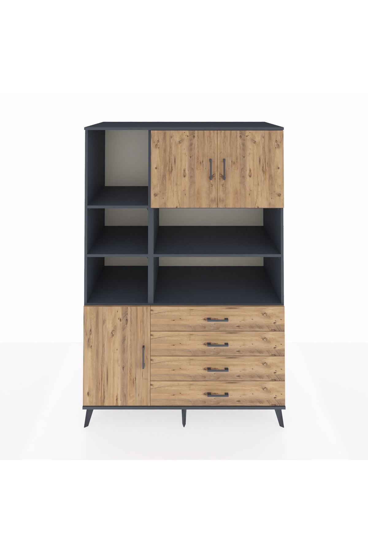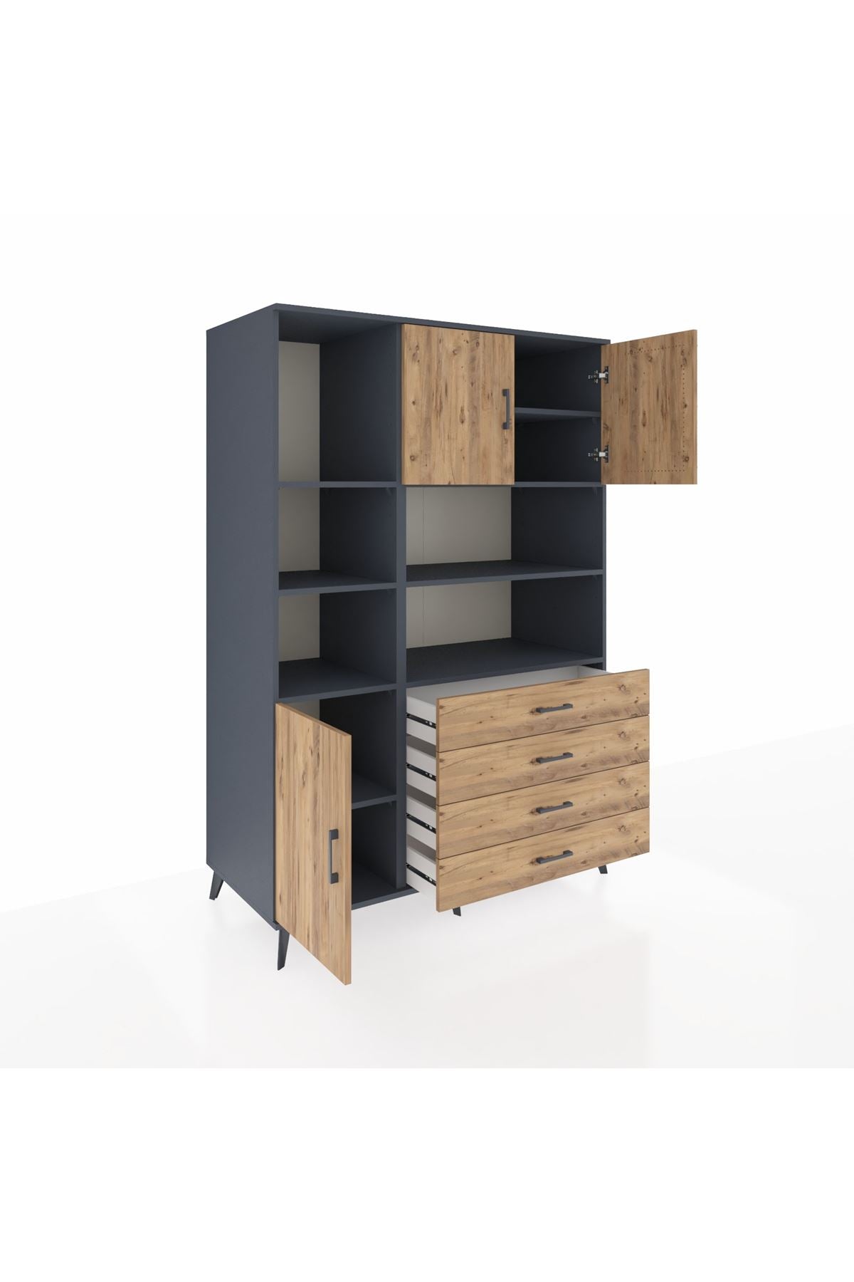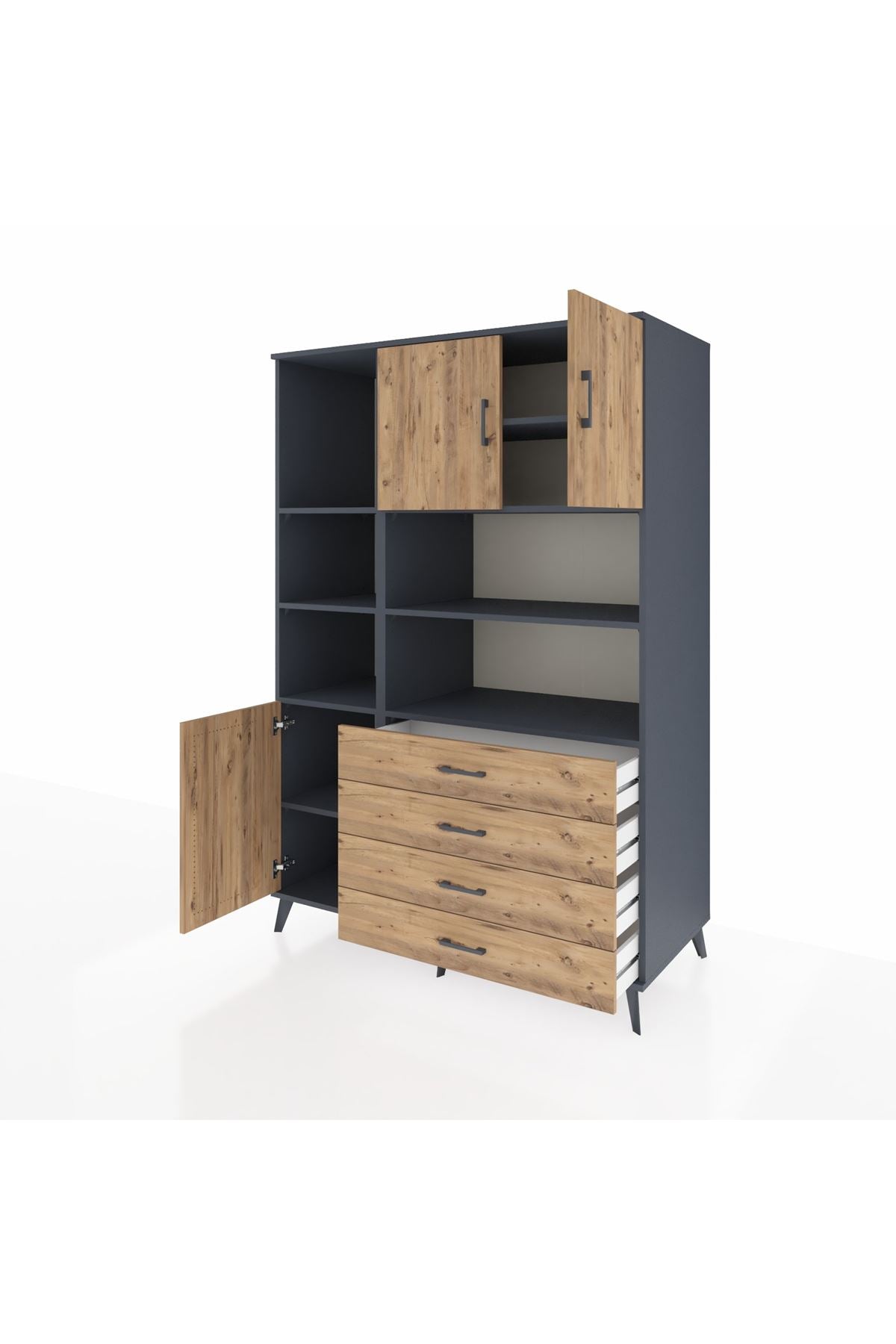 Kronos Dolap 8 Raflı 4 Çekmeceli 3 Kapaklı 132x59x195 Antrasit-Çam/Çam