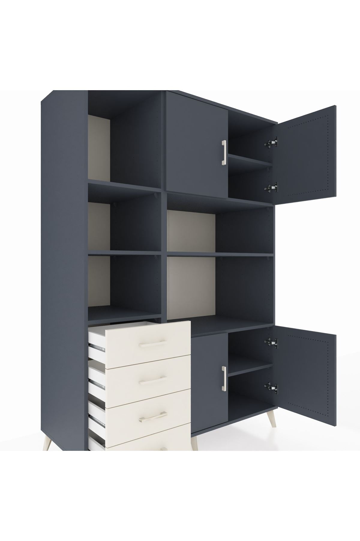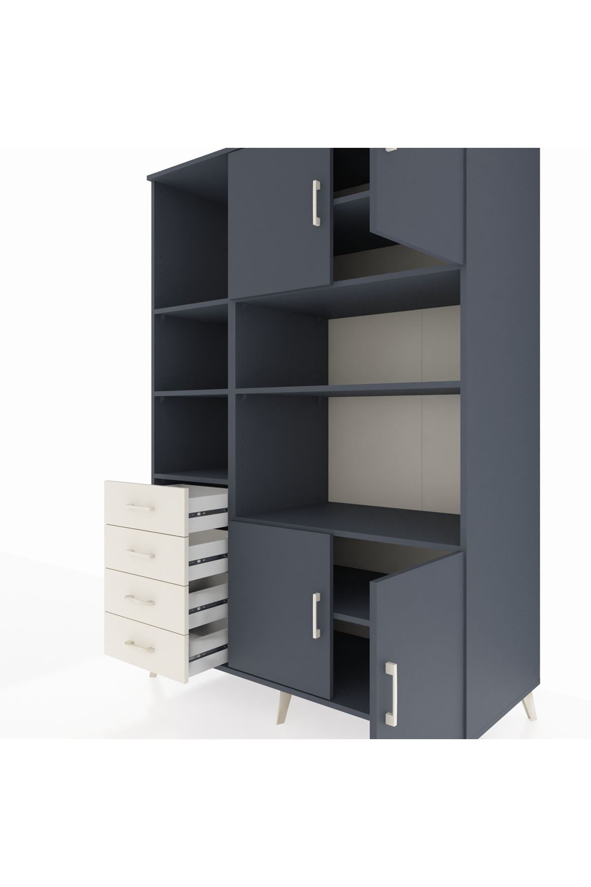 Kronos Dolap; 8 adet geniş rafı, 4 fonksiyonel çekmecesi ve 4 kapaklı alanı ile eşyalarınızı düzenlemenin en zarif yolunu sunuyor. 📦👗 Her bölmesi ihtiyaca uygun genişlikte tasarlandı, böylece ister kıyafet, ister kitap, ister ev tekstili için ideal alanlara sahip olursunuz.
