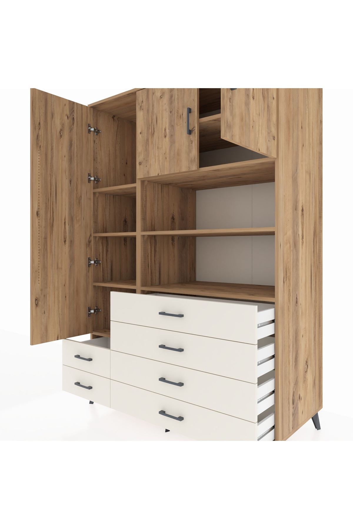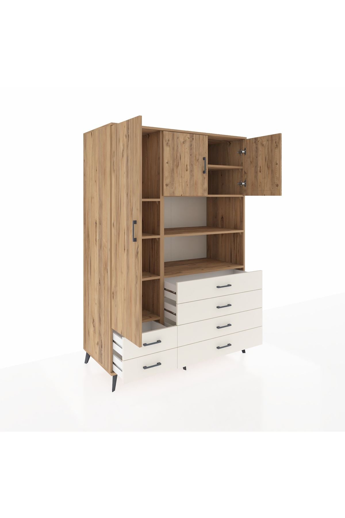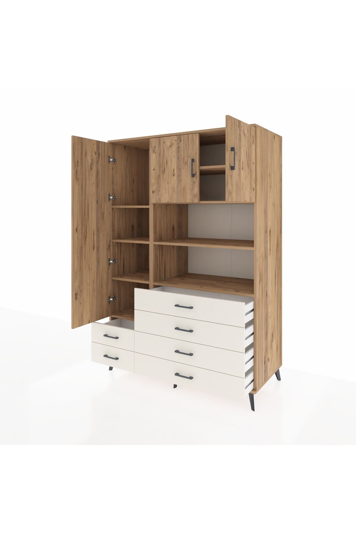 8 geniş raf, 6 fonksiyonel çekmece ve 3 kapaklı bölmesiyle eşyalarınızı kolayca gruplandırabilirsiniz 🗄️🧺