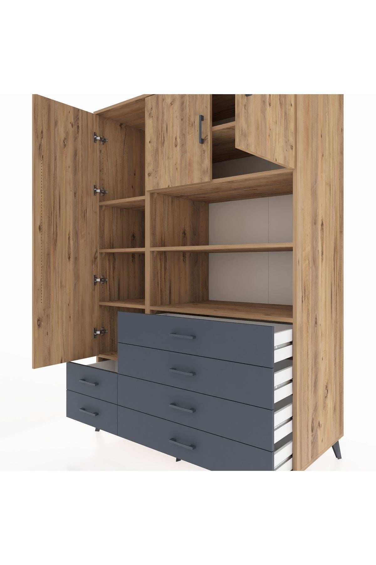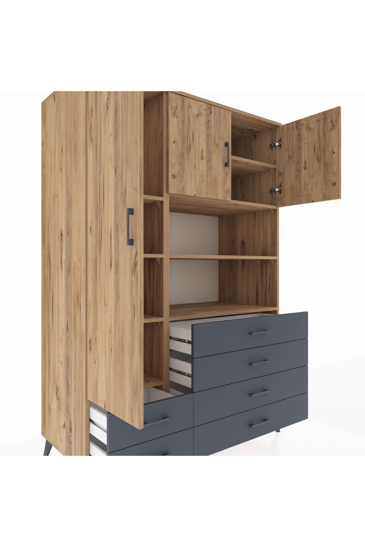 🌞 Kronos Dolap 8 Raflı 6 Çekmeceli 3 Kapaklı 132x59x195 Çam-Çam/Antrasit