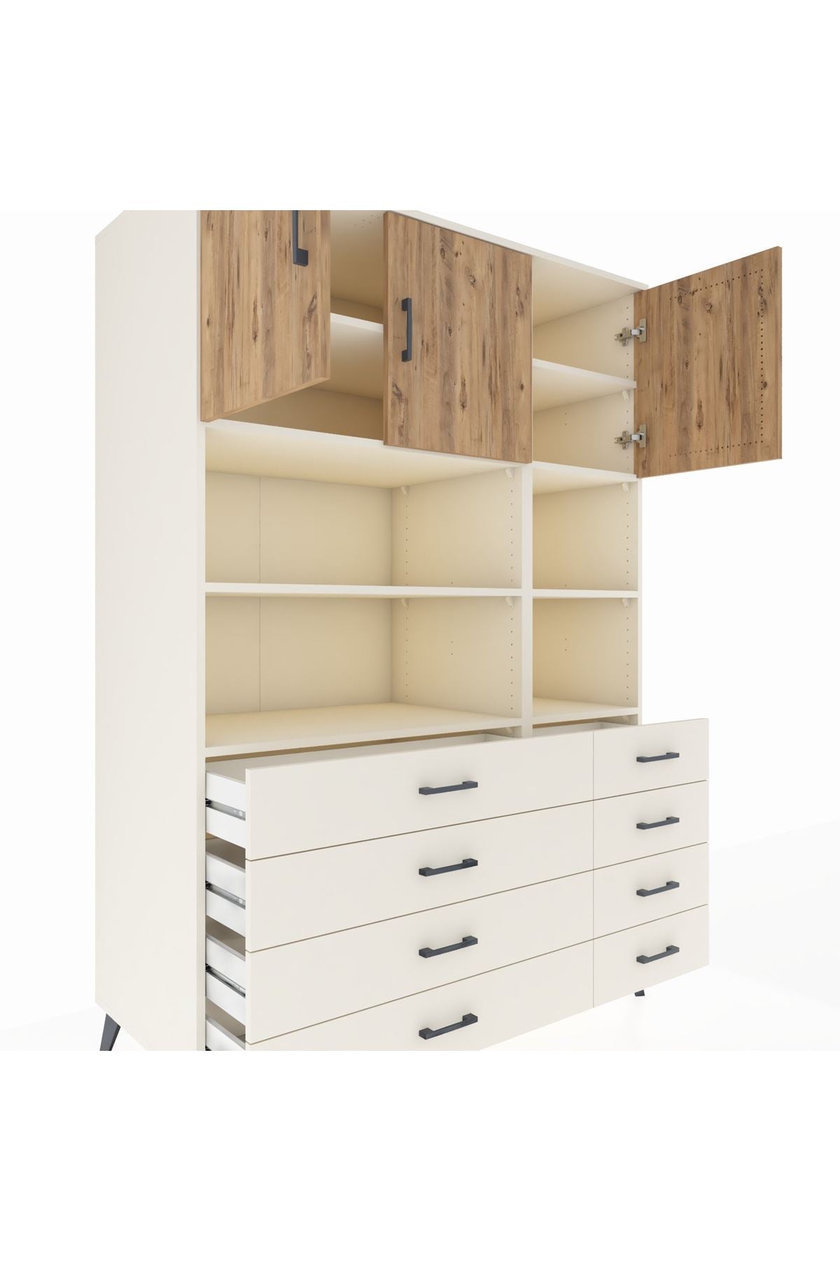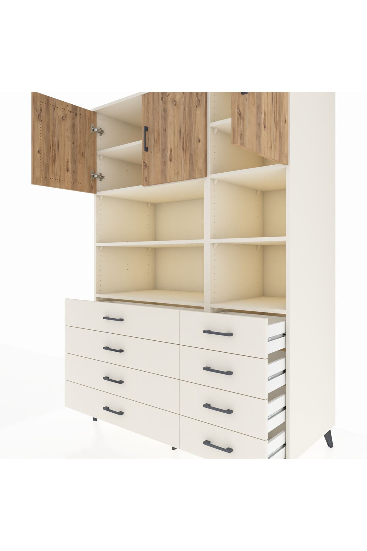 🪐 Kronos Dolap 8 Raflı 8 Çekmeceli 3 Kapaklı 132x59x195 Aytaşı-Çam/Aytaşı: Zarafet ve Fonksiyon Bir Arada!