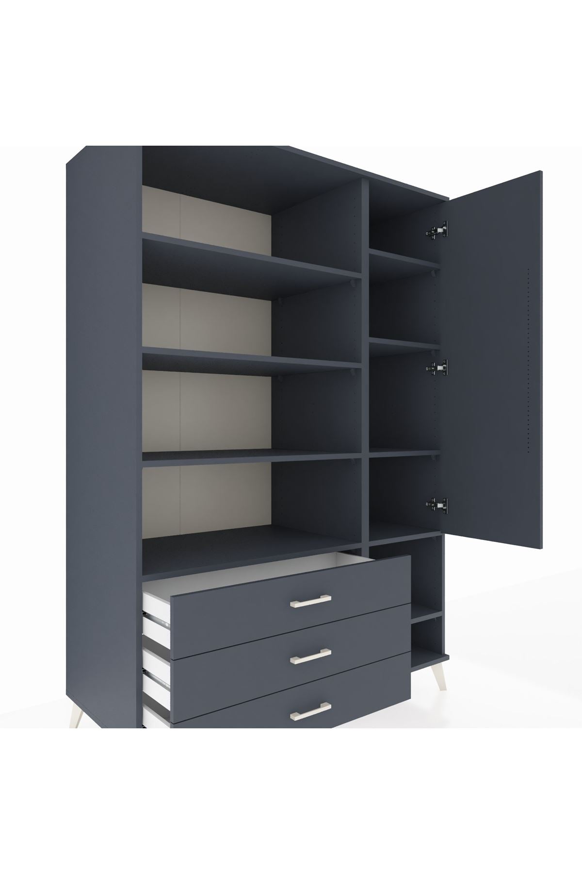 Kronos dolap, 9 rafı sayesinde kitaplar, klasörler, tekstil ürünleri ve dekoratif eşyalar için geniş ve düzenli saklama alanı sunar. Ayarlanabilir raf sistemi farklı yüksekliklerde eşyalarınızı yerleştirmenize izin verir. 3 çekmeceli yapı, küçük eşyalar, belgeler ve aksesuarlar için düzen sağlar; çekmece sayısı isteğe bağlı olarak konfigüre edilebilir. Metal ayaklar zeminden yüksekte tutarak nem ve çizilmelere karşı koruma sağlar. Suntalam yüzeyi kolay temizlenir ve uzun süre estetik görünümünü korur.