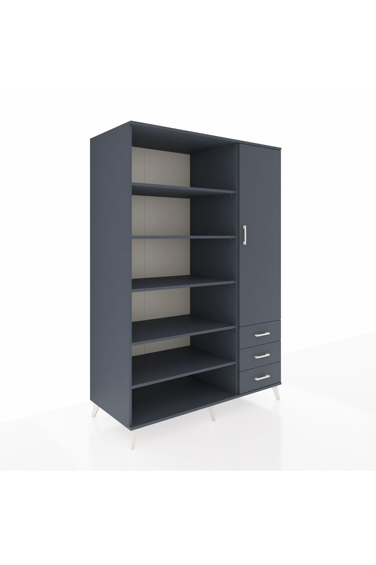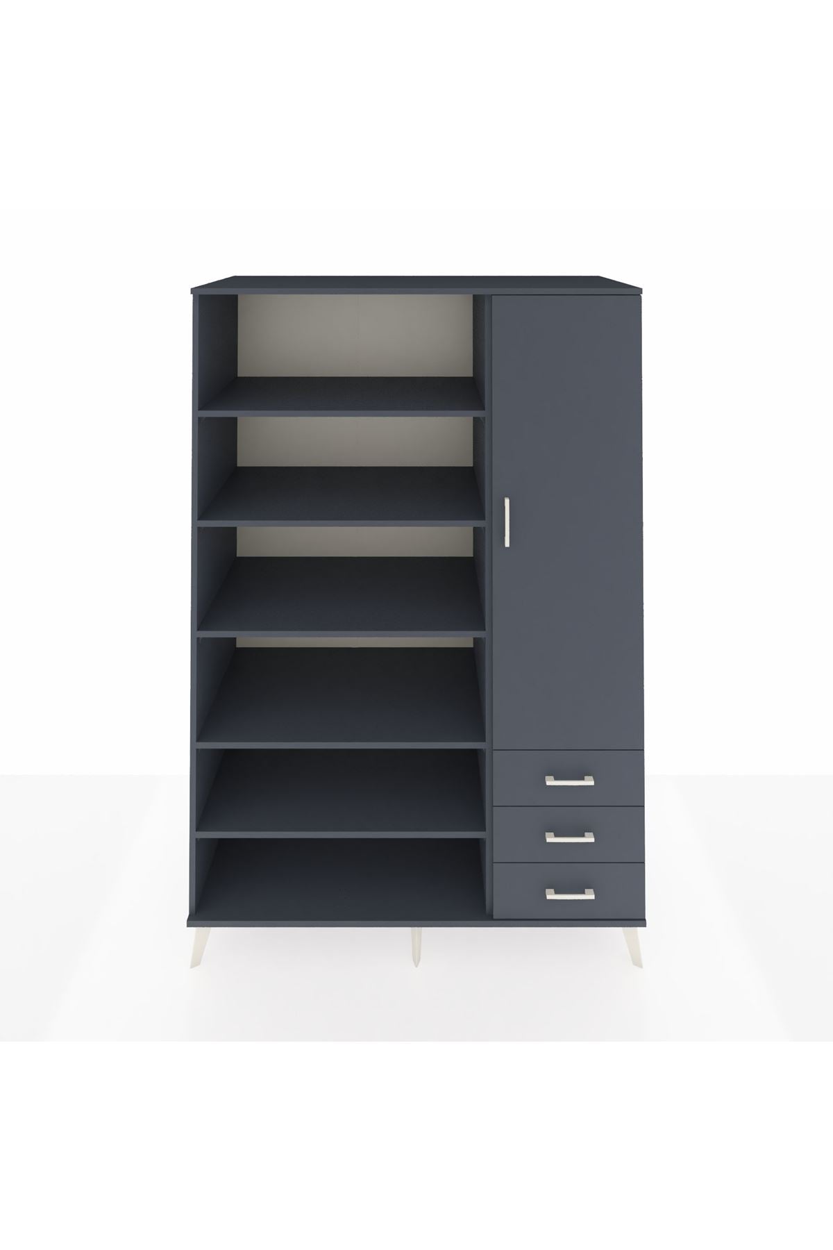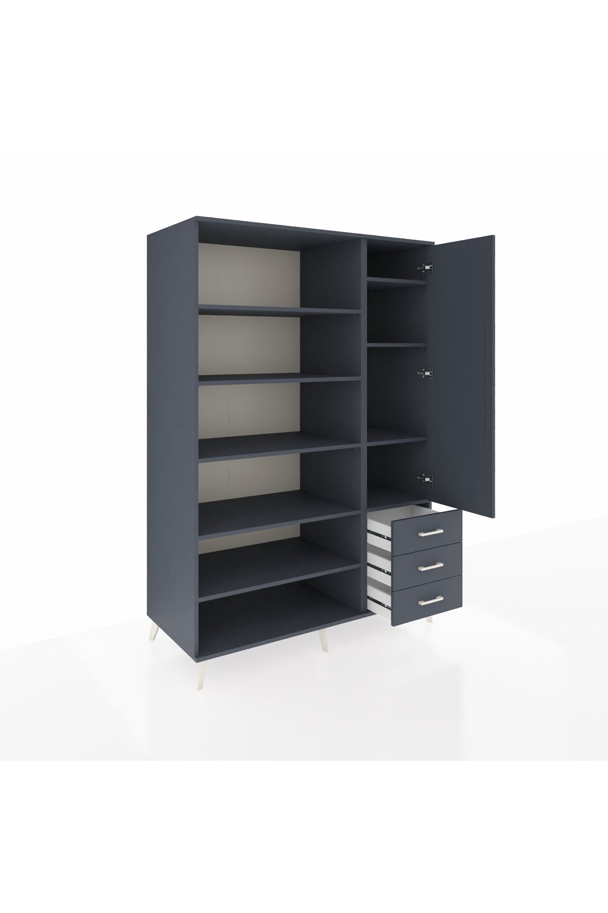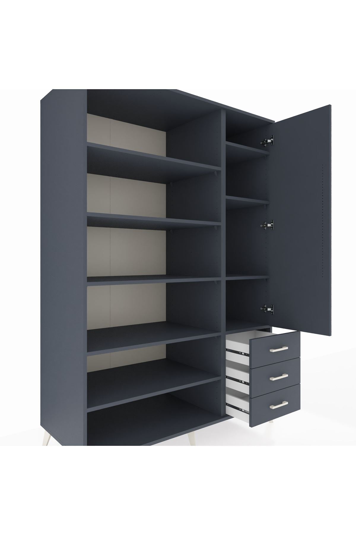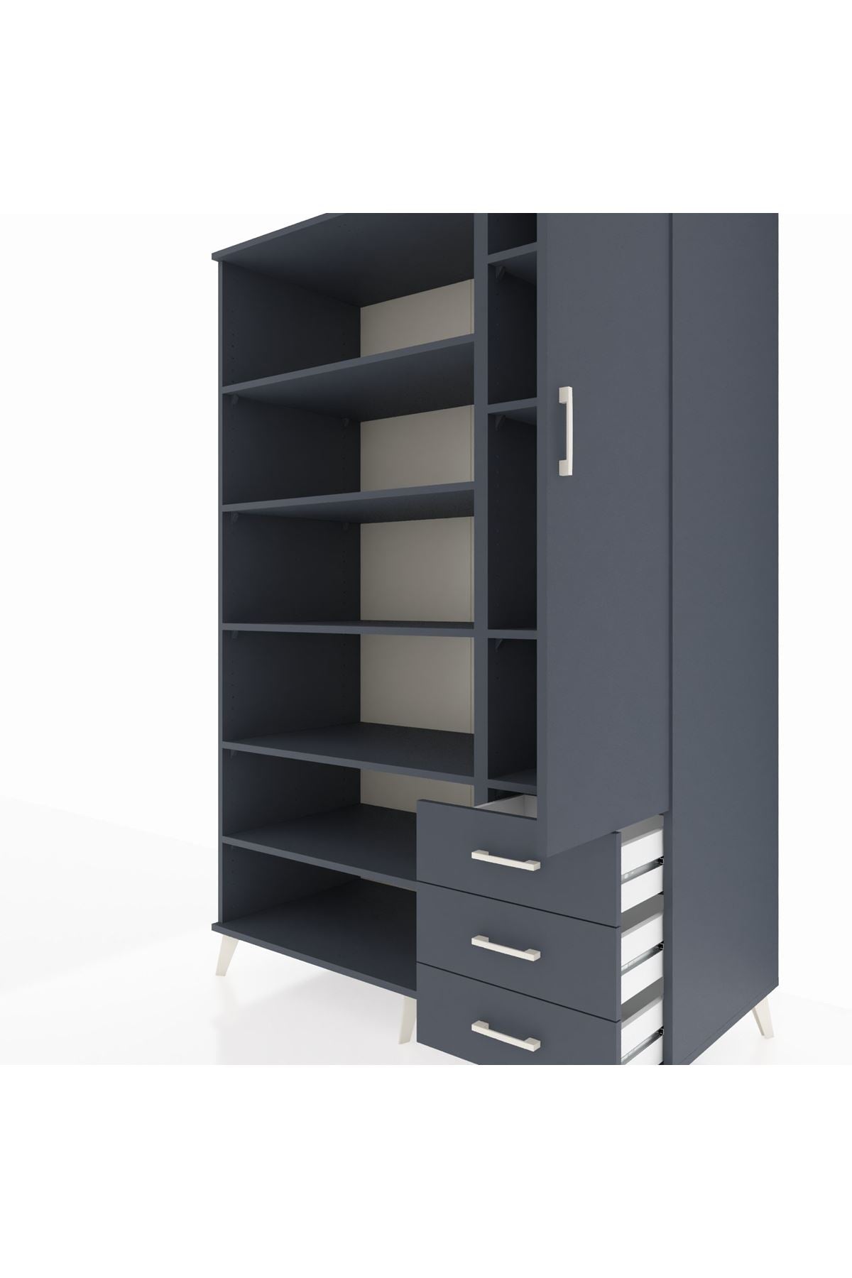 Geniş iç hacmi ve 9 ayarlanabilir rafıyla farklı boyutlardaki eşyaları kolayca sınıflandırma imkânı verir. Tek kapaklı bölme sayesinde gizli depolama sağlanır; 3 çekmece ile küçük eşyalar, kıyafet aksesuarları ve ofis malzemeleri düzenli tutulur. Çekmece sayısı konfigüre edilebilir olması, kullanım ihtiyaçlarına göre kişiselleştirme olanağı tanır. 1. Sınıf suntalam yüzeyleri kolay temizlenir ve darbelere karşı dayanıklıdır. Metal ayak yapısı zeminden yüksek tutarak nem ve temizliği kolaylaştırır.