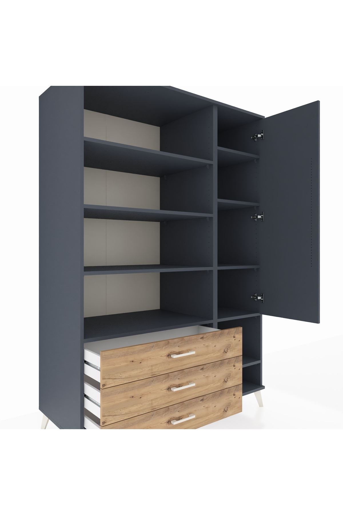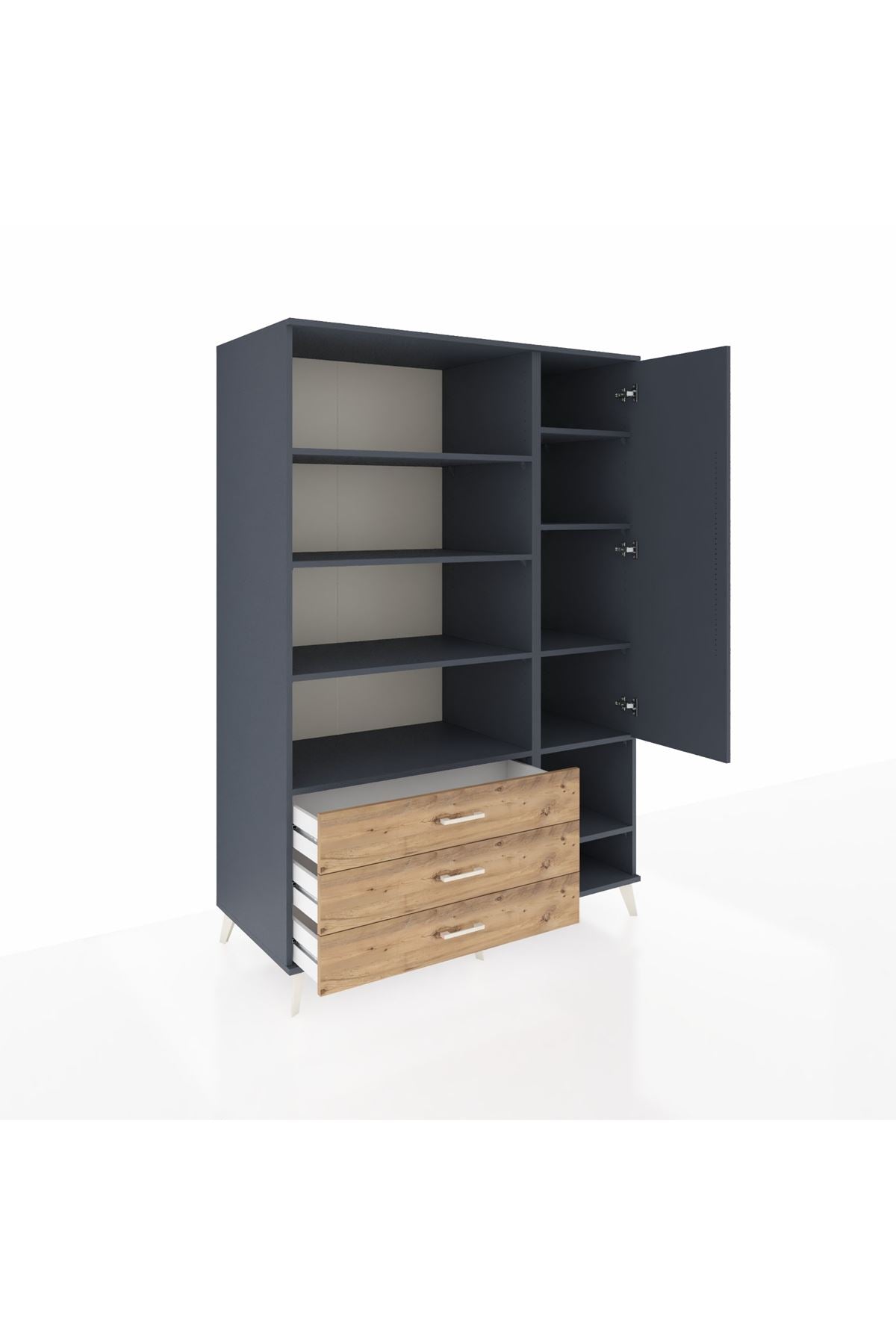 Bu dolap, evinizde düzenli ve fonksiyonel depolama alanı sağlar. Antrasit tonun modern duruşu ve çam kapakların doğal dokusu kombinasyonu, temiz ve dengeli bir estetik sunar. Metal ayakları sağlam ve dayanıklı, metal kulplar uzun ömürlü kullanım sunar.