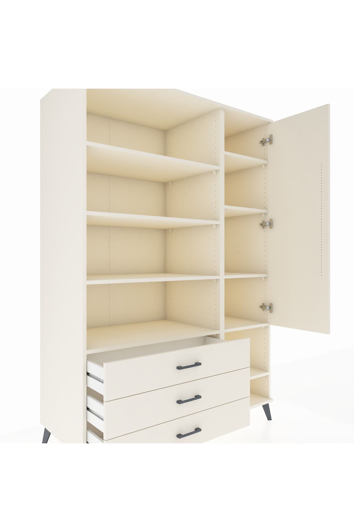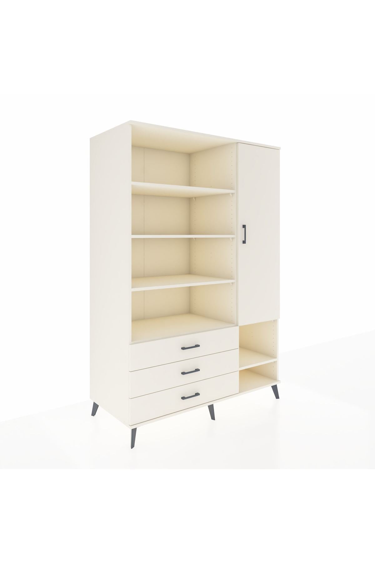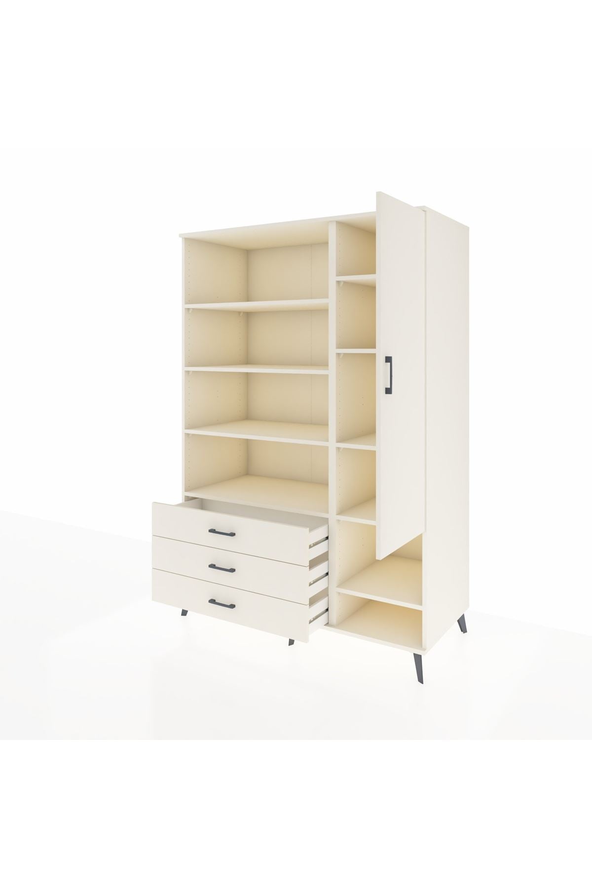 Geniş iç hacim ve 9 raflı düzeni ile kitaplar, dosyalar, malzemeler ve depolanması gereken kişisel eşyalar için ideal depolama alanı oluşturur. Kapaklı bölüm içindeki raflarla görünürlük azaltılarak daha düzenli bir görünüm elde edilir. Alt bölgedeki çekmeceler küçük ekipman, kırtasiye veya tekstil ürünleri için kolay erişim sağlar. Metal ayak sayesinde zeminden yüksekte konumlanan dolap, temizlik ve hava sirkülasyonu açısından avantaj sağlar. Ofis, okuma odası veya bekleme alanları için estetik ve fonksiyonel bir çözüm sunar.