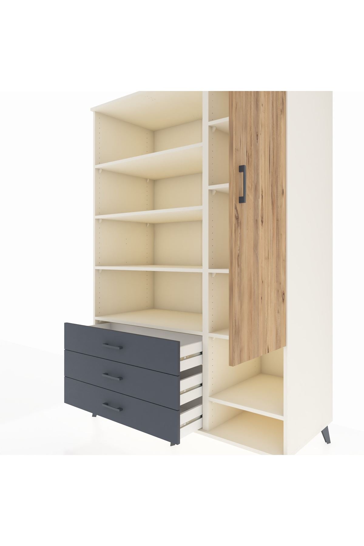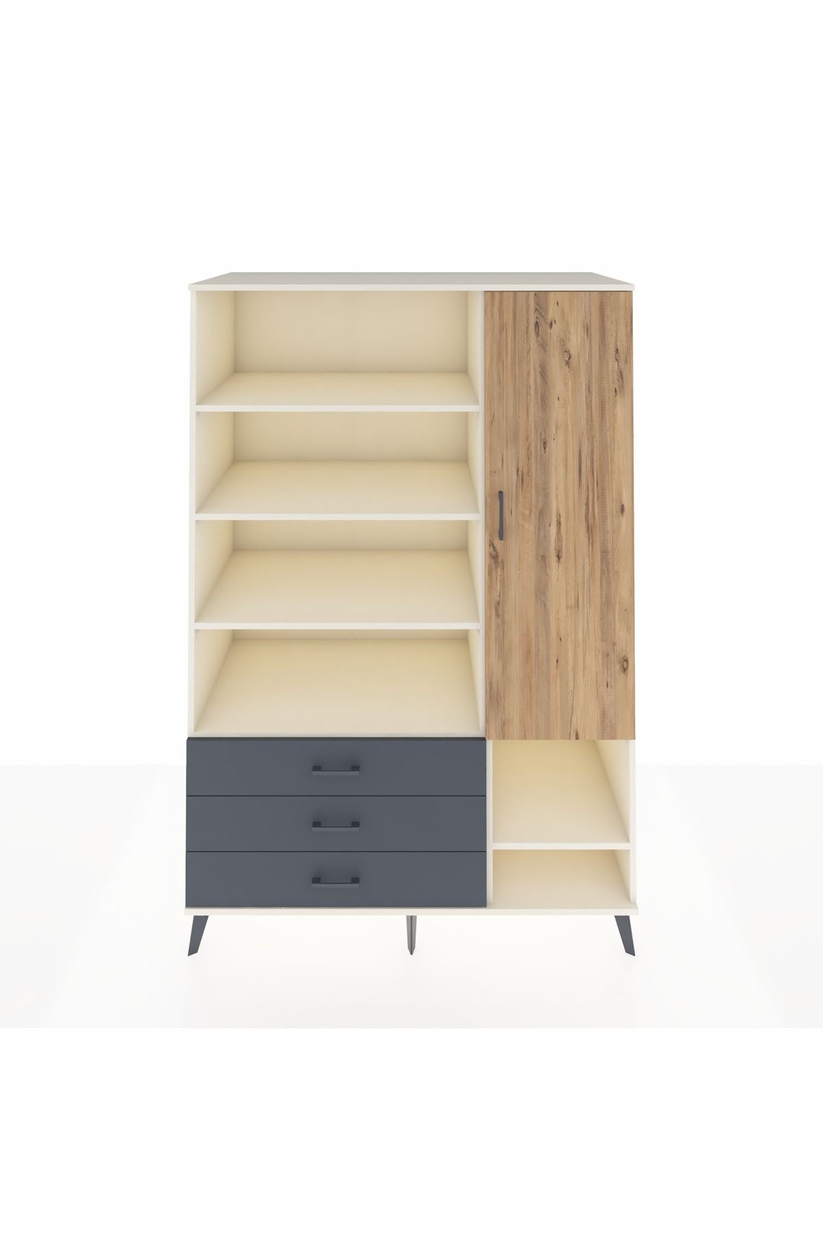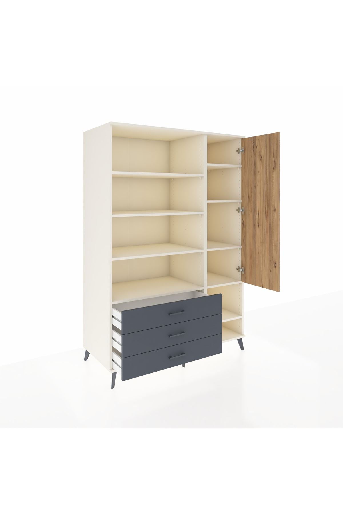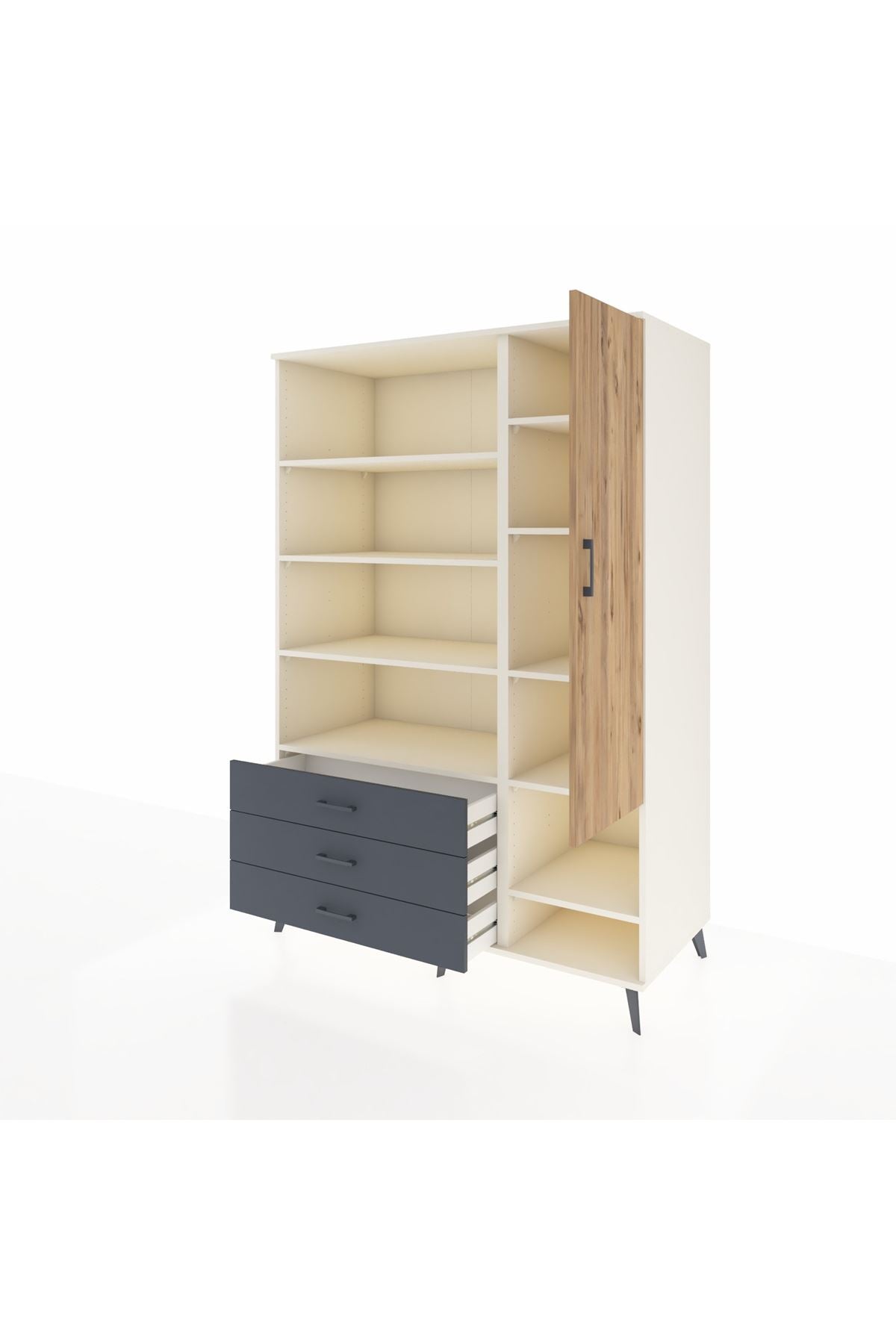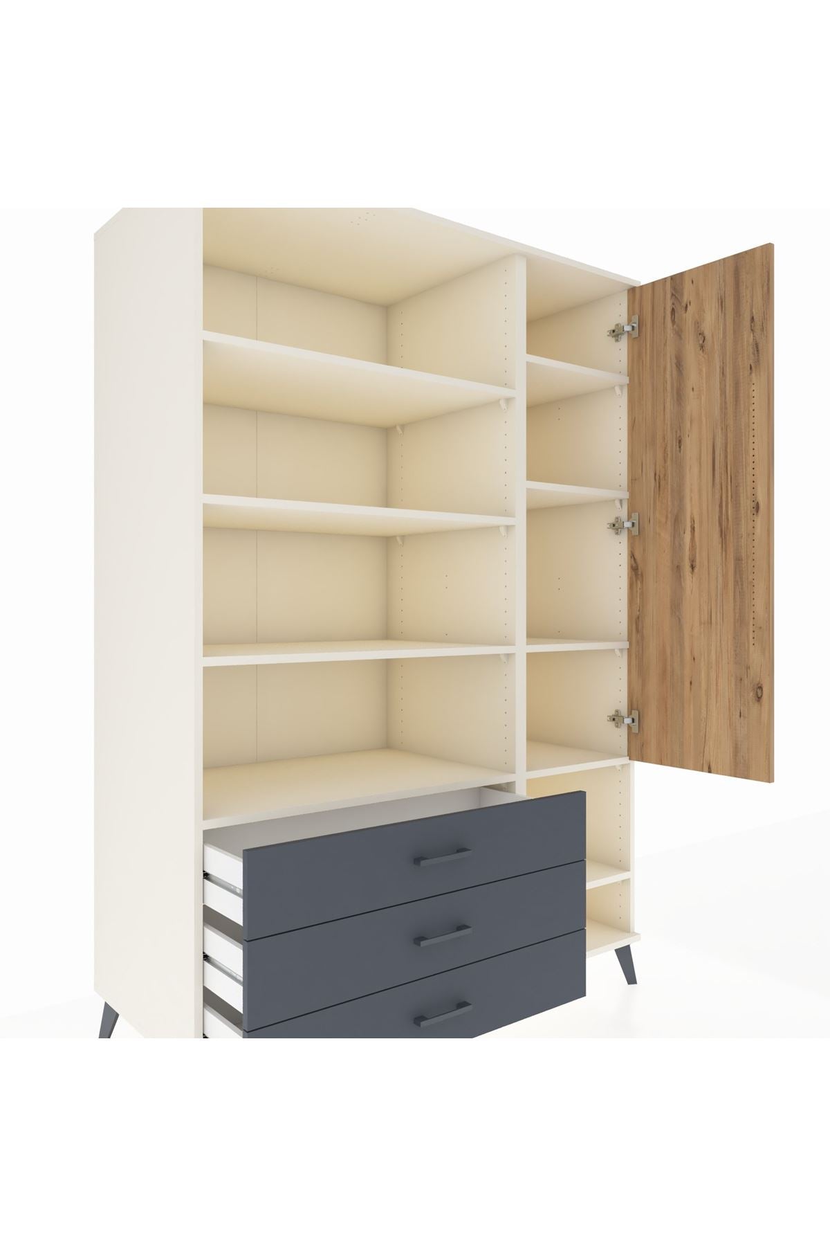 Bu dolap, yaşam alanlarınızda düzen ve kullanım kolaylığı sağlar. Aytaşı, Antrasit ve Atlas Çam seçenekleri ile farklı dekor stillerine kolaylıkla uyum gösterir; modern beyaz, derin gri ve doğal ahşap tonları kombinasyon imkanı sunar. Metal ayakları sağlam ve dayanıklı, metal kulplar uzun ömürlü kullanım sunar. 9 raflı düzeni ve tek kapaklı bölümüyle hem açık hem kapalı depolama alternatifleri sağlar; raflar ayarlanabilir yapıdadır, çekmece sayısı konfigüre edilebilir.