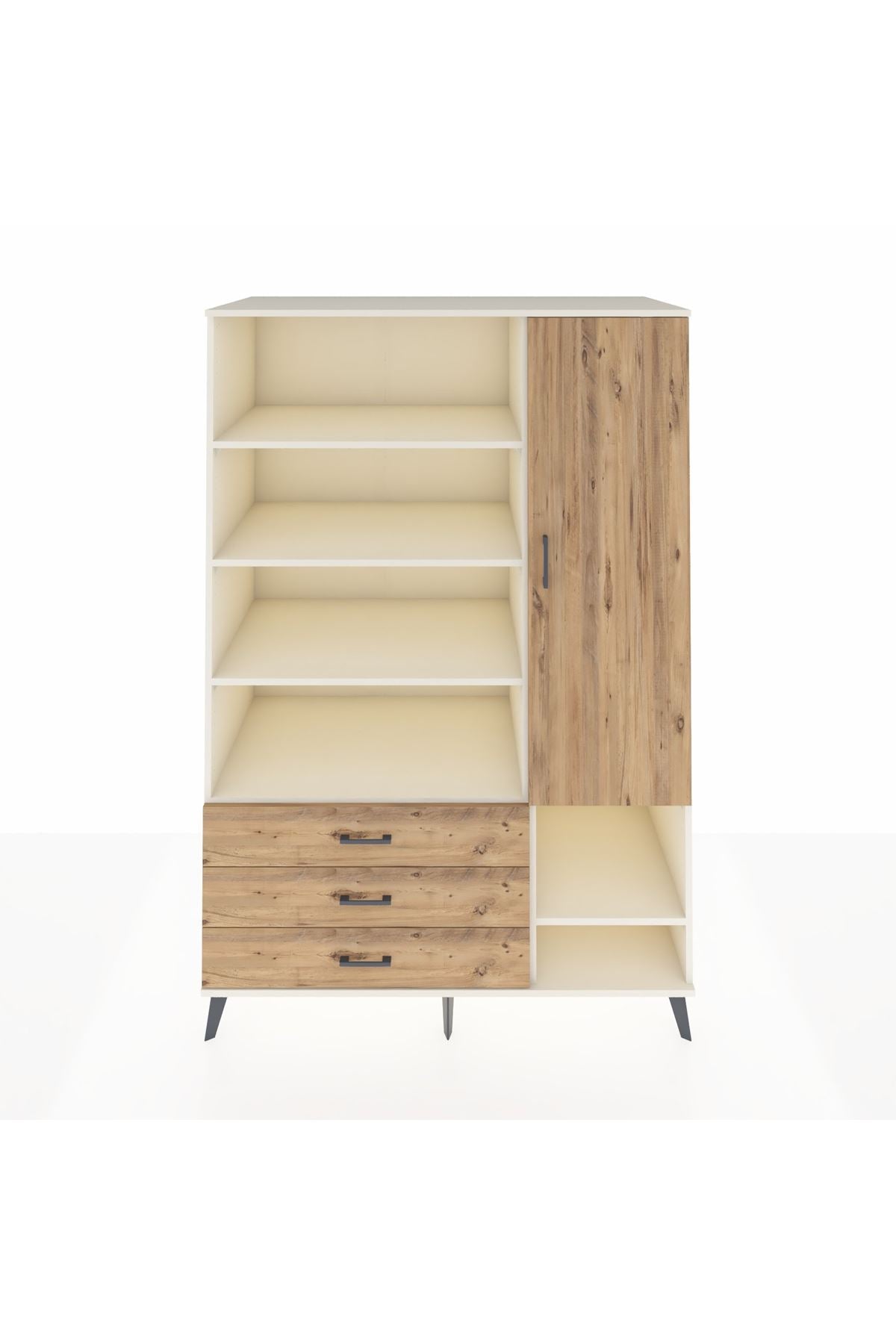 Bu dolap, evinizde düzen ve estetiği bir arada sunarak yaşam alanlarınızı verimli kullanmanıza yardımcı olur. Aytaşı seçeneği ferah ve modern beyaz tonuyla sade bir atmosfer yaratır, Atlas Çam doğal ahşap dokusuyla sıcak bir ambiyans sağlar; Antrasit ise mekâna güçlü ve şık bir karakter katar. Metal ayakları sağlam ve dayanıklı, metal kulplar uzun ömürlü kullanım sunar. İç bölümde yer alan 9 raf, kitaplardan dekoratif objelere, kutu ve dosyalara kadar farklı ebatlardaki eşyalarınızı sistemli şekilde saklamanıza imkân verir. Üç çekmece, küçük eşyalar ve tekstil ürünleri için düzen sağlar; isteğe bağlı olarak çekmece sayısı konfigüre edilebilir.