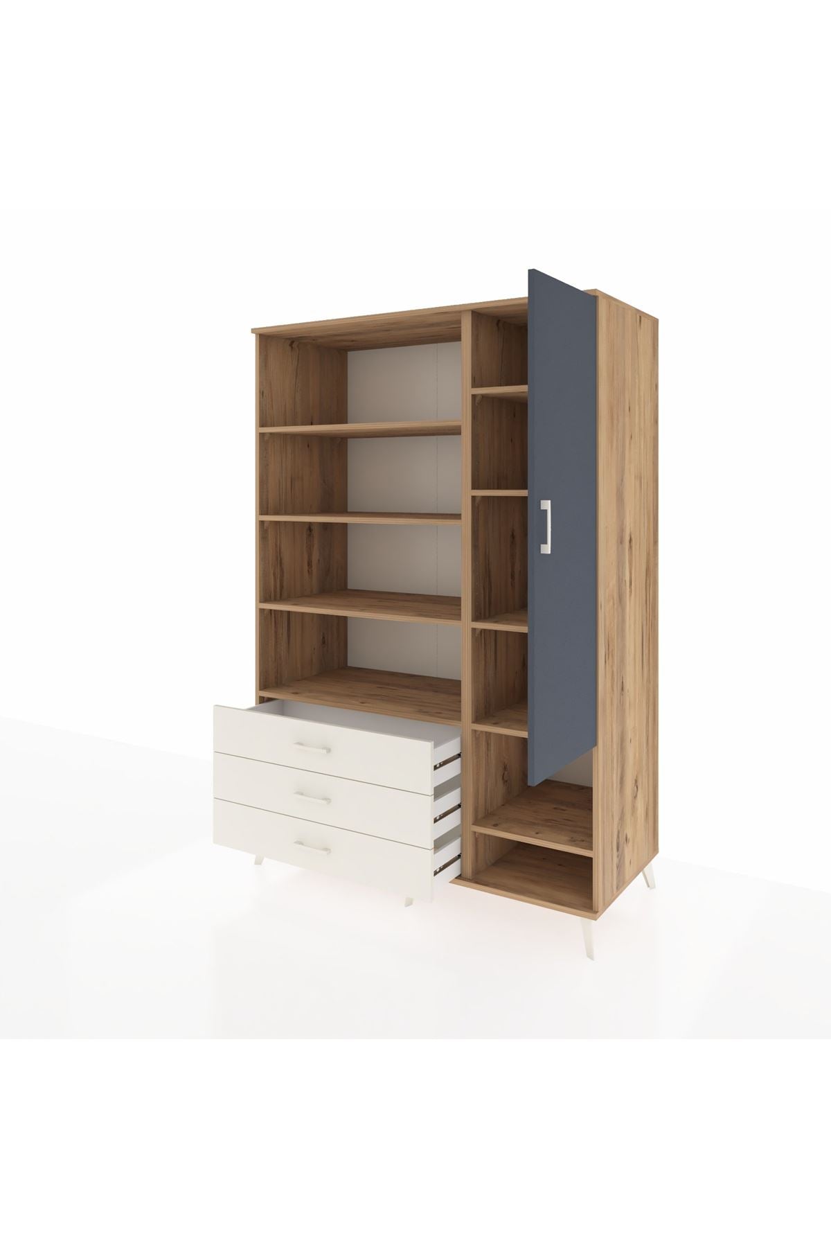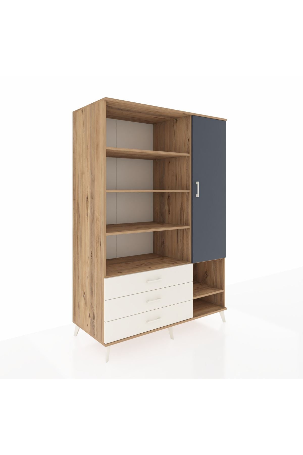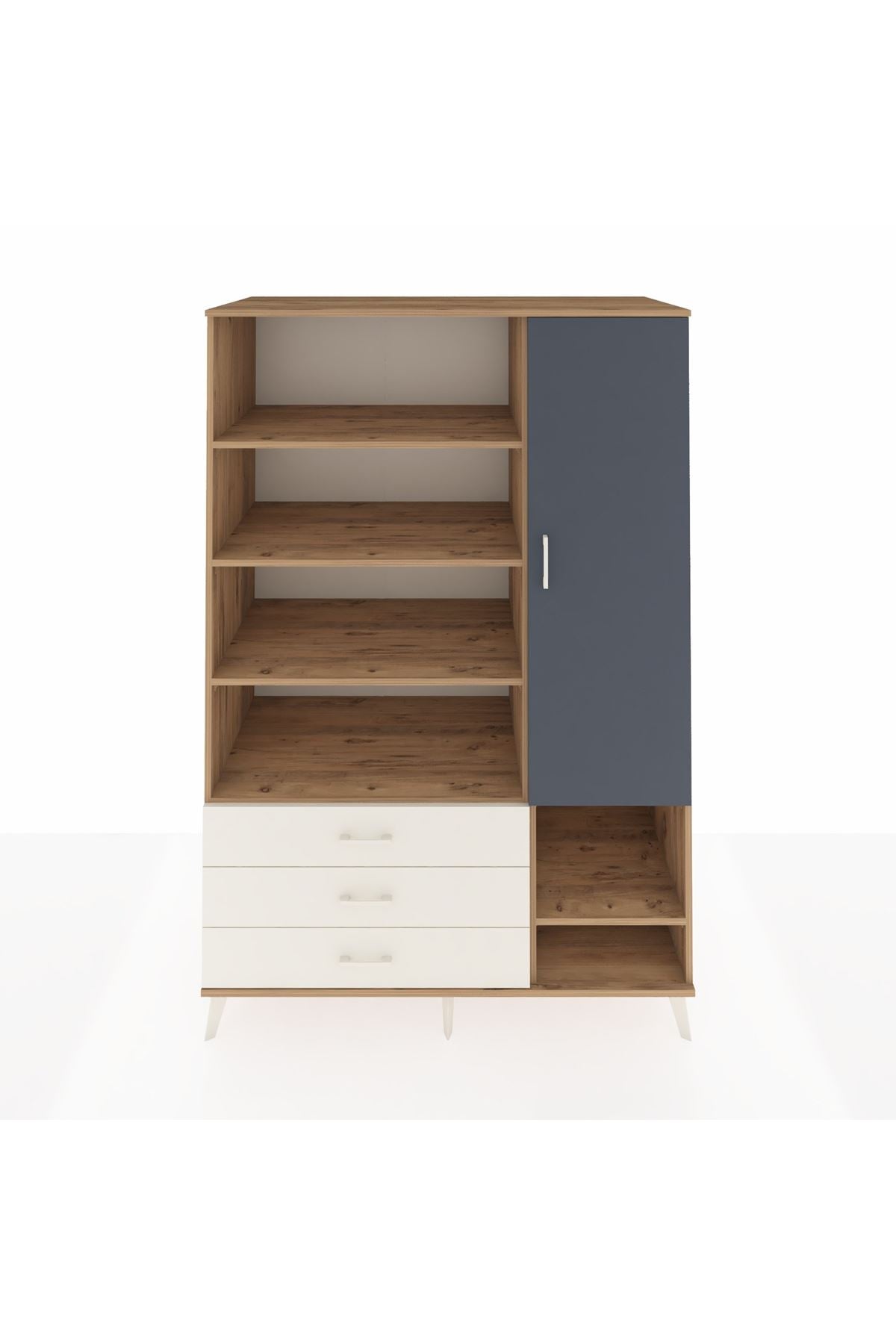 Geniş raf düzeni kitap, kutu veya dekoratif ürünler için esnek saklama imkanı verir. Raflar ayarlanabilir yapısıyla yüksek/ alçak eşyalar için hızlı uyarlama sunar. Üç çekmece sayesinde küçük eşyalar ve tekstiller kolayca sınıflandırılabilir; çekmece sayısı konfigüre edilebilir özelliğiyle ihtiyaçlarınıza göre düzen değiştirilebilir. Metal ayaklar nem ve darbelere karşı dayanıklıdır; suntalam yüzey kolay silinir ve uzun ömürlü kullanım sağlar.
