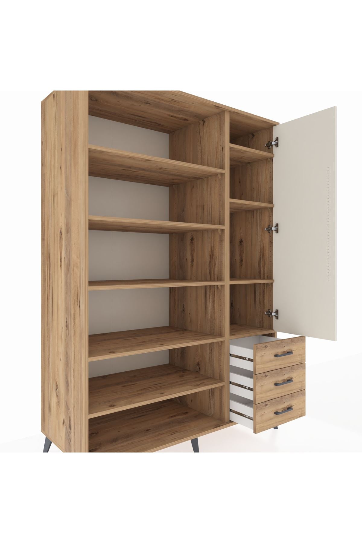 Kronos Dolap, geniş iç hacmi ve 9 adet raf yapısı sayesinde farklı ebatlardaki eşyaları düzenli şekilde saklamaya olanak tanır. Ayarlanabilir raf sistemleri sayesinde raf aralıkları değiştirilerek tabak, tencere, kitap veya dekoratif objeler için ideal düzenleme yapılabilir. 3 çekmeceli alt bölüm, küçük mutfak gereçleri, tekstil parçaları veya ofis malzemeleri için pratik erişim sağlar; çekmece sayısını yaşam alanınıza göre konfigüre edebilirsiniz. Dayanıklı suntalam yüzey çizilmelere karşı dirençli olup uzun ömürlü kullanım sunar.