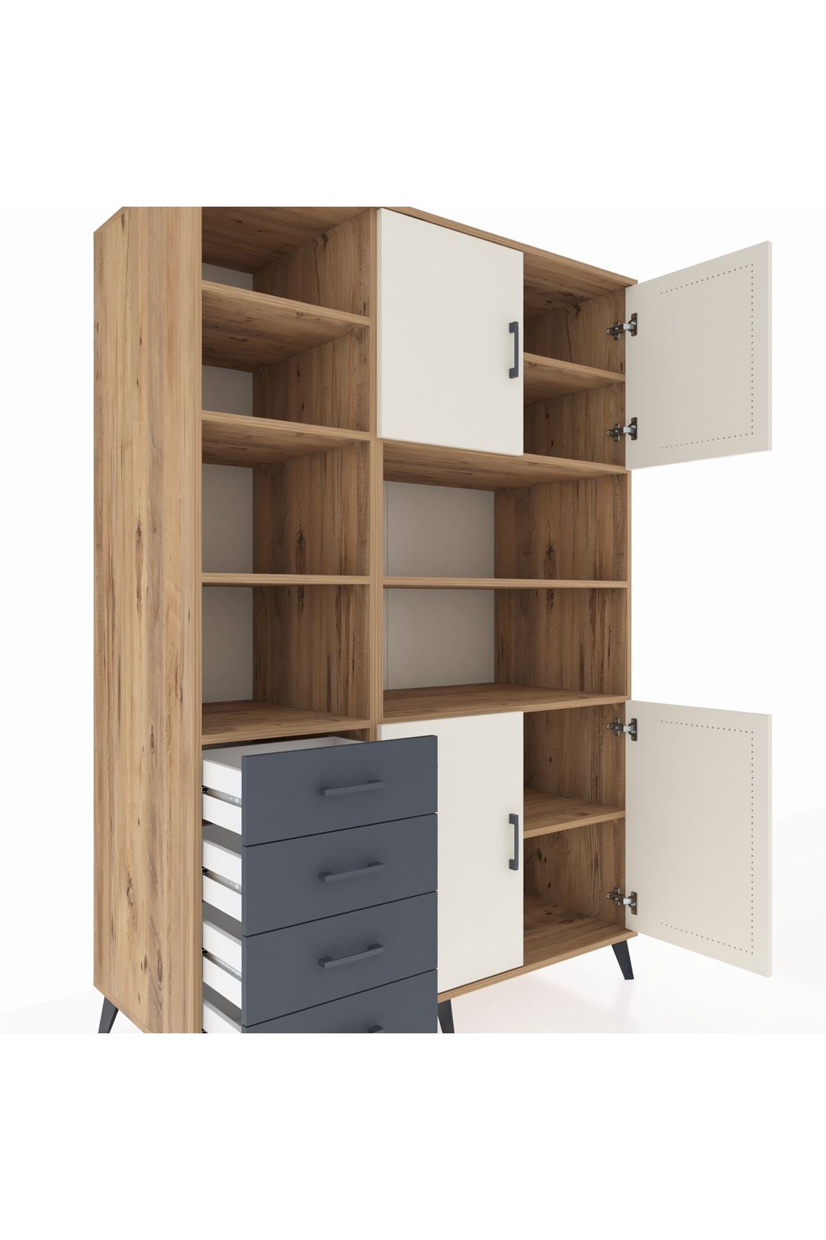 9 rafı ile dilediğiniz eşyaları kolayca yerleştirebilir, 4 geniş çekmece sayesinde küçük aksesuarları düzenli tutabilirsiniz 🗄️ 4 kapaklı bölümü ise hacimli eşyalarınızı tozdan koruyacak şekilde tasarlandı 🛡️ Modern çam-aytaşı ve antrasit renk kombinasyonu, dekorasyonunuza sıcak ve modern bir hava katıyor 🎨