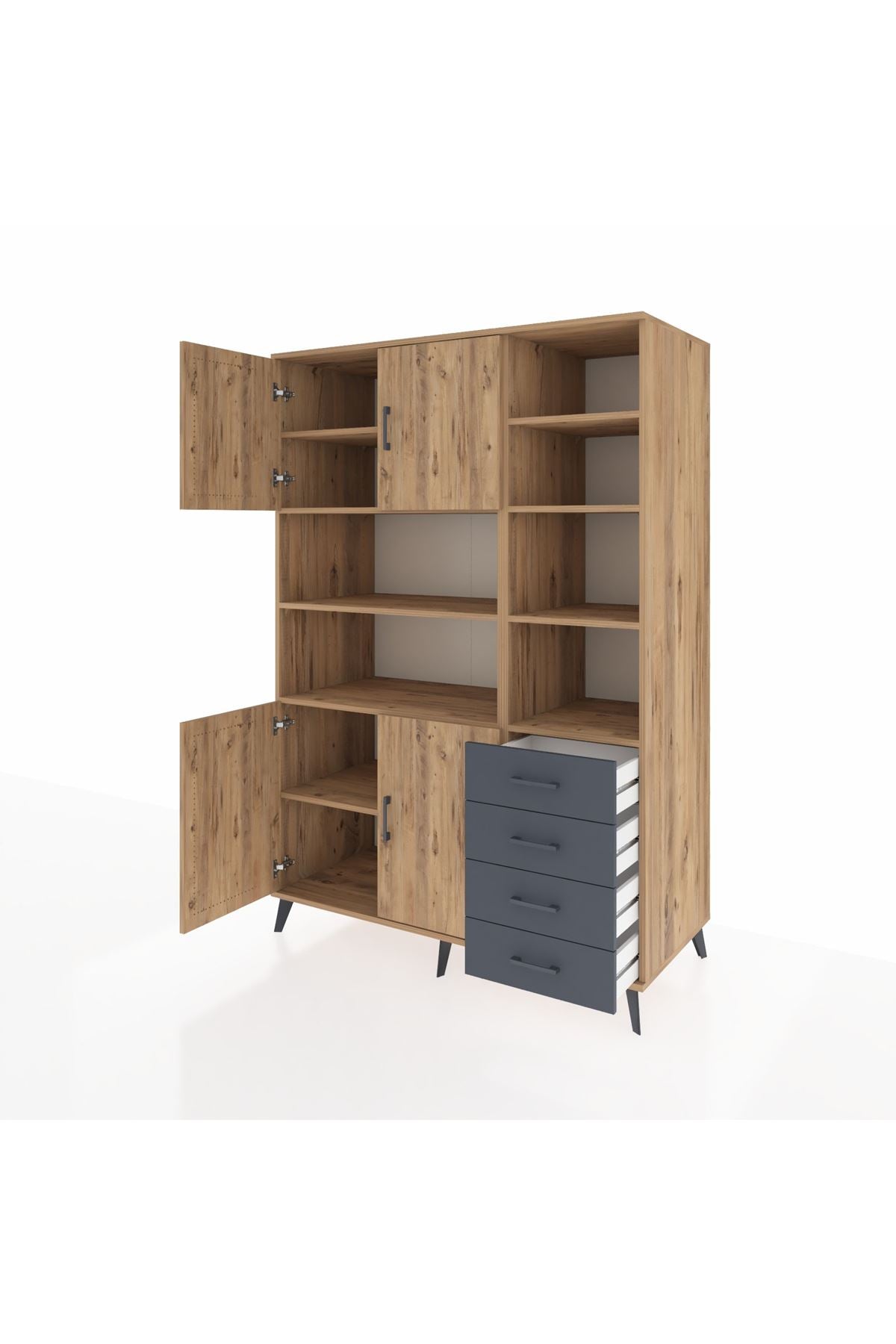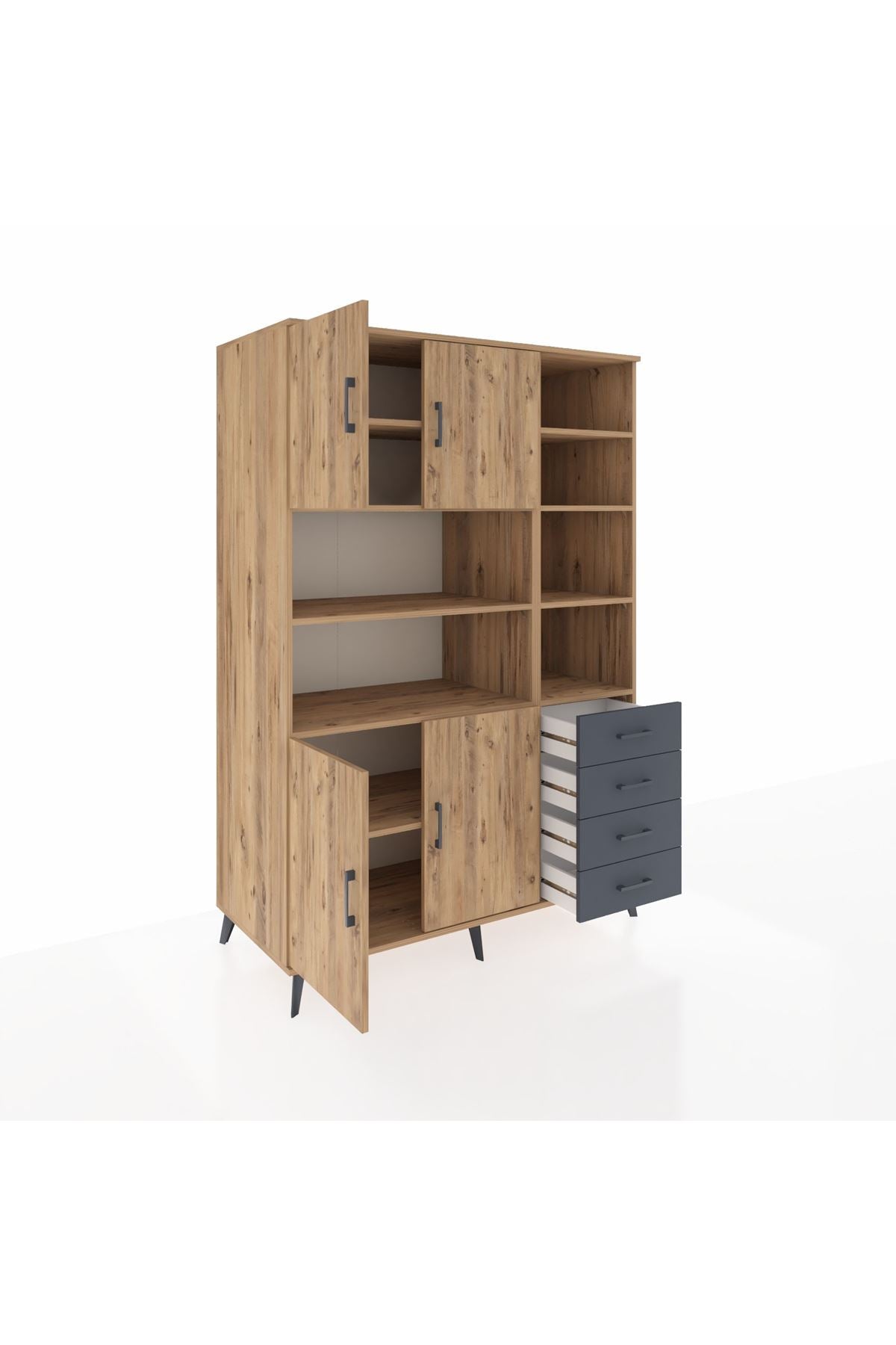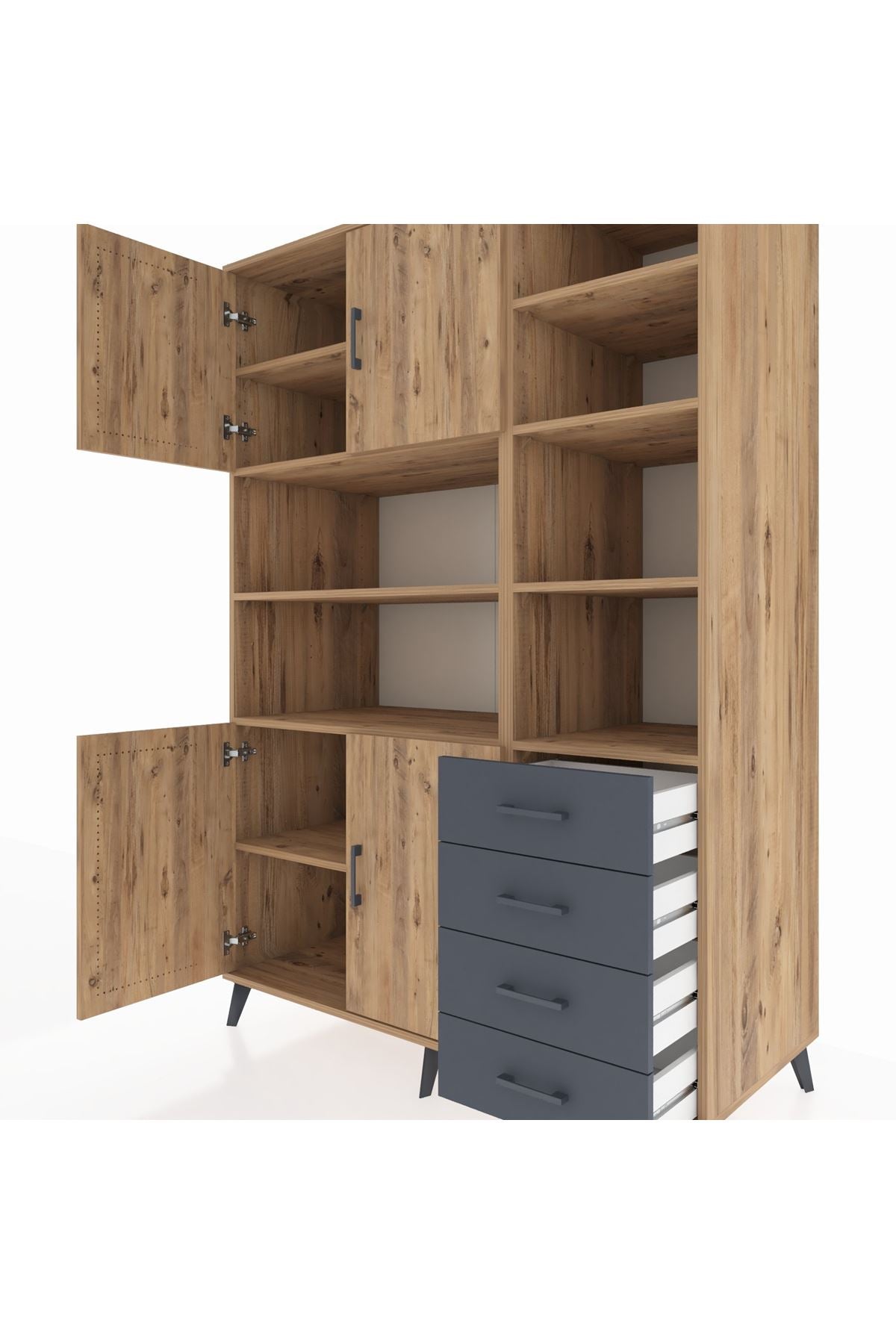 Kronos Dolap 9 Raflı 4 Çekmeceli 4 Kapaklı 132x59x195 Çam-Çam/Antrasit