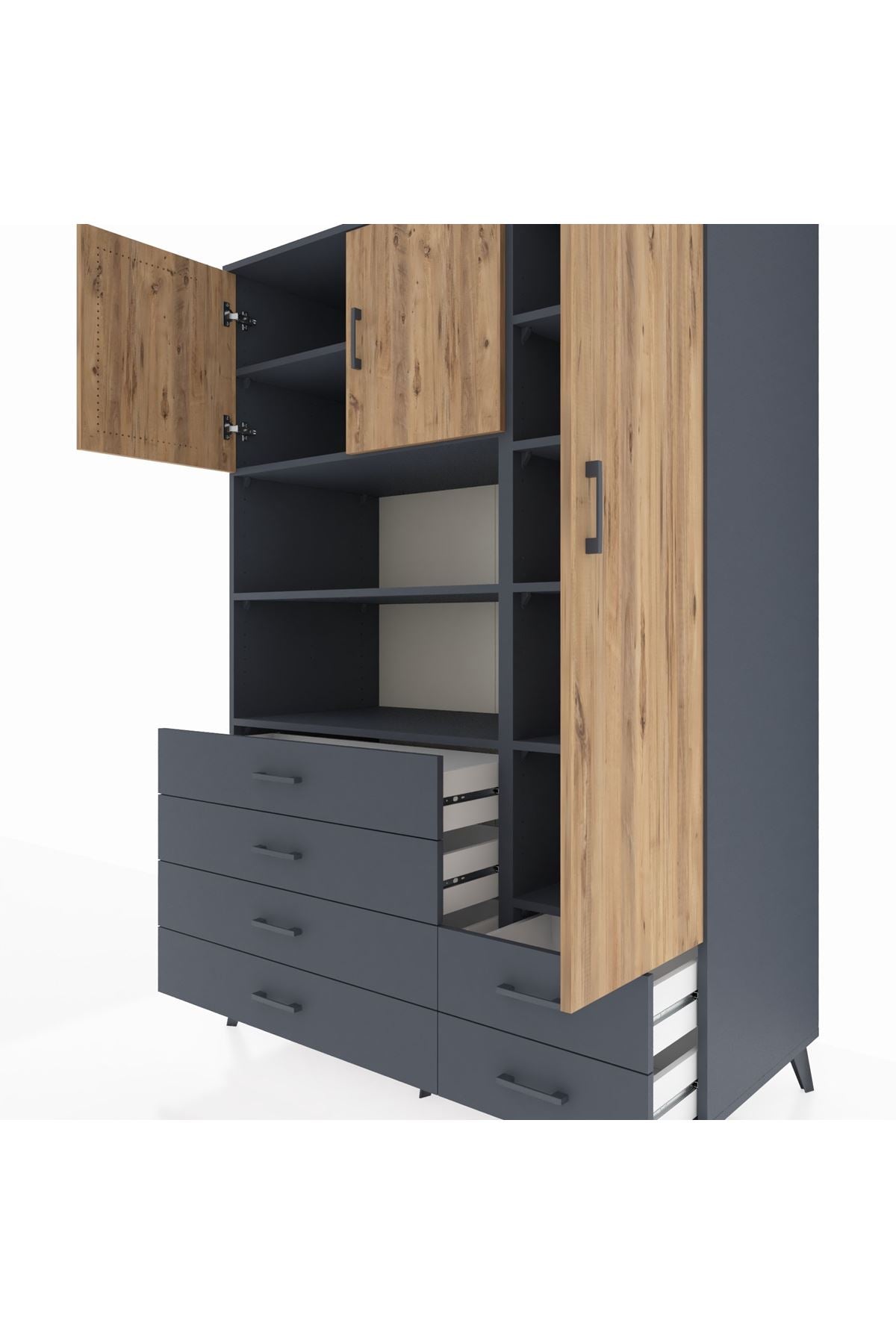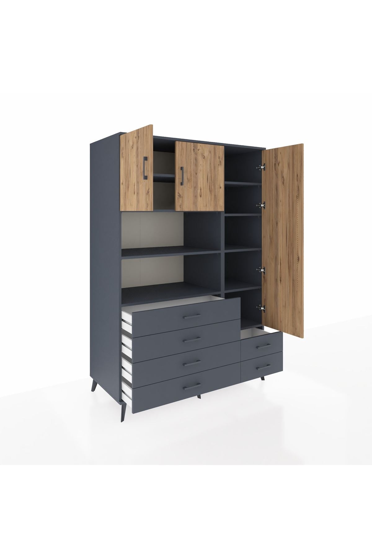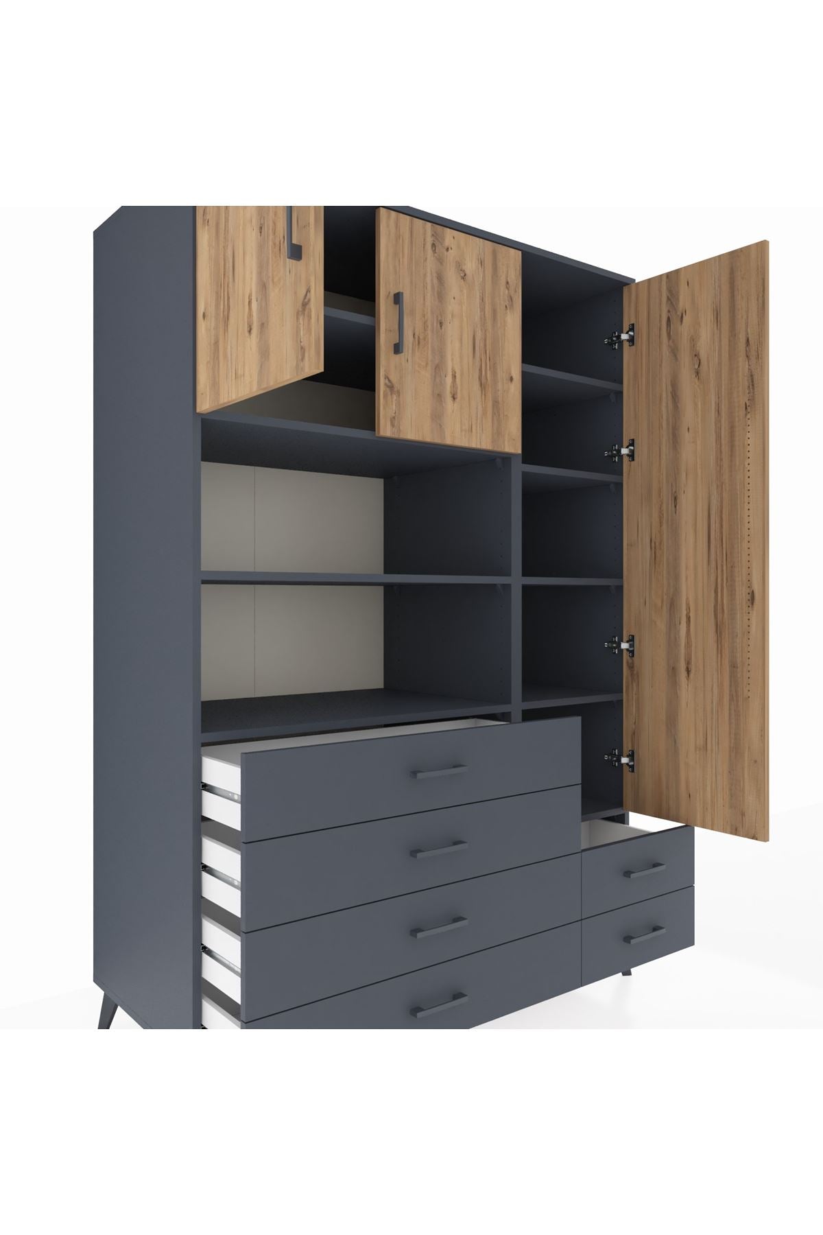 Kronos Dolap 9 Raflı 6 Çekmeceli 3 Kapaklı 132x59x195 Antrasit-Çam/Antrasit