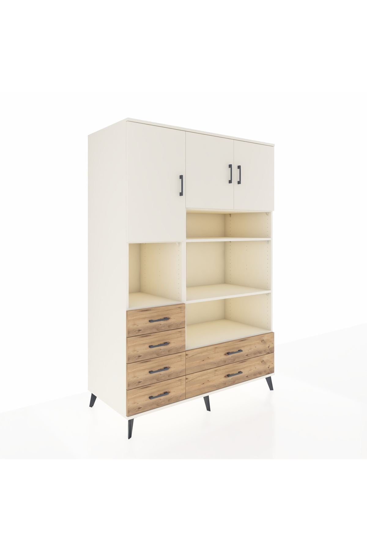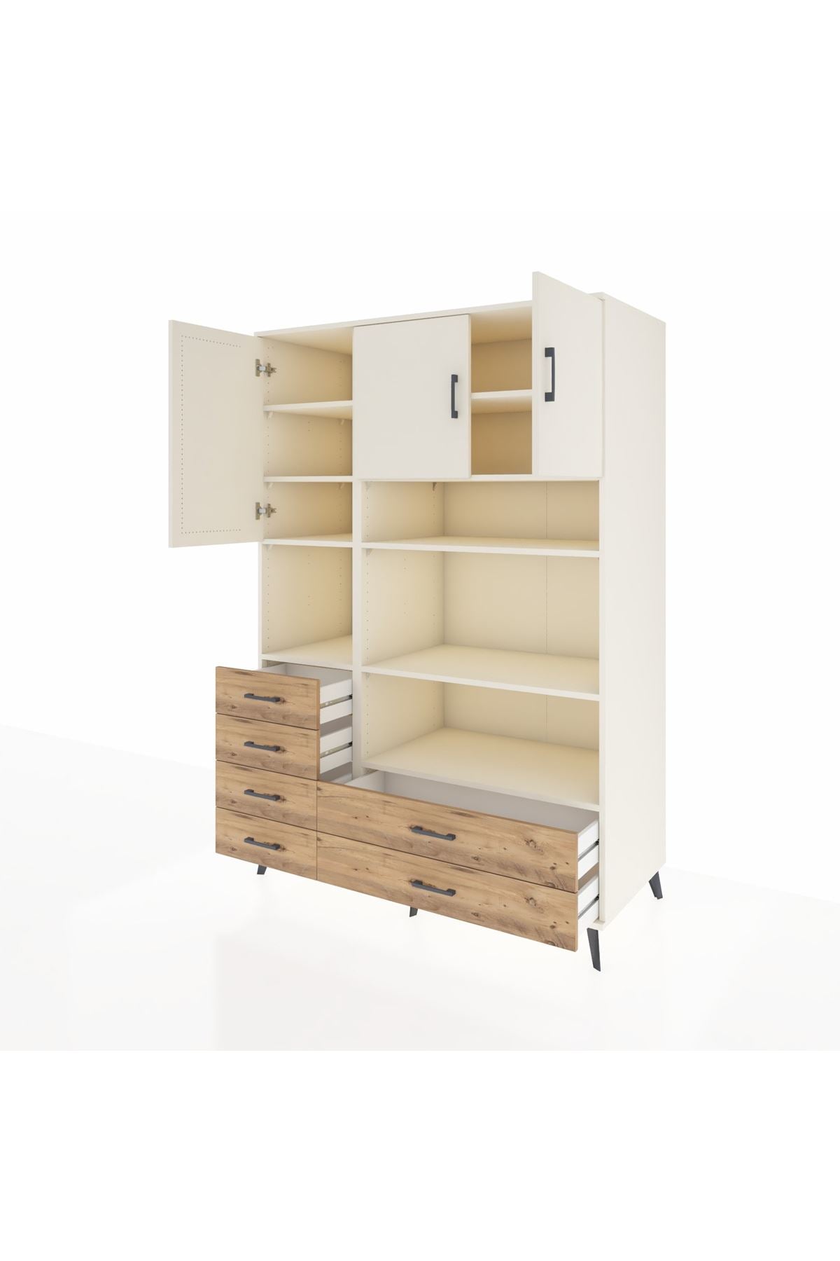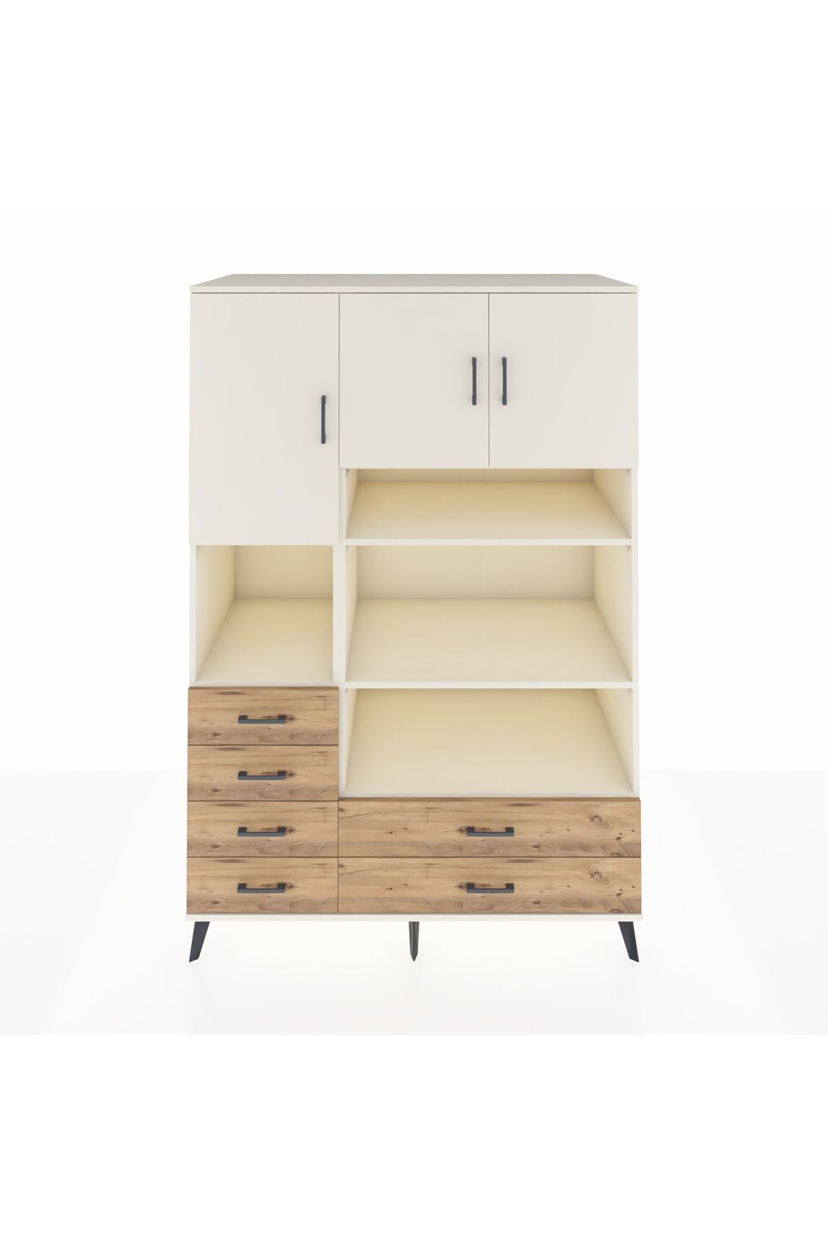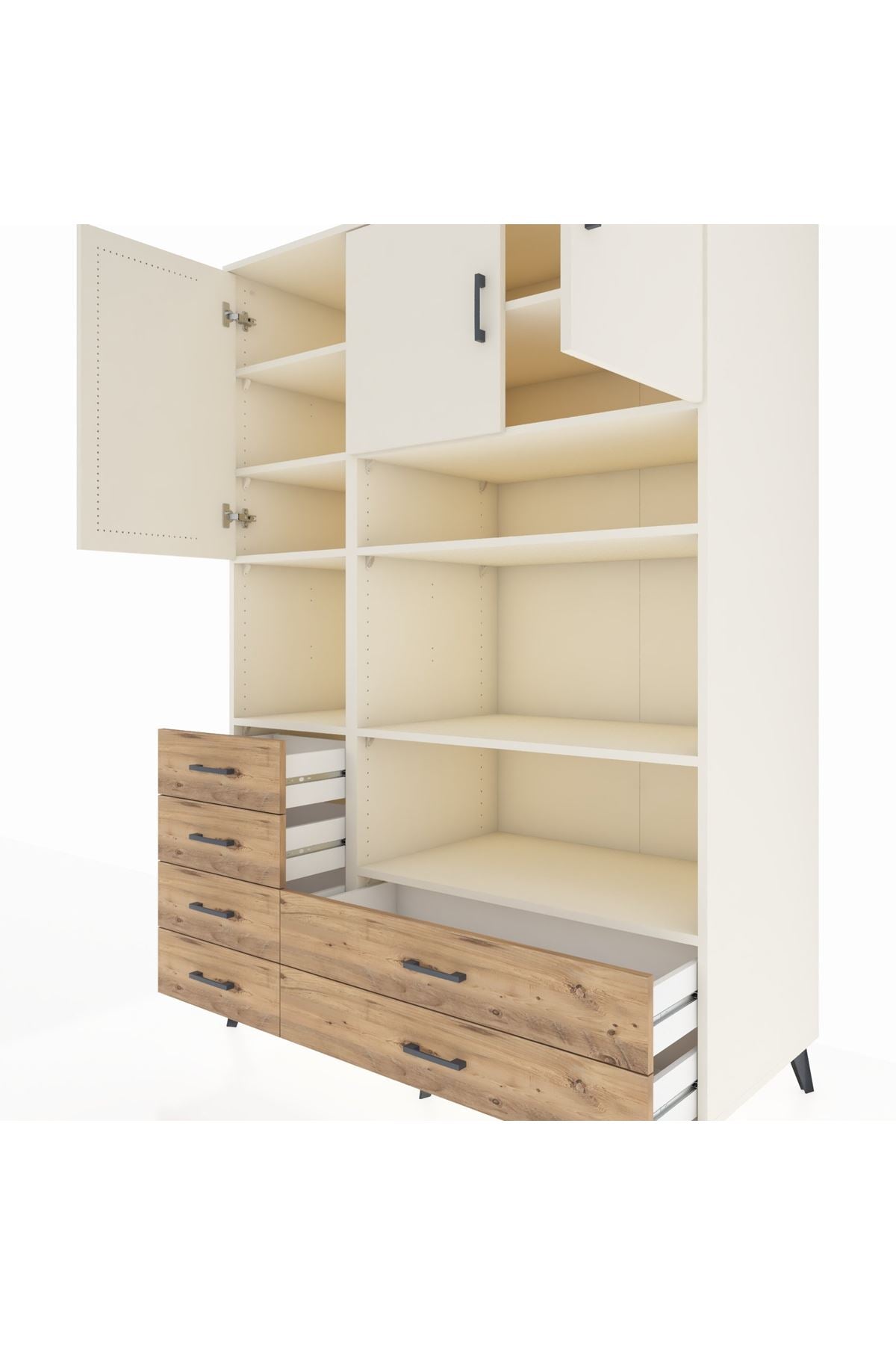 Geniş iç hacmiyle 9 raf, 6 çekmece ve 3 kapaklı tasarımı sayesinde hem ev hem de ofis kullanımına uygundur 132 cm genişliği, 59 cm derinliği ve 195 cm yüksekliğiyle giysi, ev tekstili, dosya veya günlük eşyalarınızı düzenlemenin en akıllı yolu 🌟