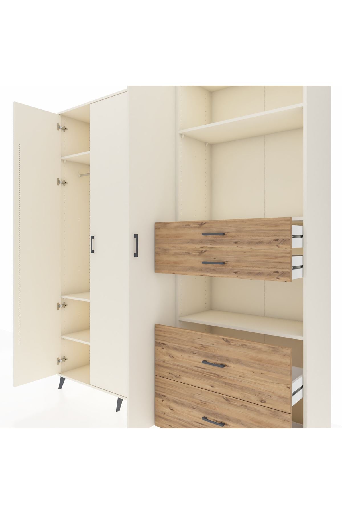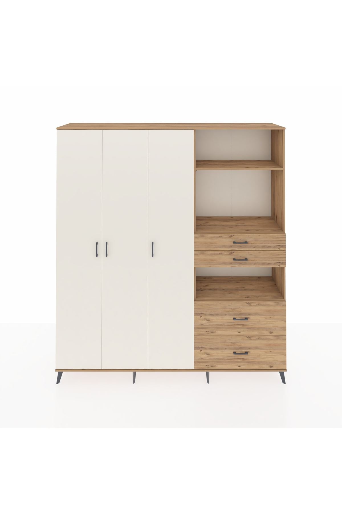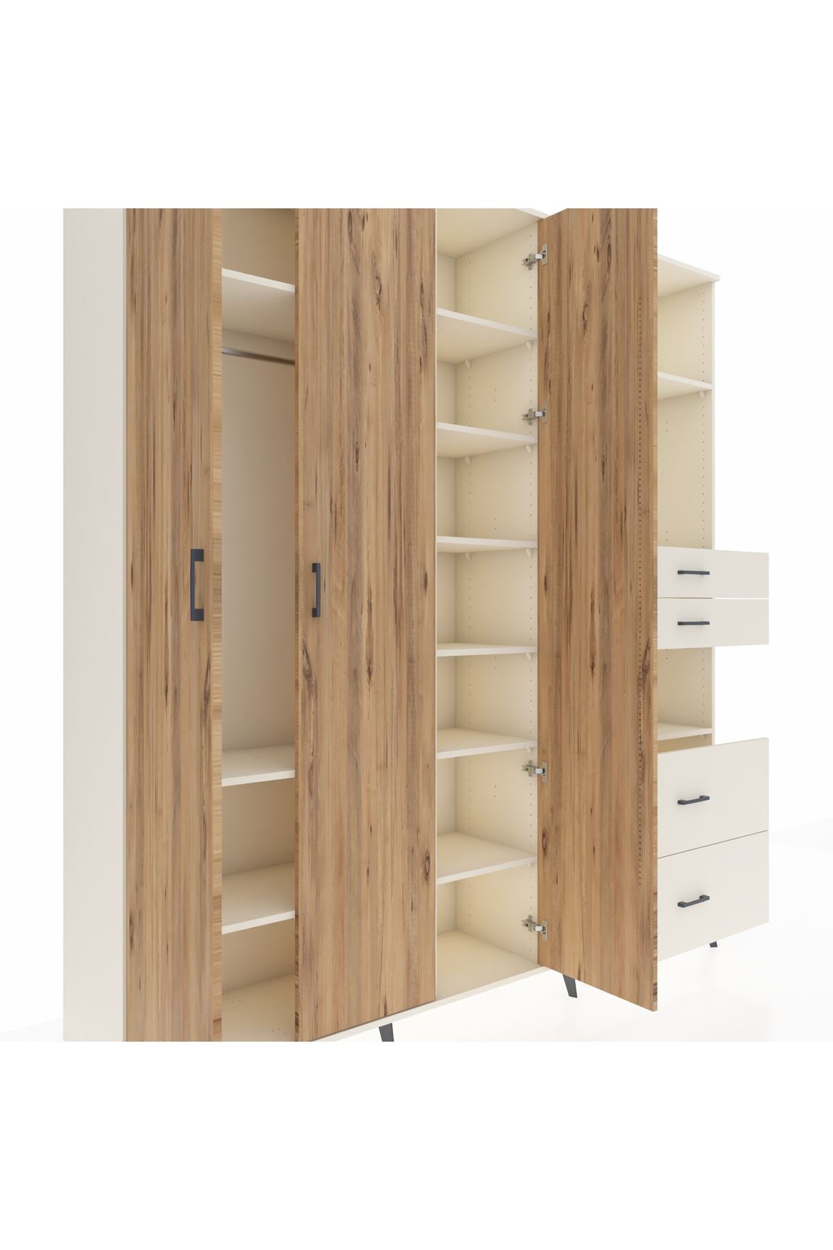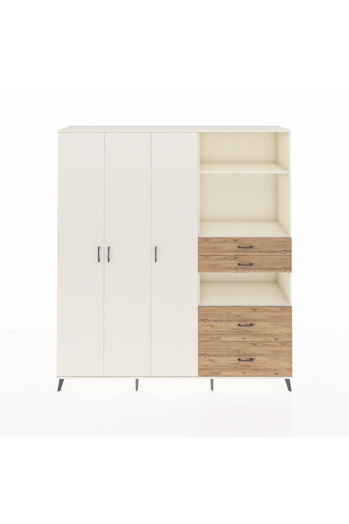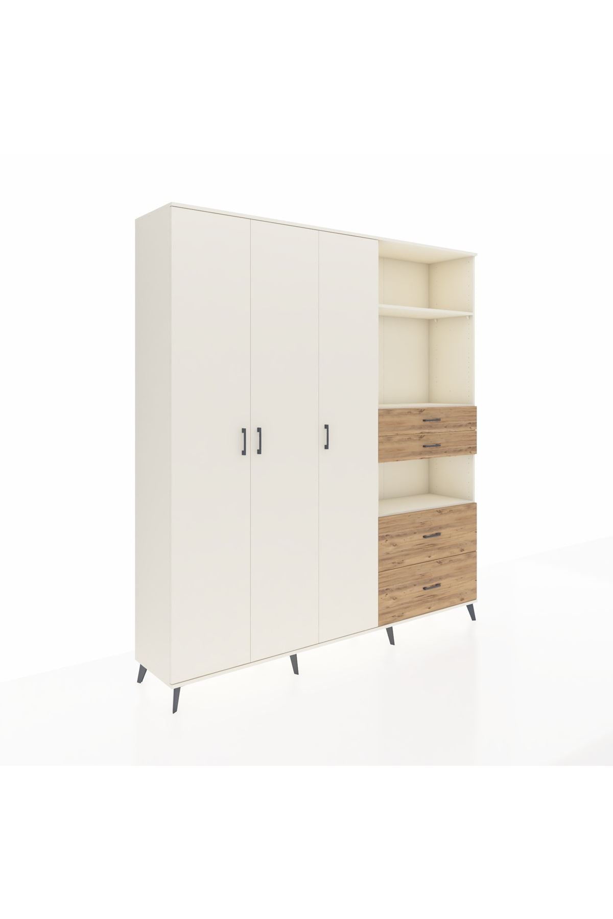 🦾 Dolabımızın metal ayakları, hem modern bir görünüm sağlar hem de sağlam bir zemin oluşturur. Metal kulplar ise dolabın şıklığını tamamlar ve kolay kullanım imkanı sunar.