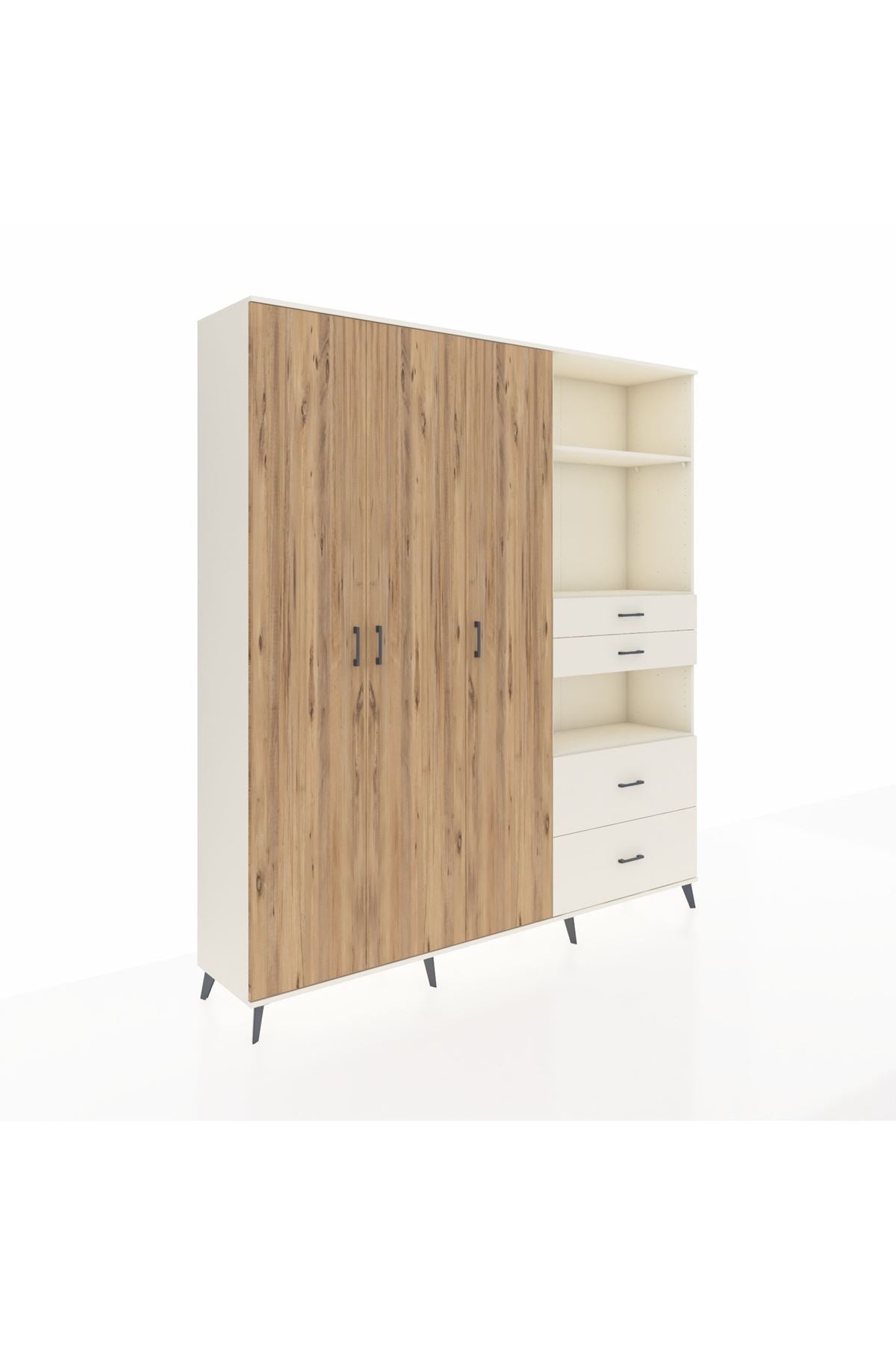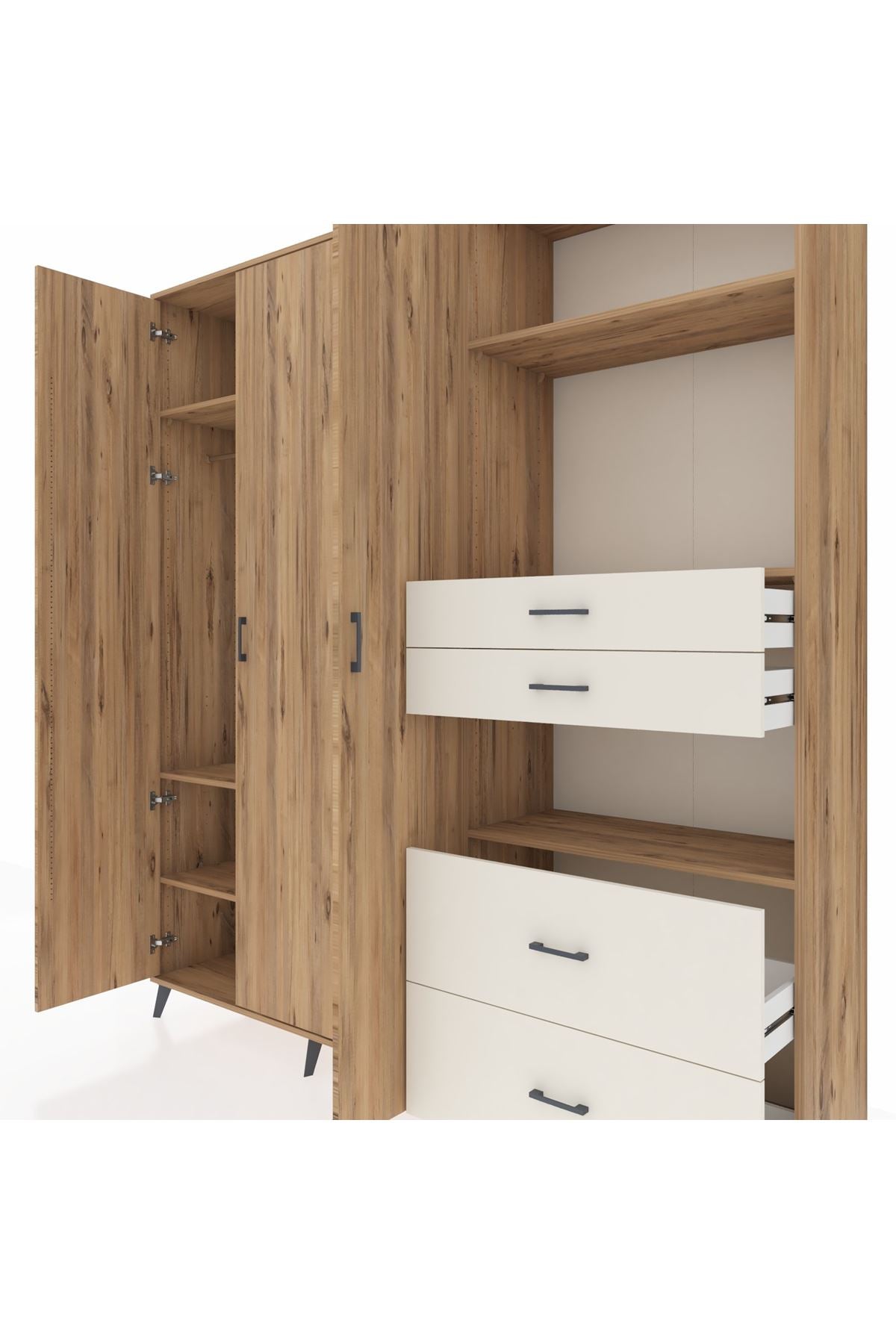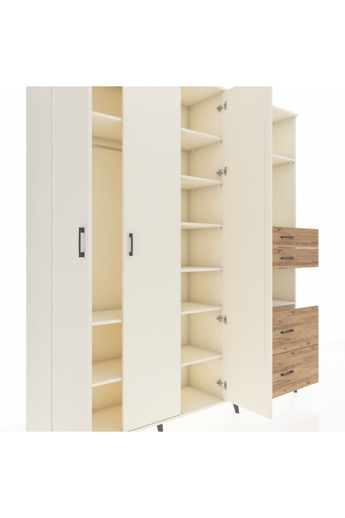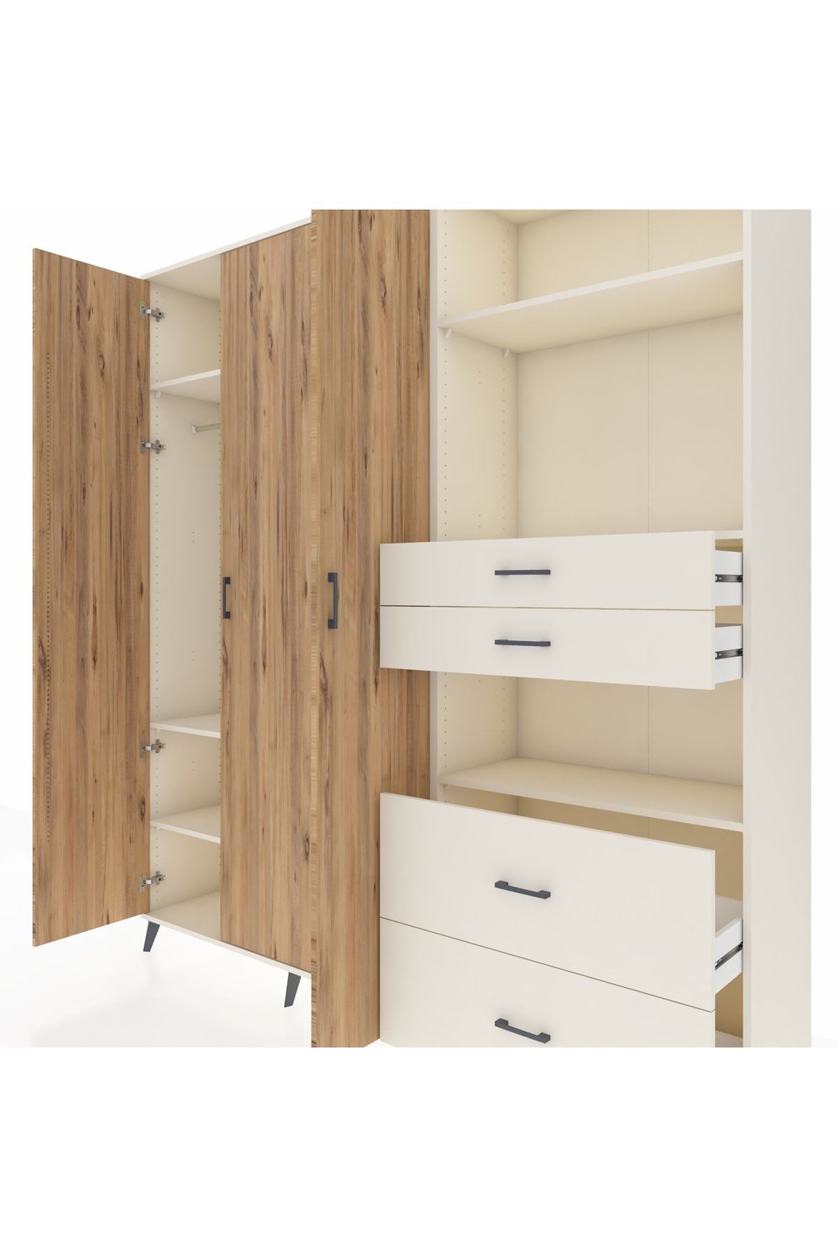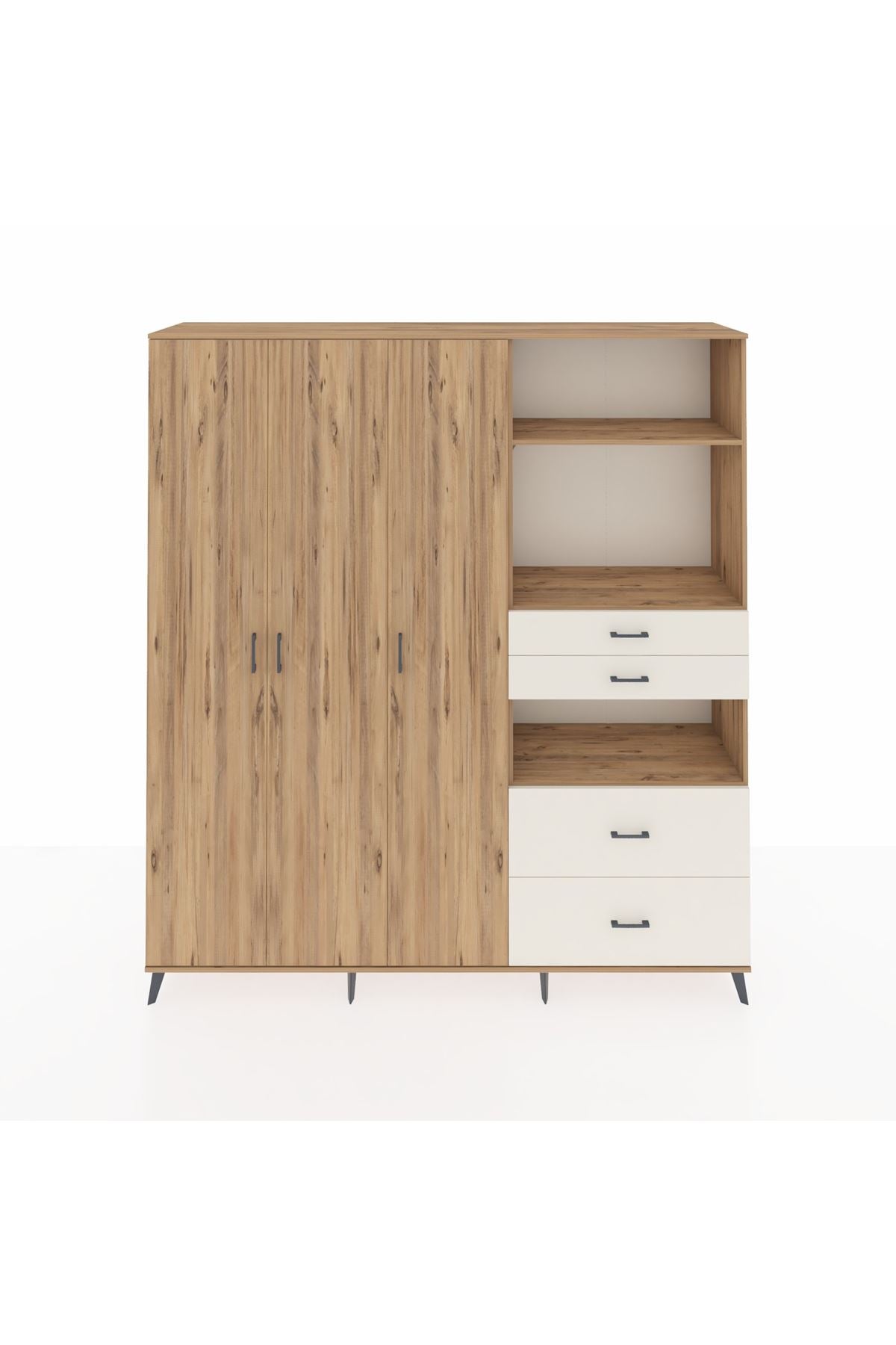🦾 Dolabımızın metal ayakları, hem modern bir görünüm sağlar hem de sağlam bir zemin oluşturur. Metal kulplar ise dolabın şıklığını tamamlar ve kolay kullanım imkanı sunar.