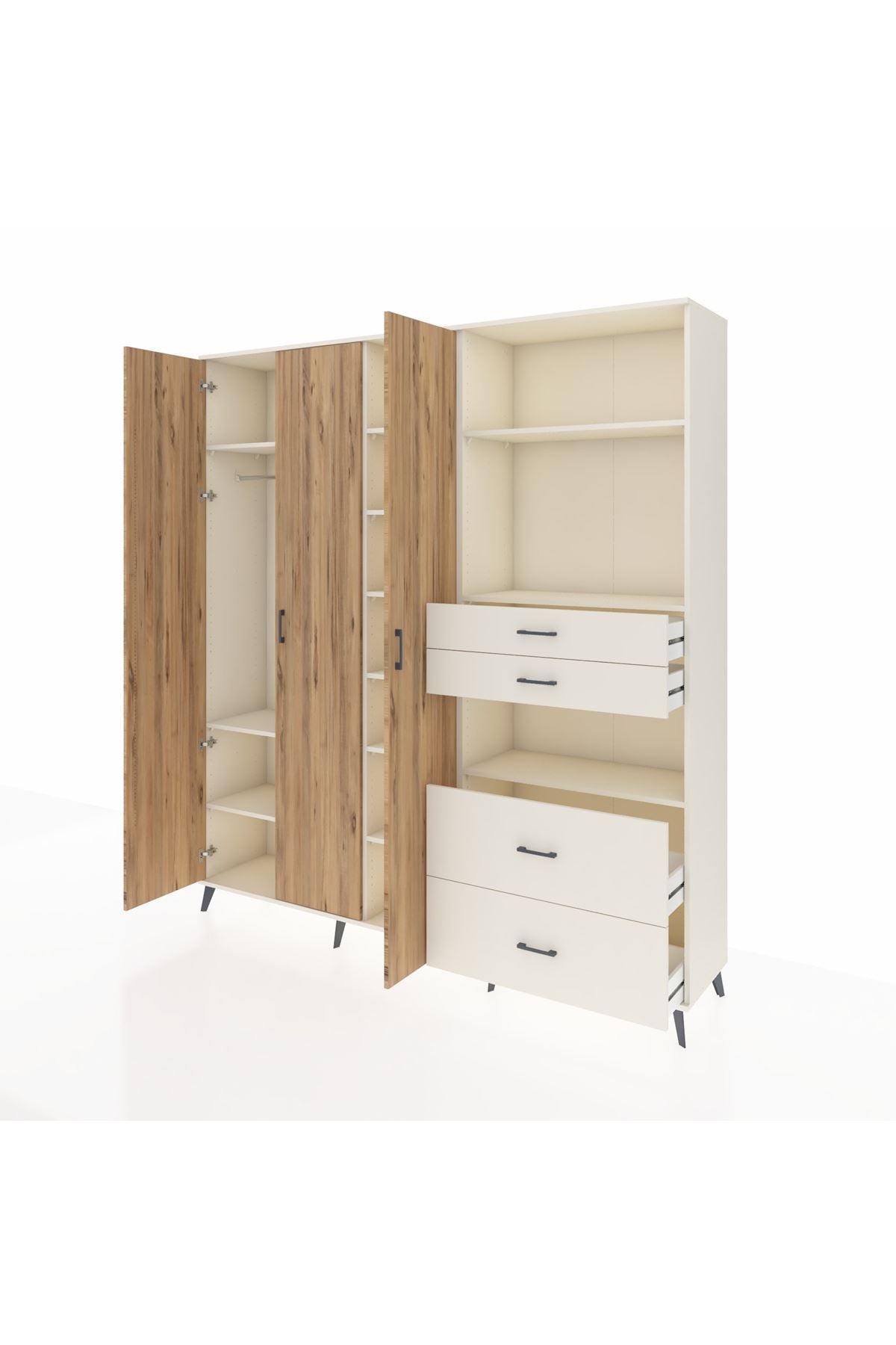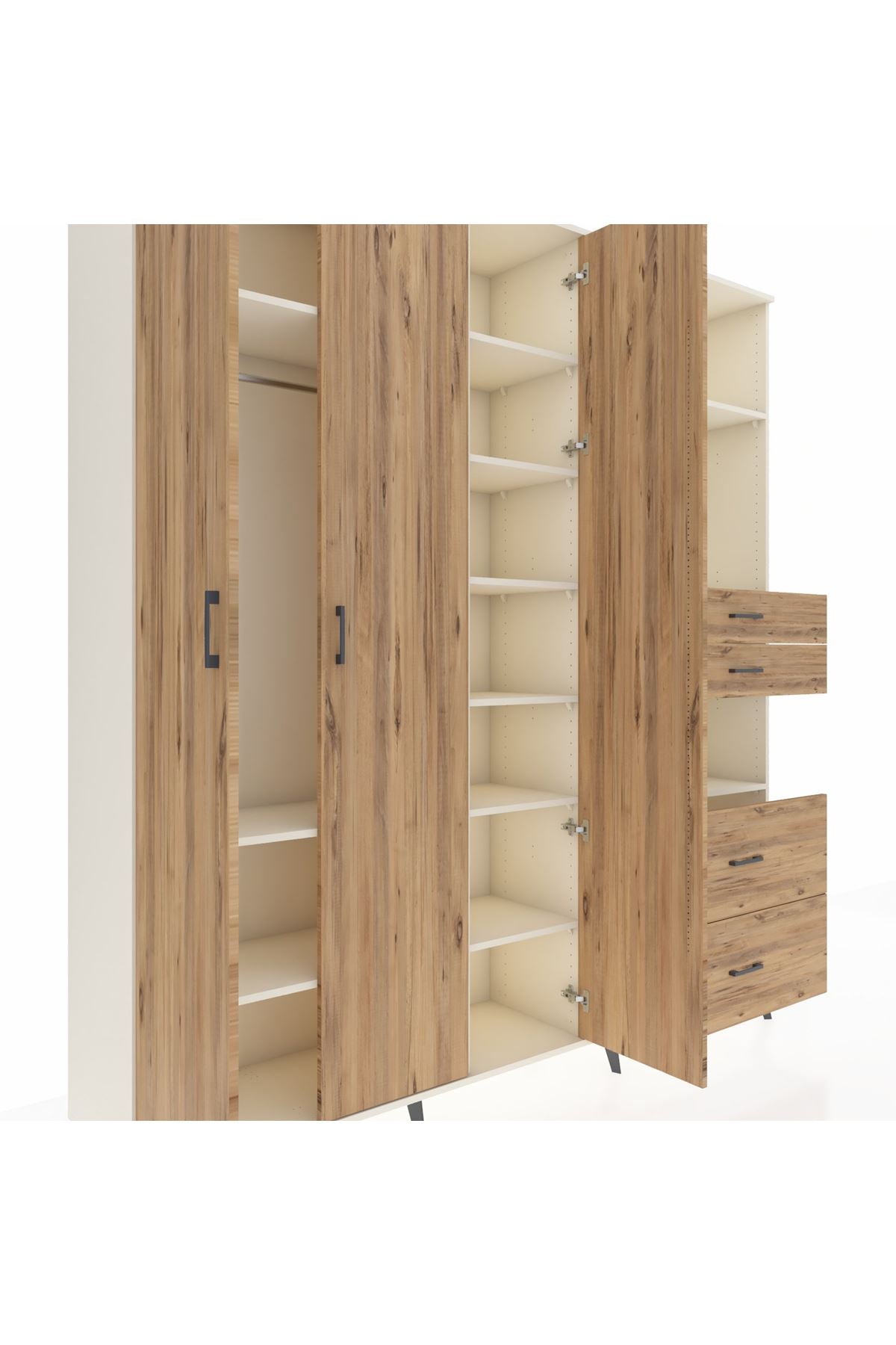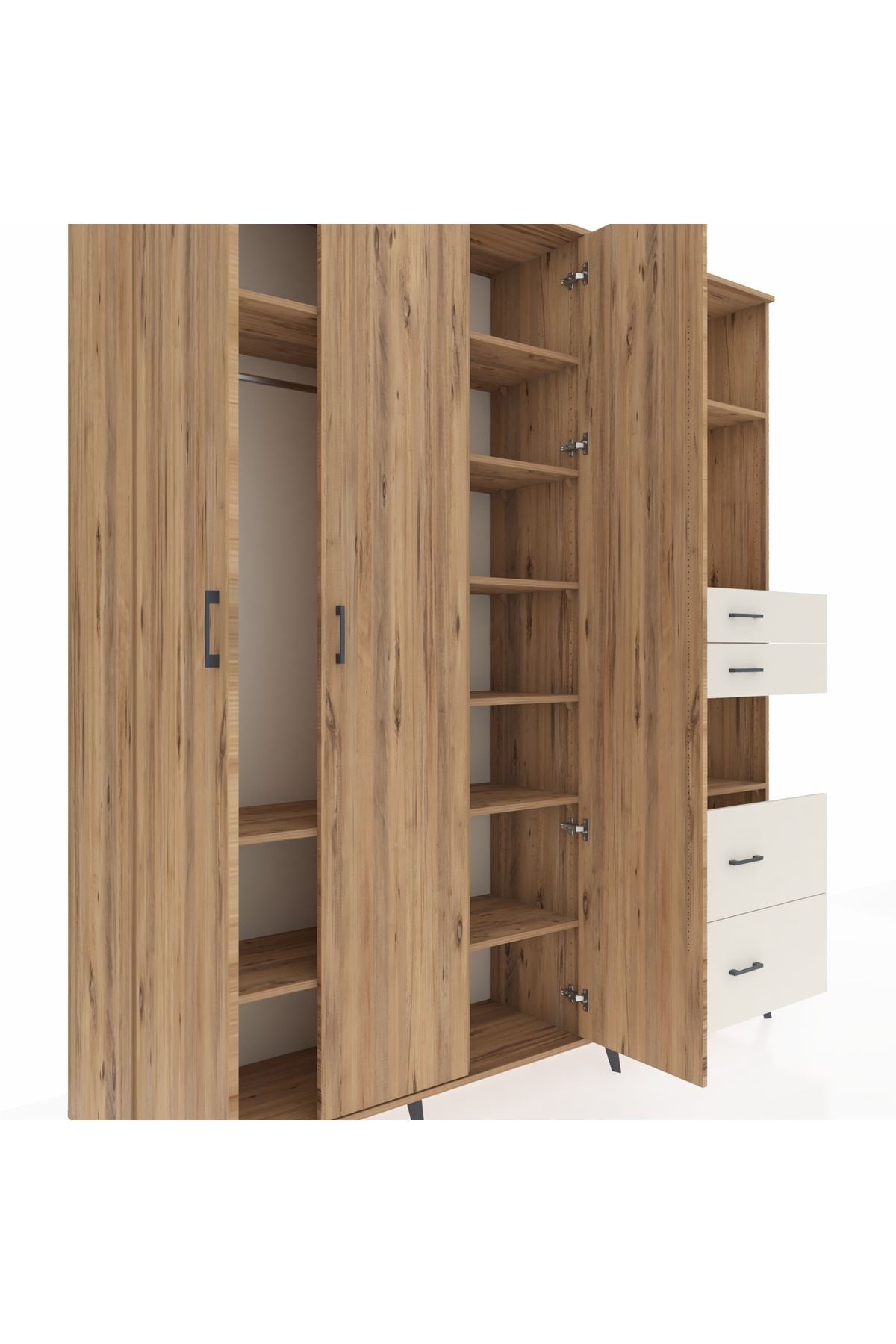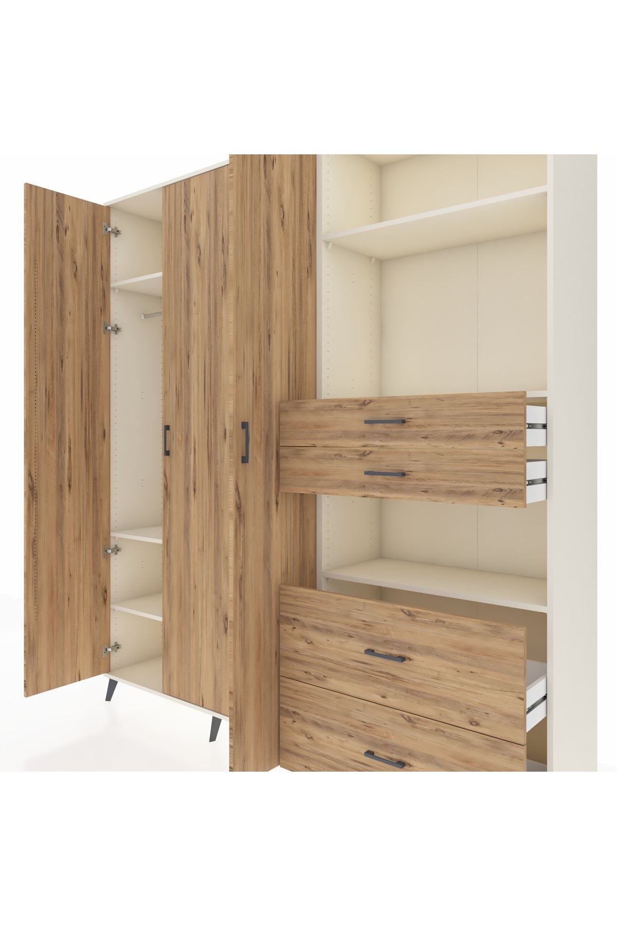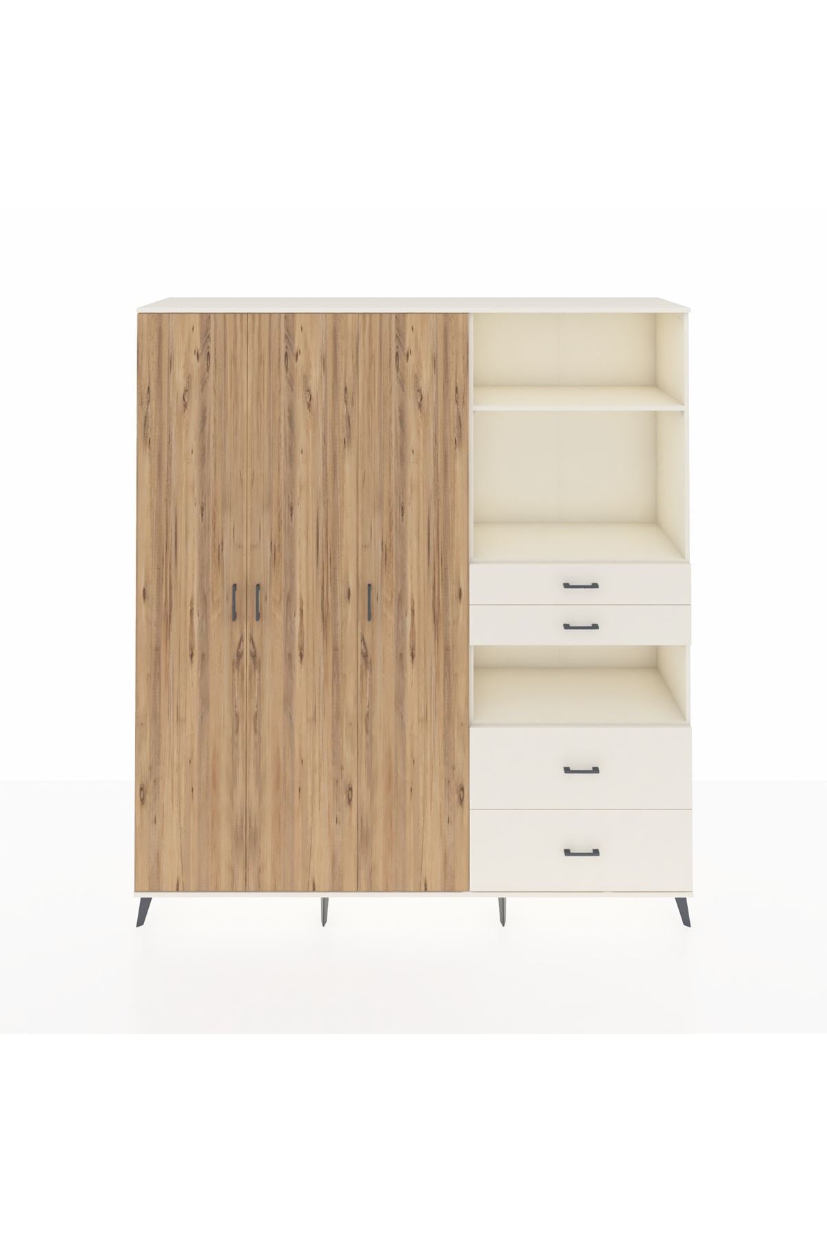 🦾 Dolabımızın metal ayakları, hem modern bir görünüm sağlar hem de sağlam bir zemin oluşturur. Metal kulplar ise dolabın şıklığını tamamlar ve kolay kullanım imkanı sunar.