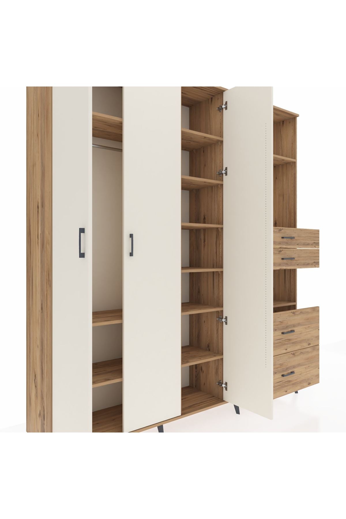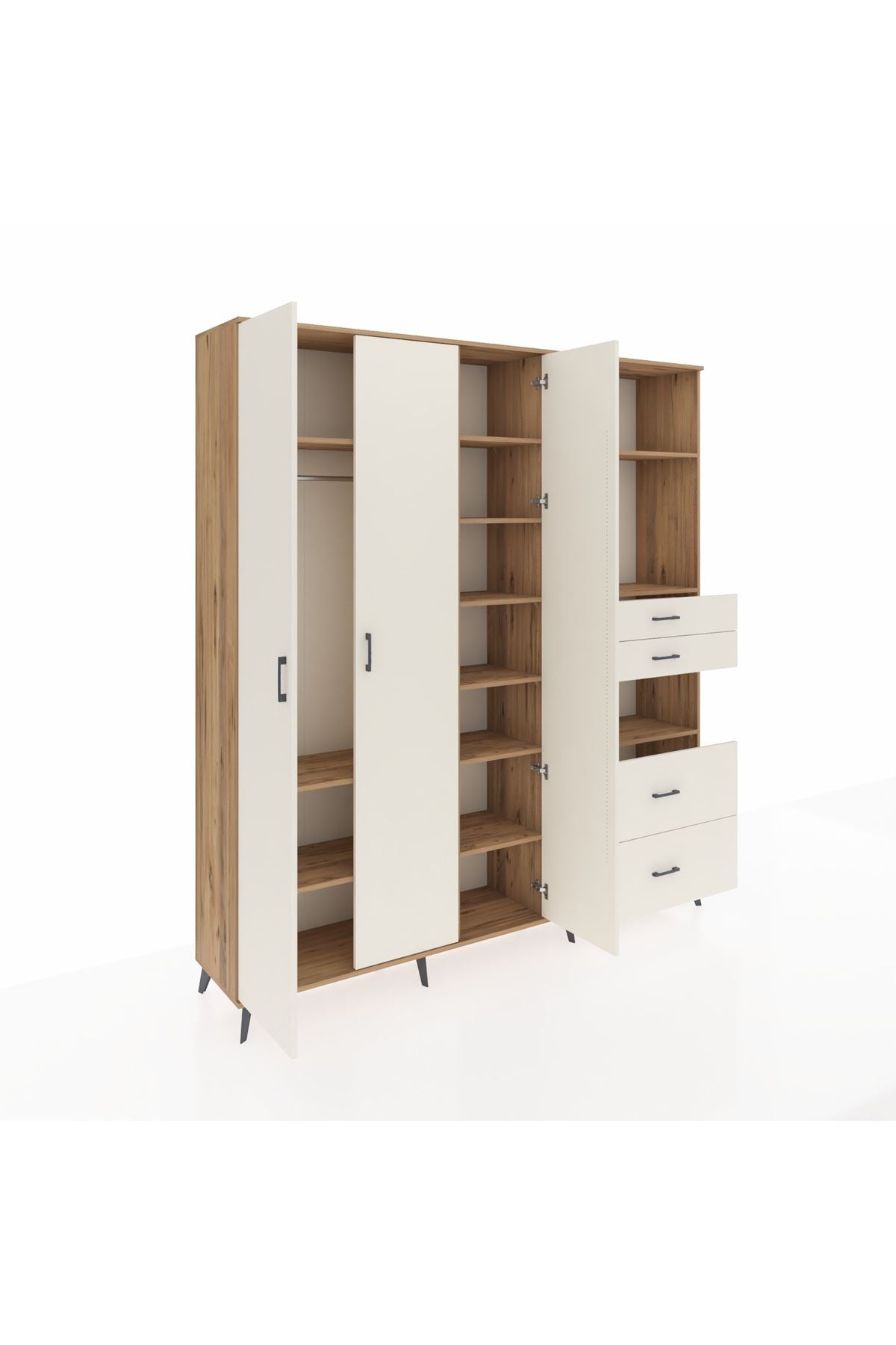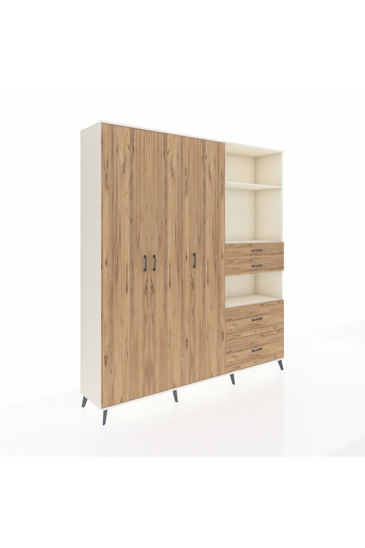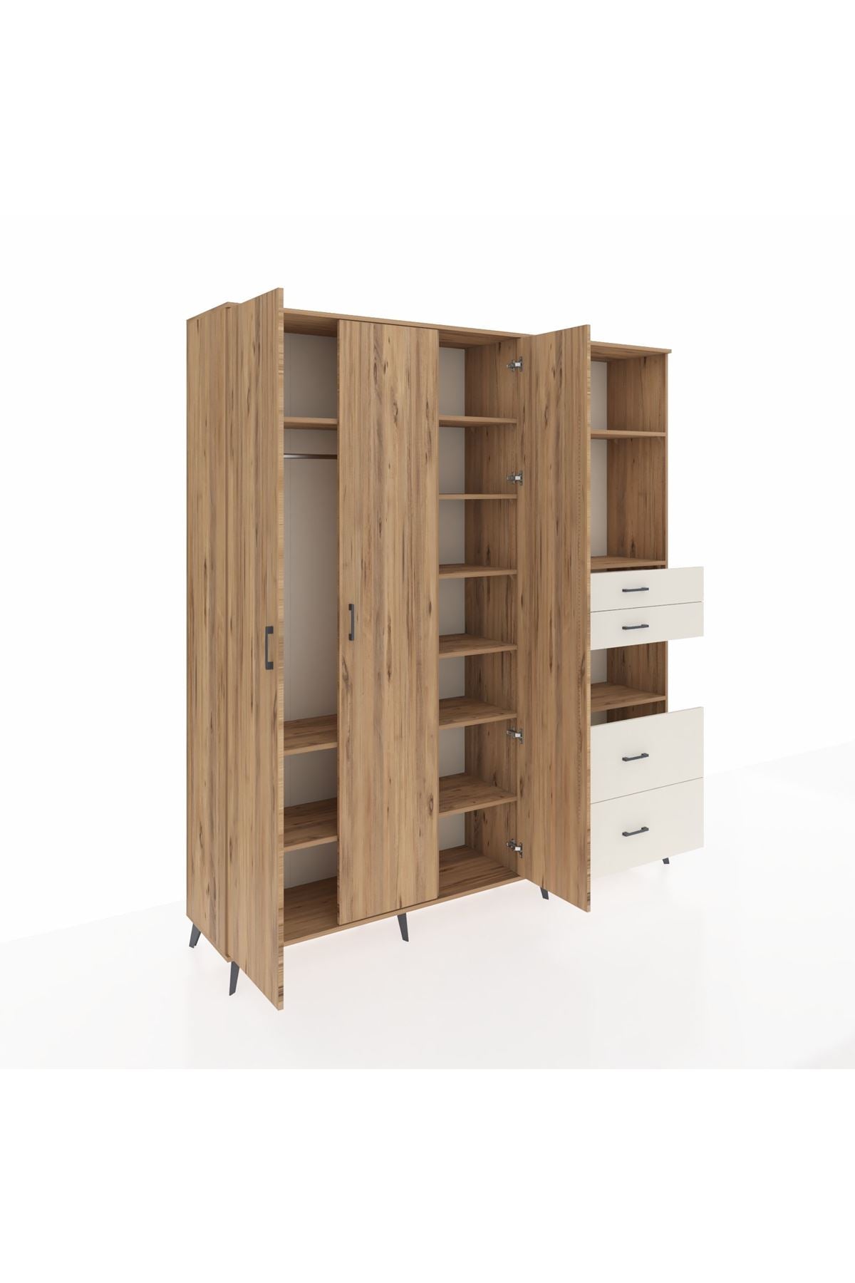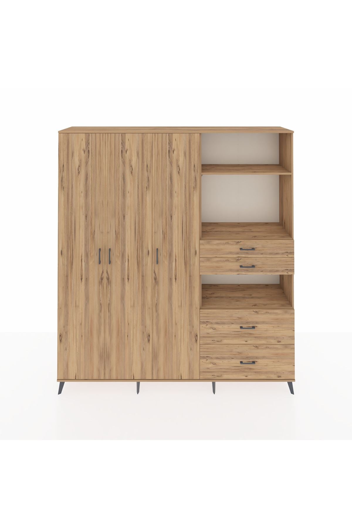 🦾 Dolabımızın metal ayakları, hem modern bir görünüm sağlar hem de sağlam bir zemin oluşturur. Metal kulplar ise dolabın şıklığını tamamlar ve kolay kullanım imkanı sunar.