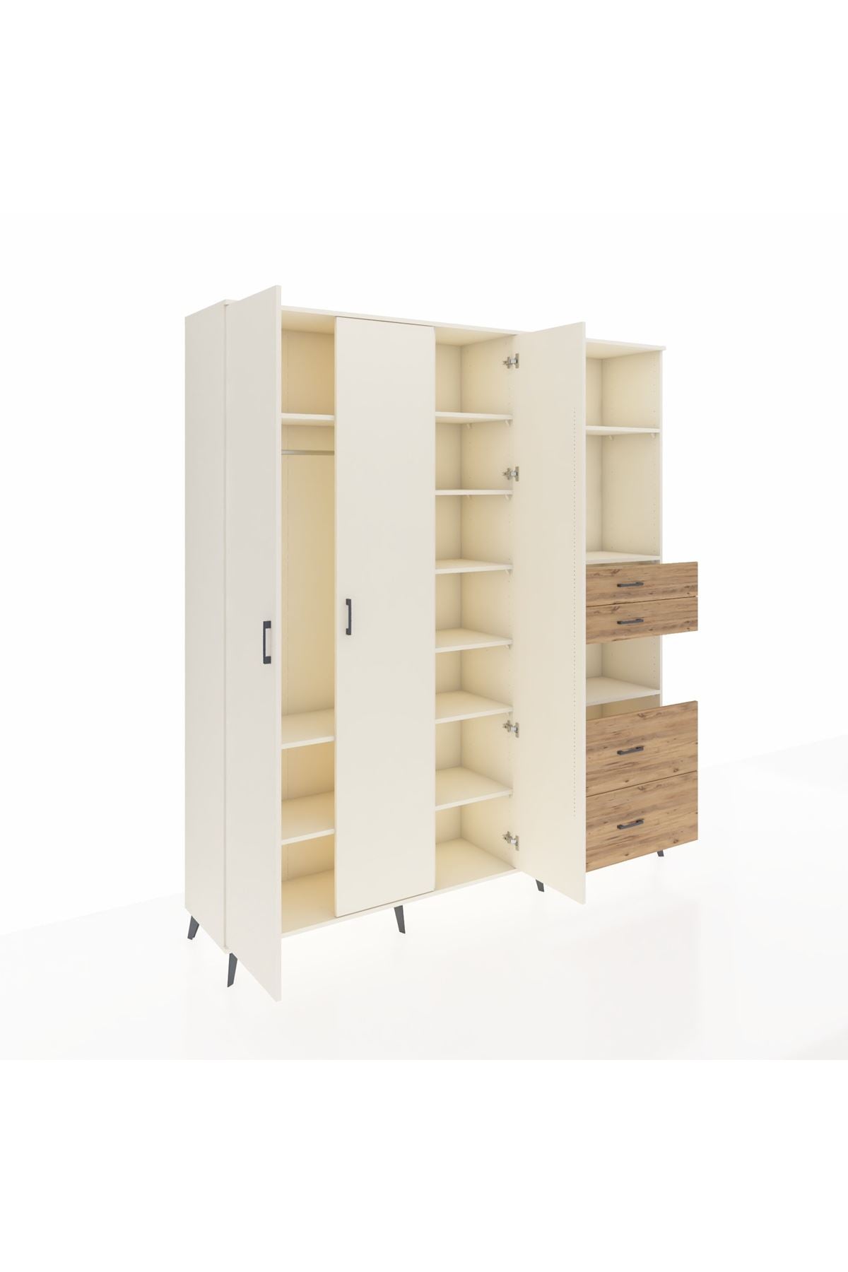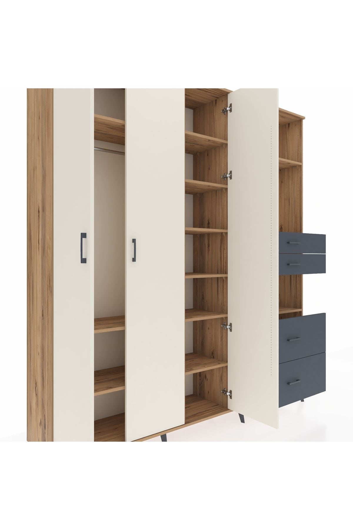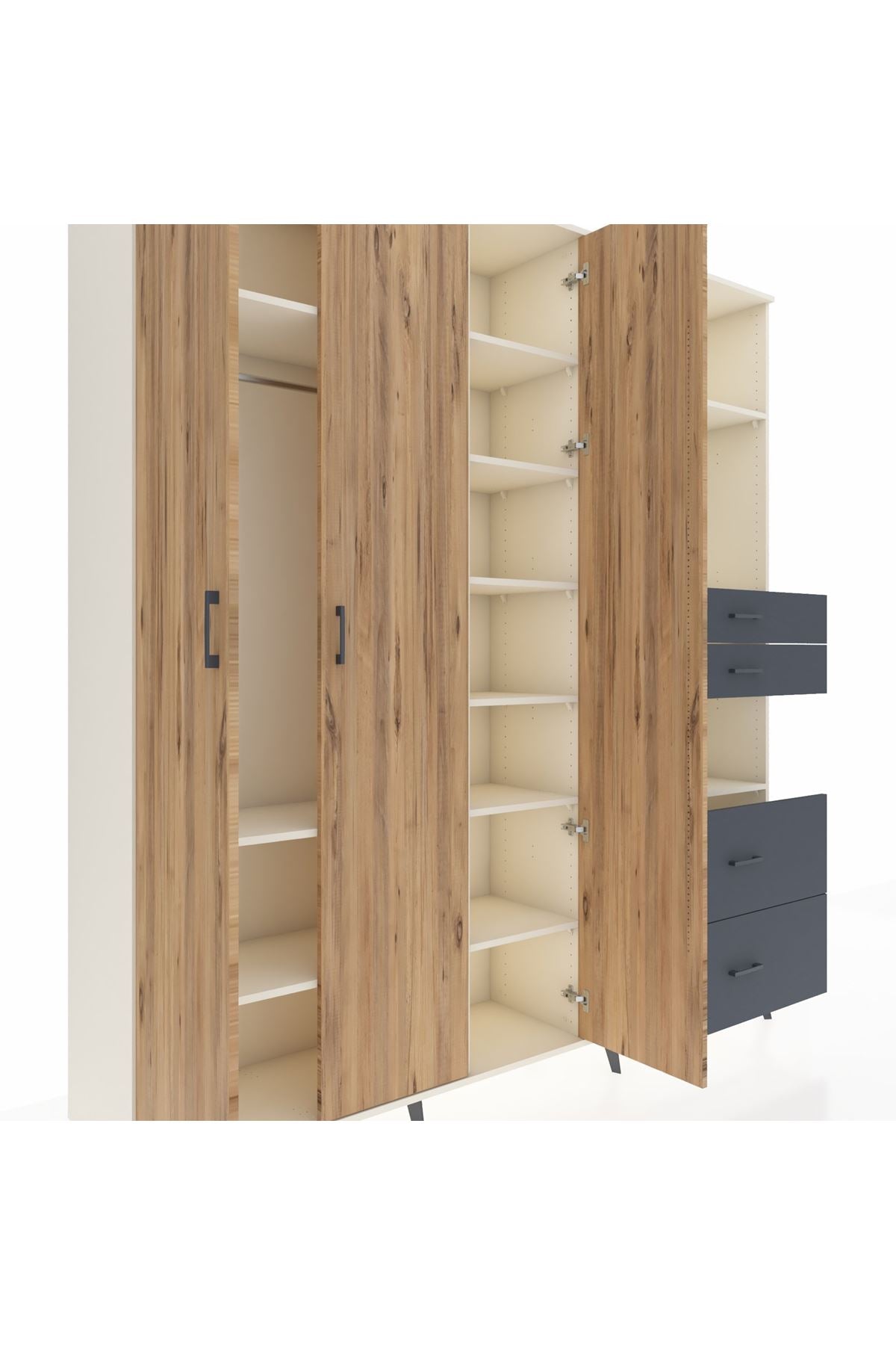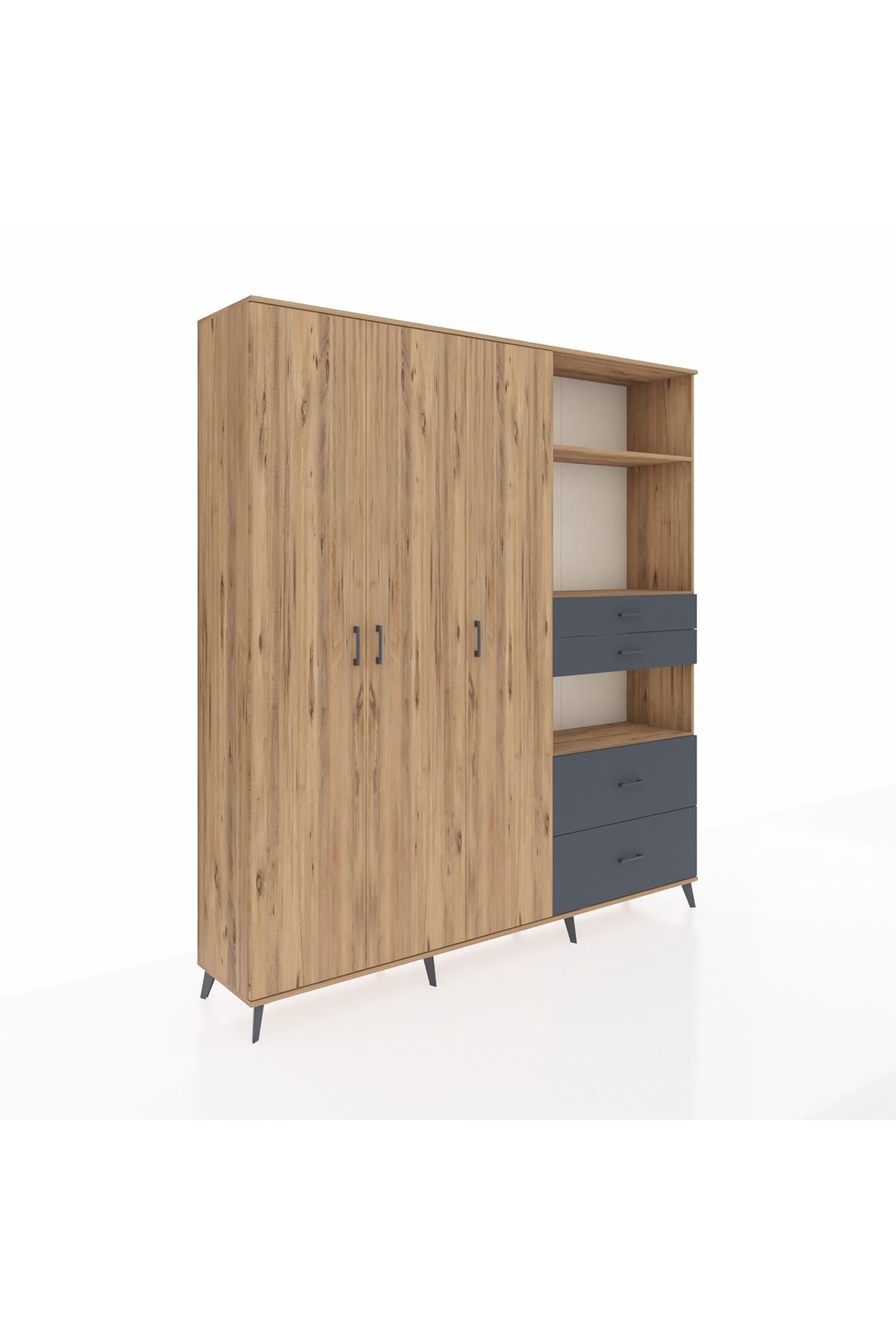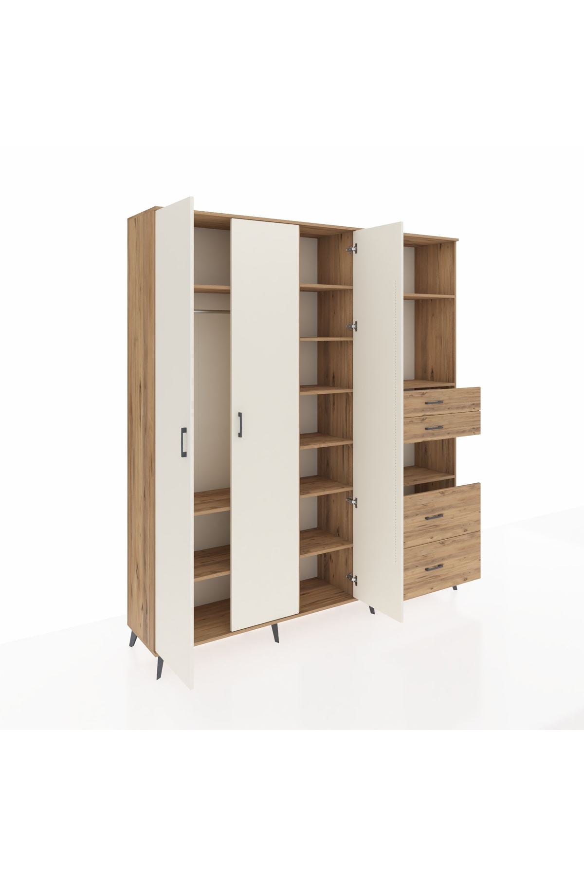 🦾 Dolabımızın metal ayakları, hem modern bir görünüm sağlar hem de sağlam bir zemin oluşturur. Metal kulplar ise dolabın şıklığını tamamlar ve kolay kullanım imkanı sunar.