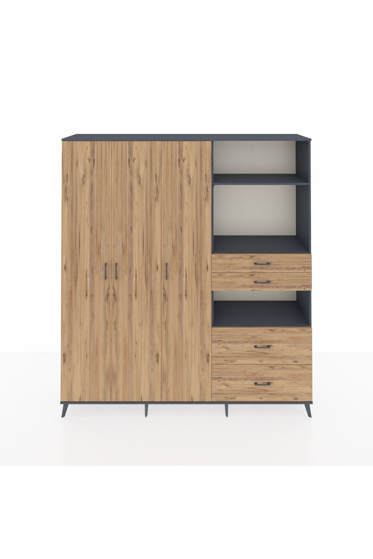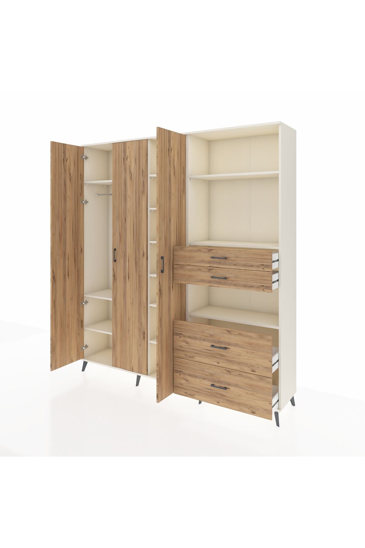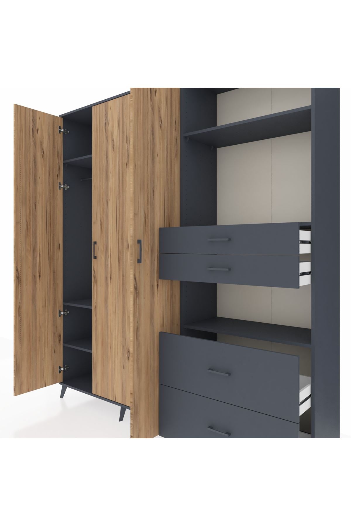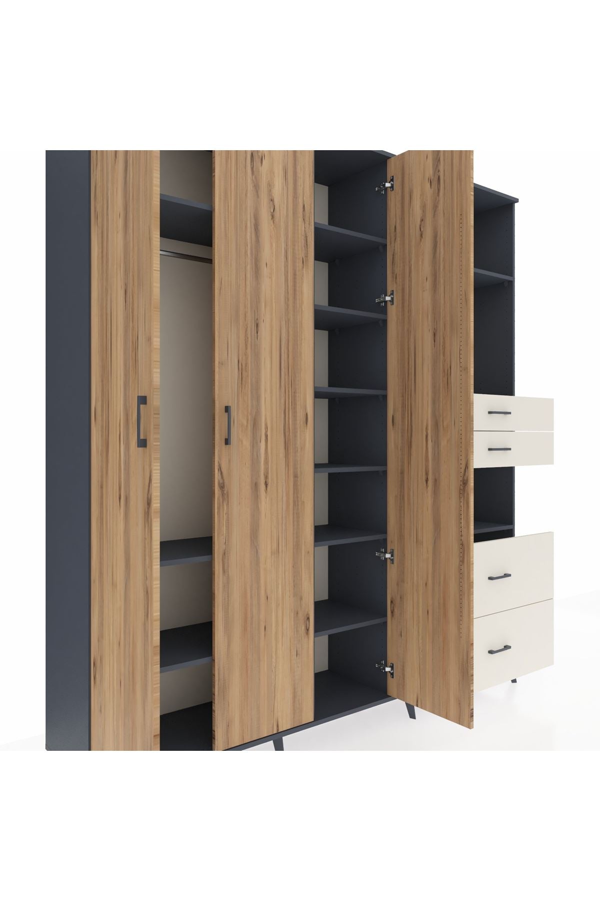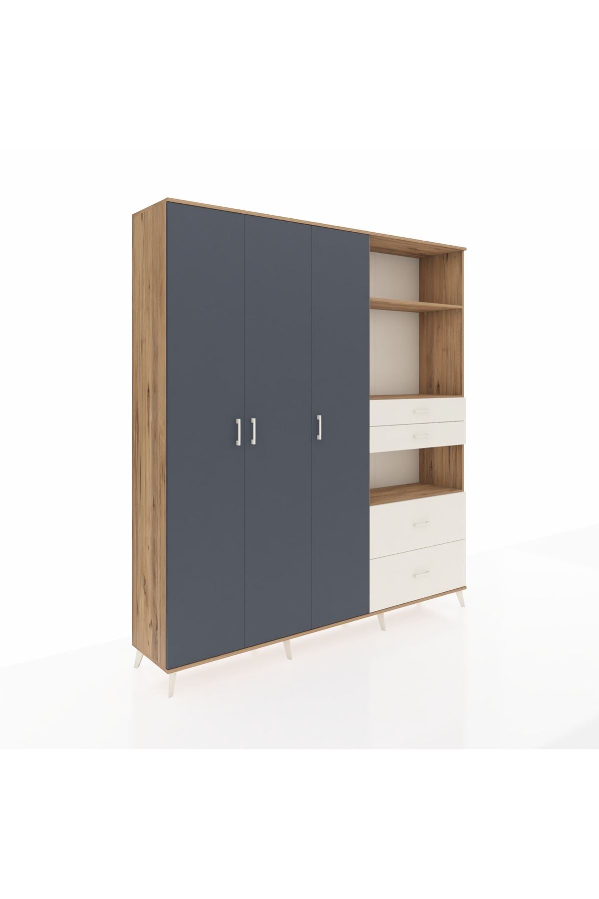 🦾 Dolabımızın metal ayakları, hem modern bir görünüm sağlar hem de sağlam bir zemin oluşturur. Metal kulplar ise dolabın şıklığını tamamlar ve kolay kullanım imkanı sunar.