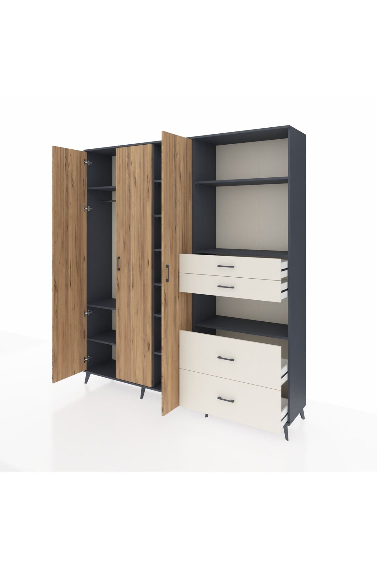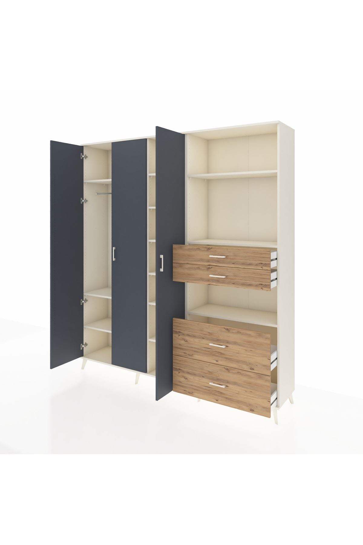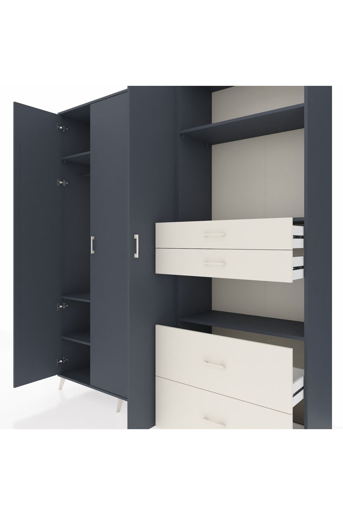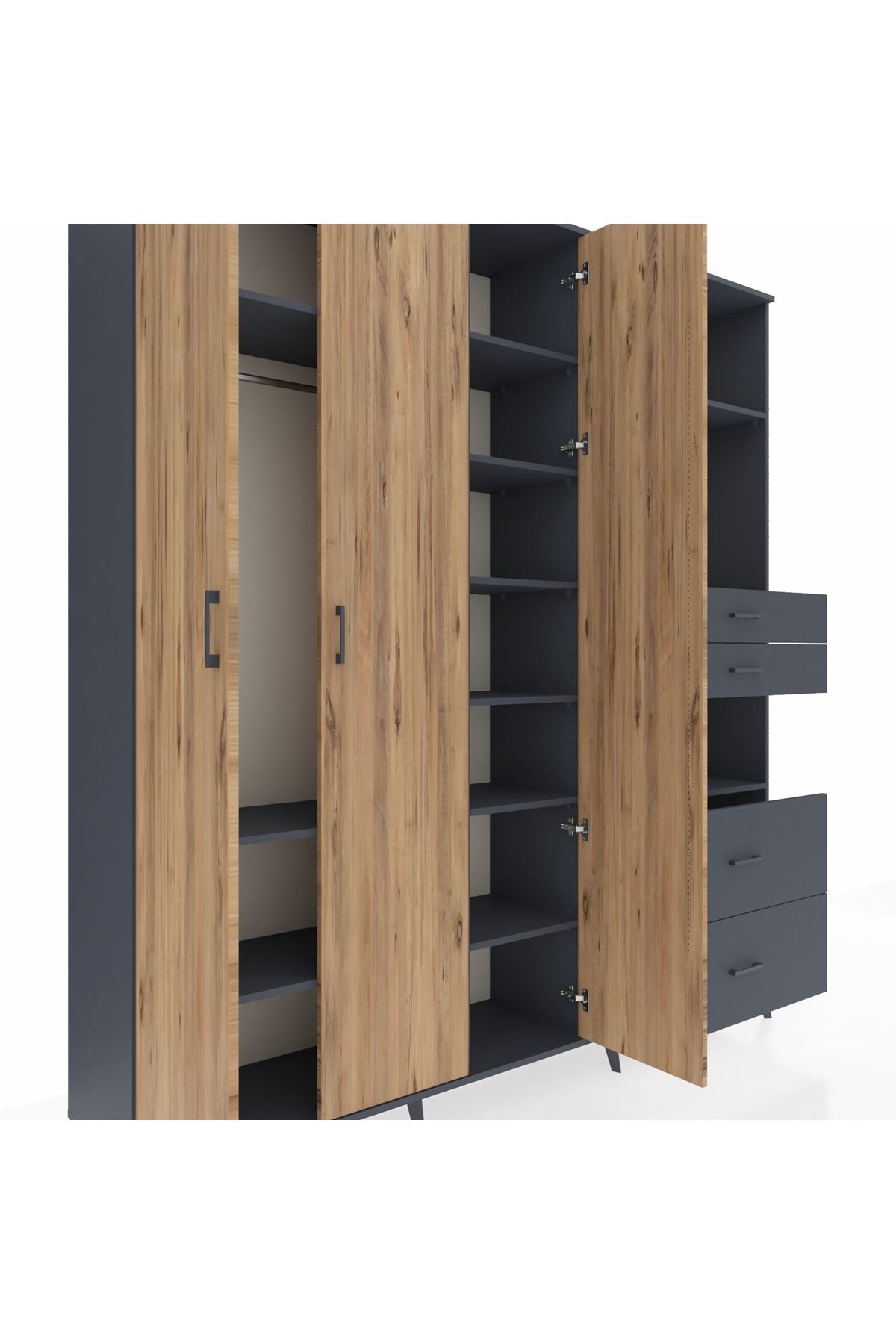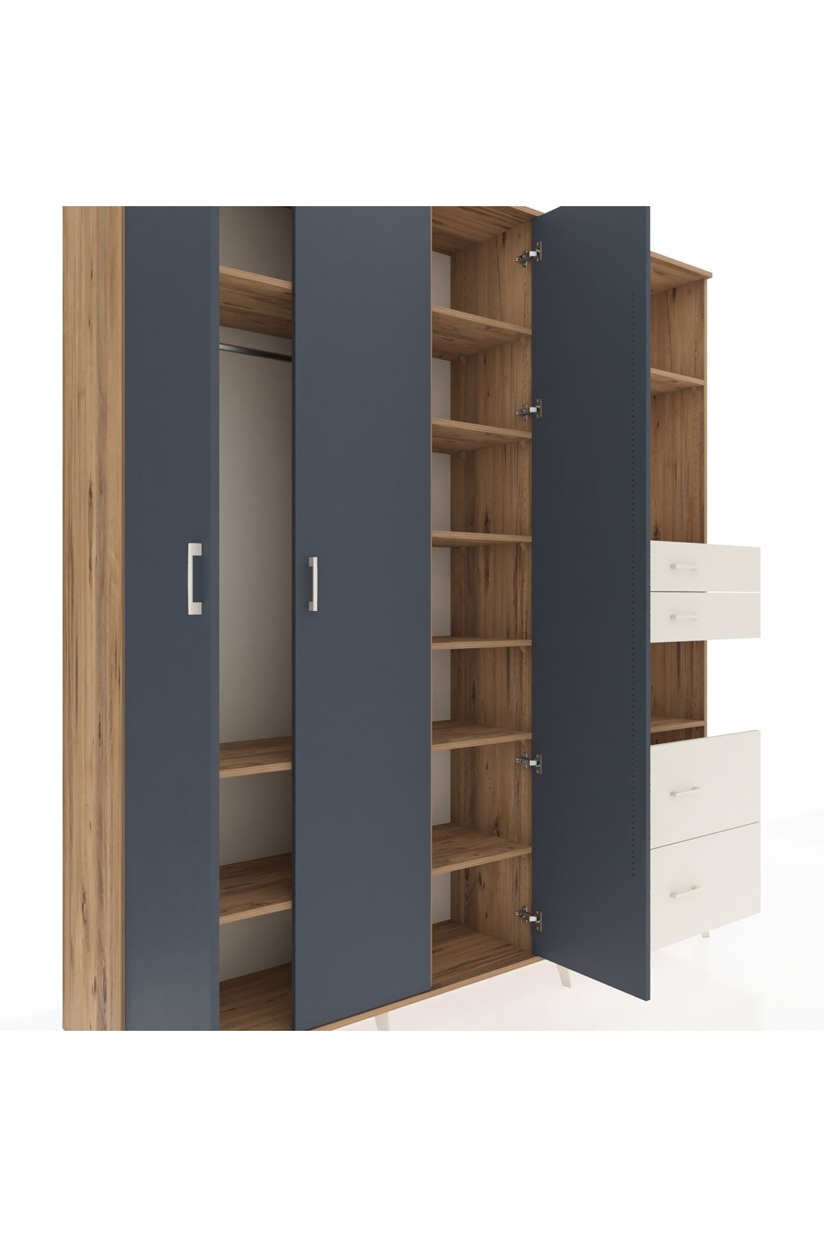 🦾 Dolabımızın metal ayakları, hem modern bir görünüm sağlar hem de sağlam bir zemin oluşturur. Metal kulplar ise dolabın şıklığını tamamlar ve kolay kullanım imkanı sunar.