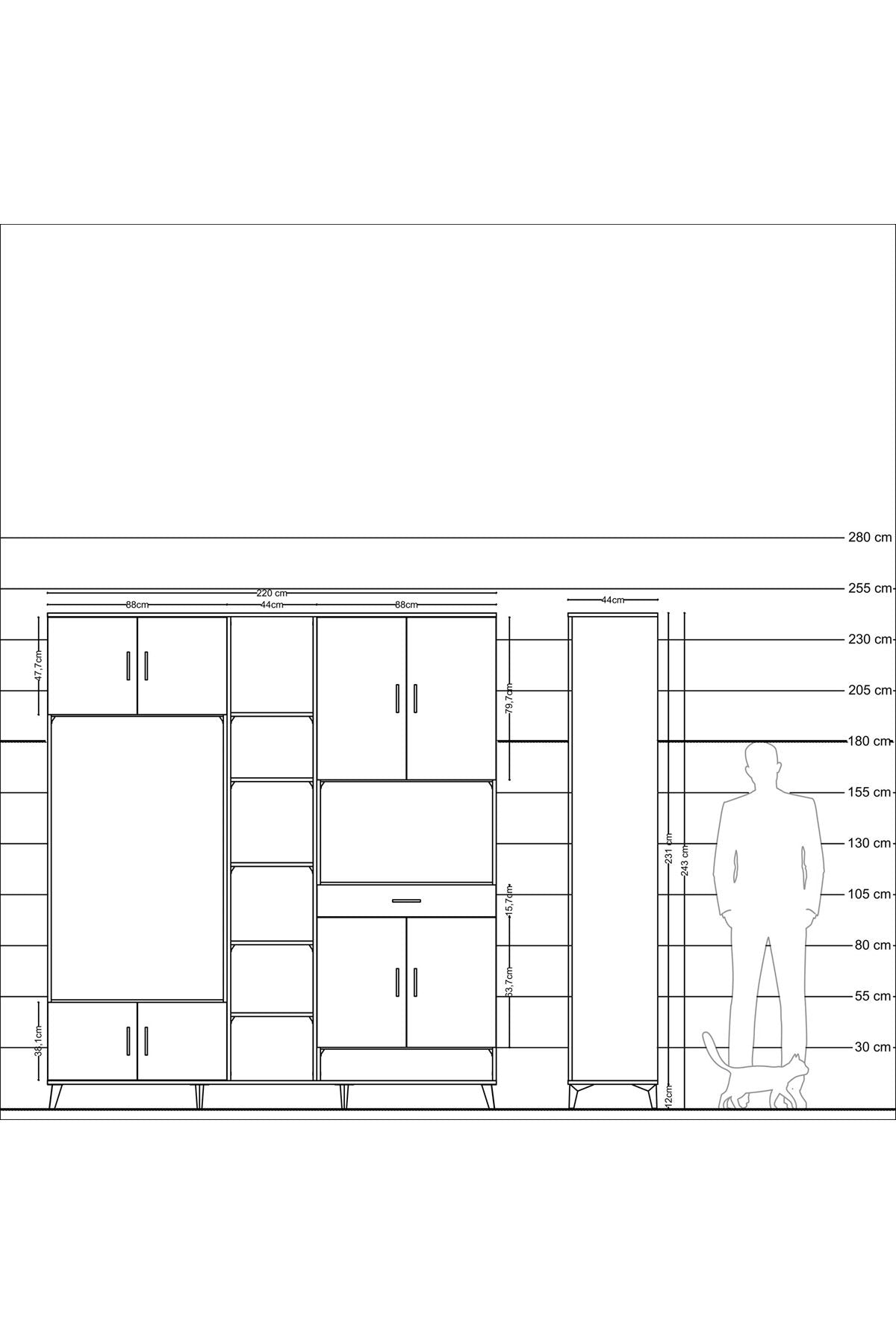📌 Hyperion Dolap 12 Raflı Tek Çekmeceli 8 Kapaklı 220x44x243