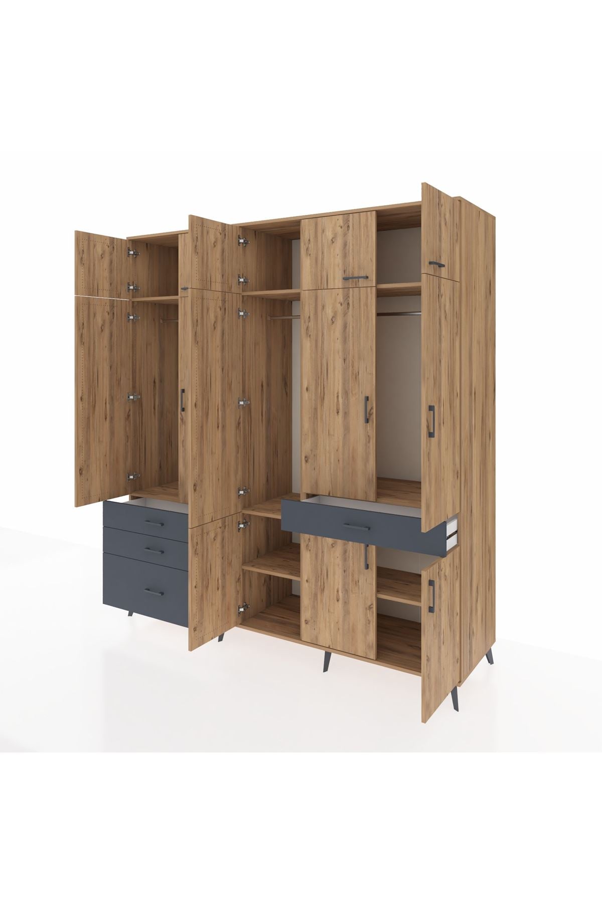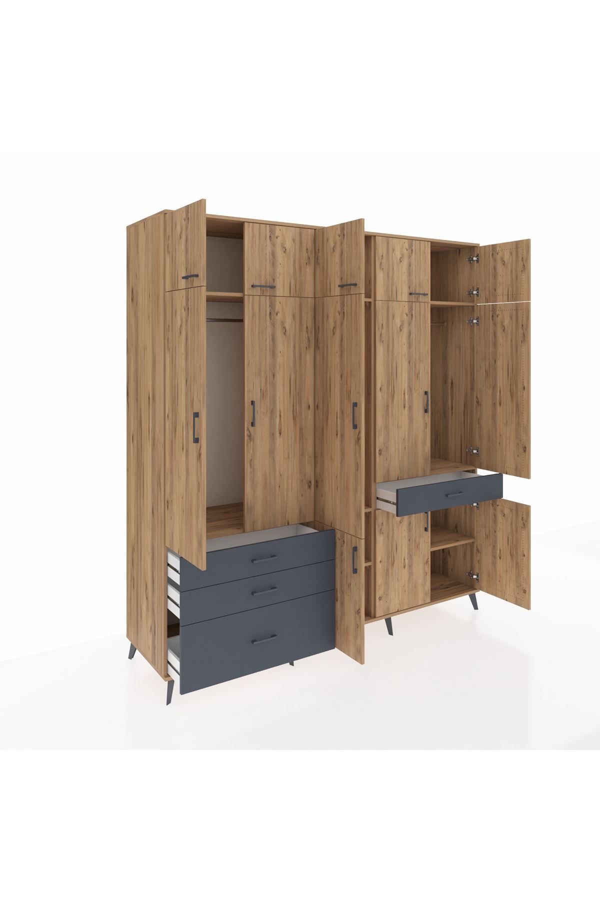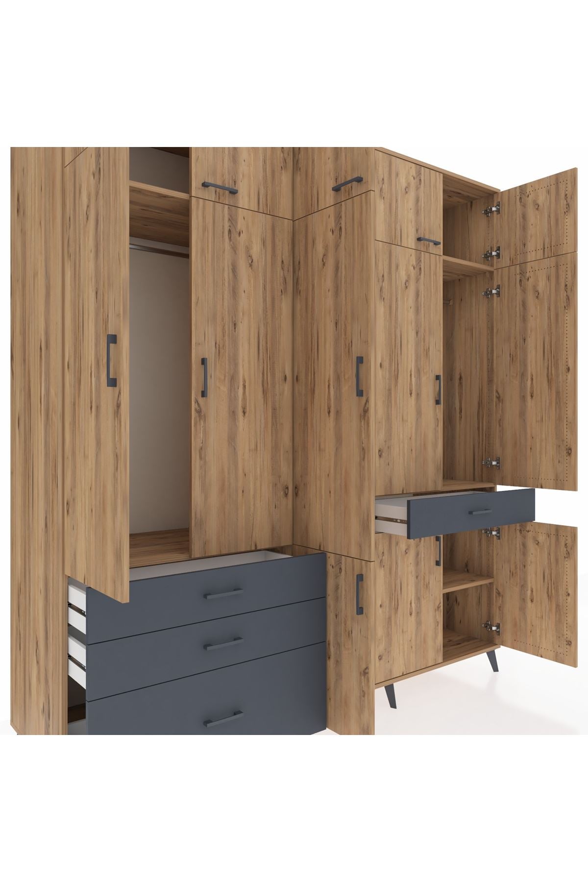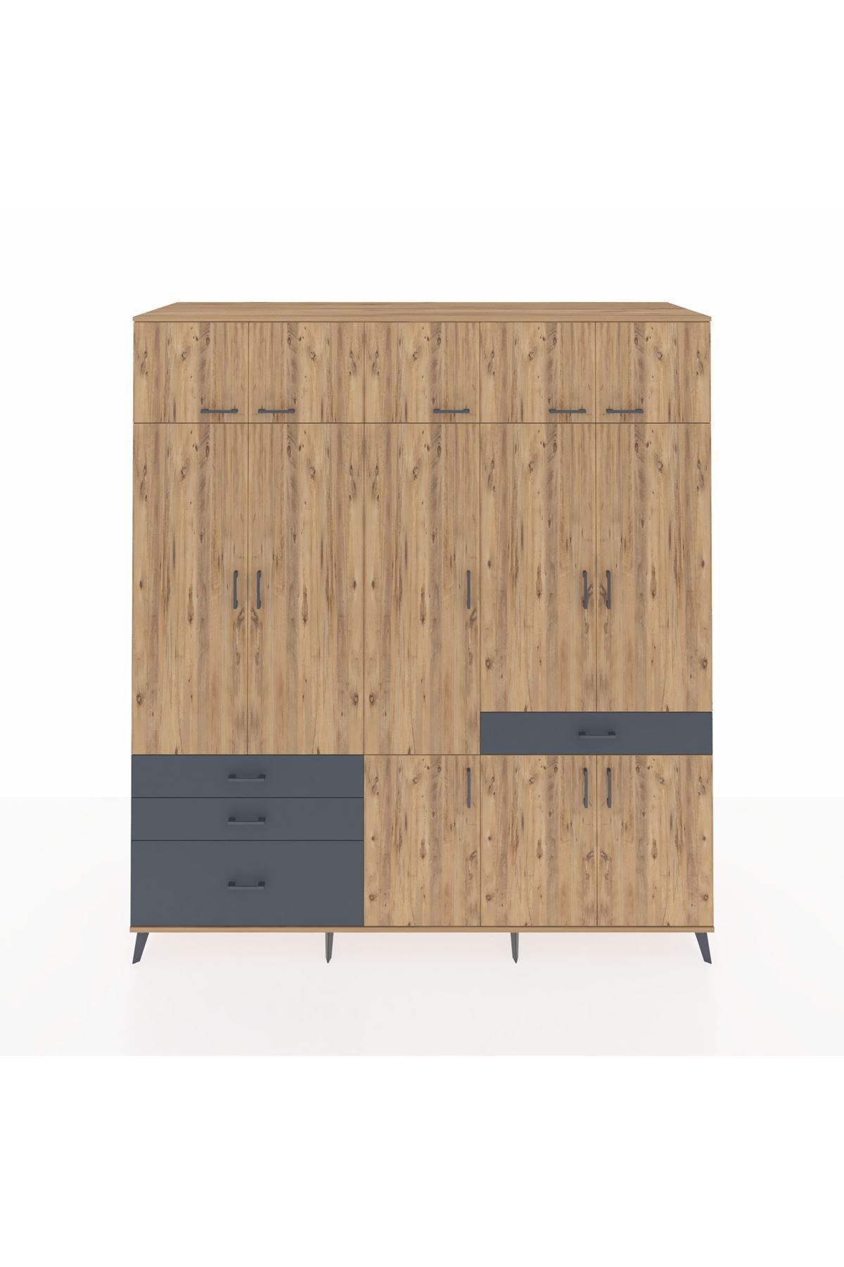 Kronos Dolap 8 Raflı 4 Çekmeceli 3 Askılı 220x59x243 Çam-Çam/Antrasit