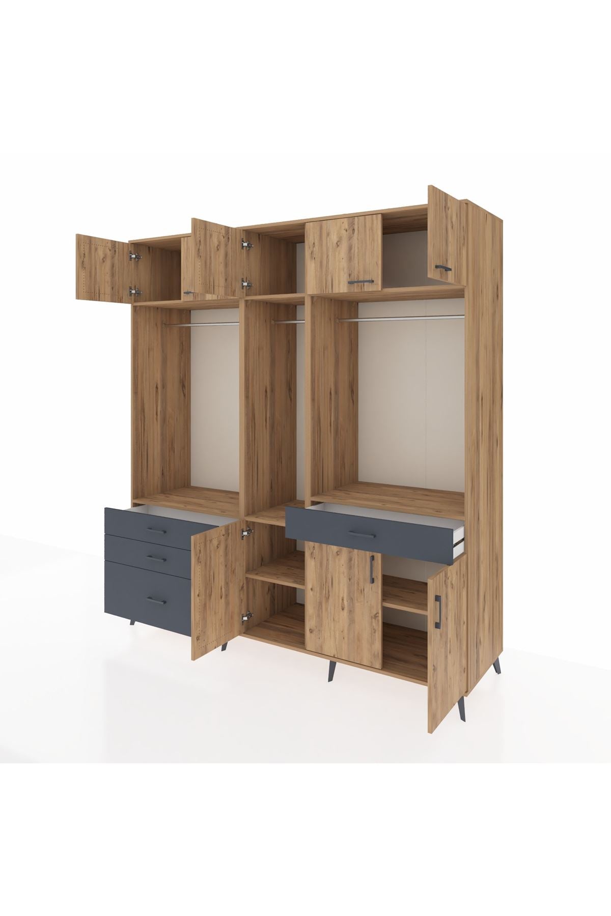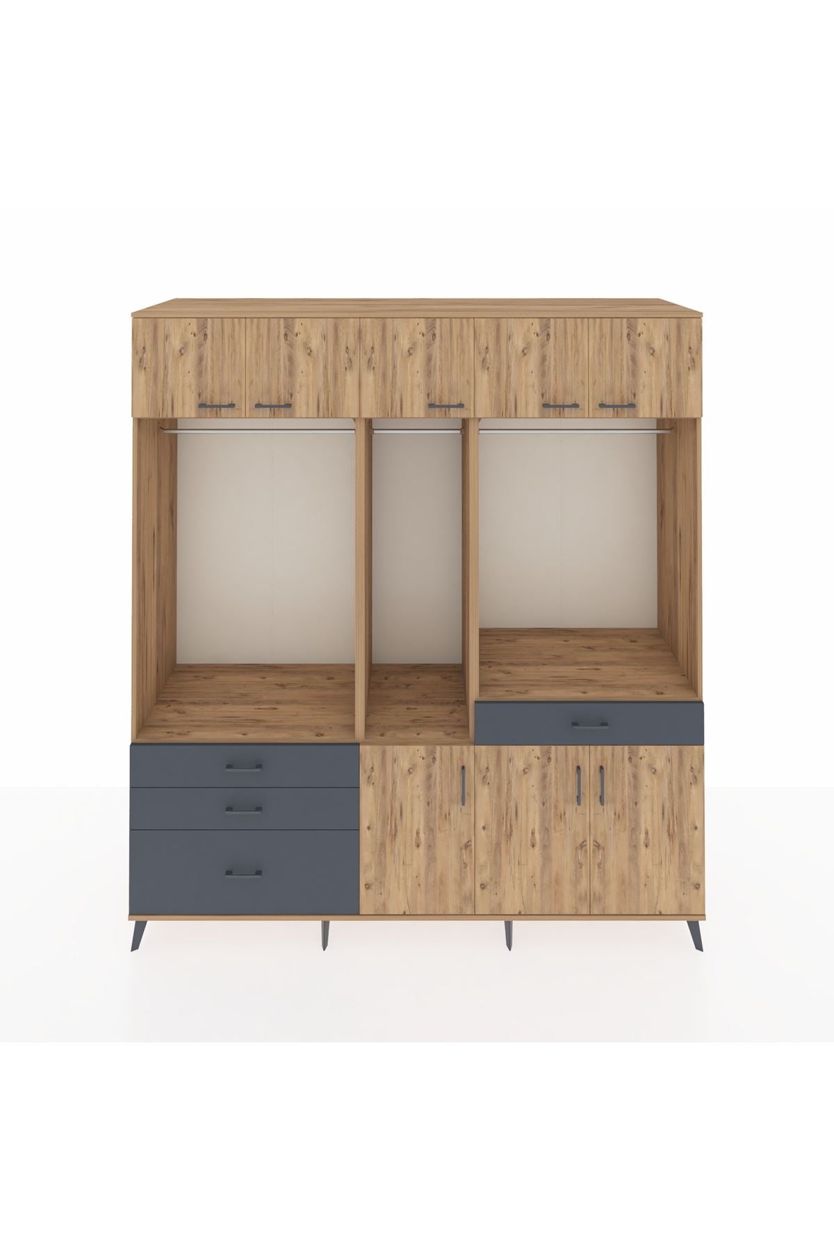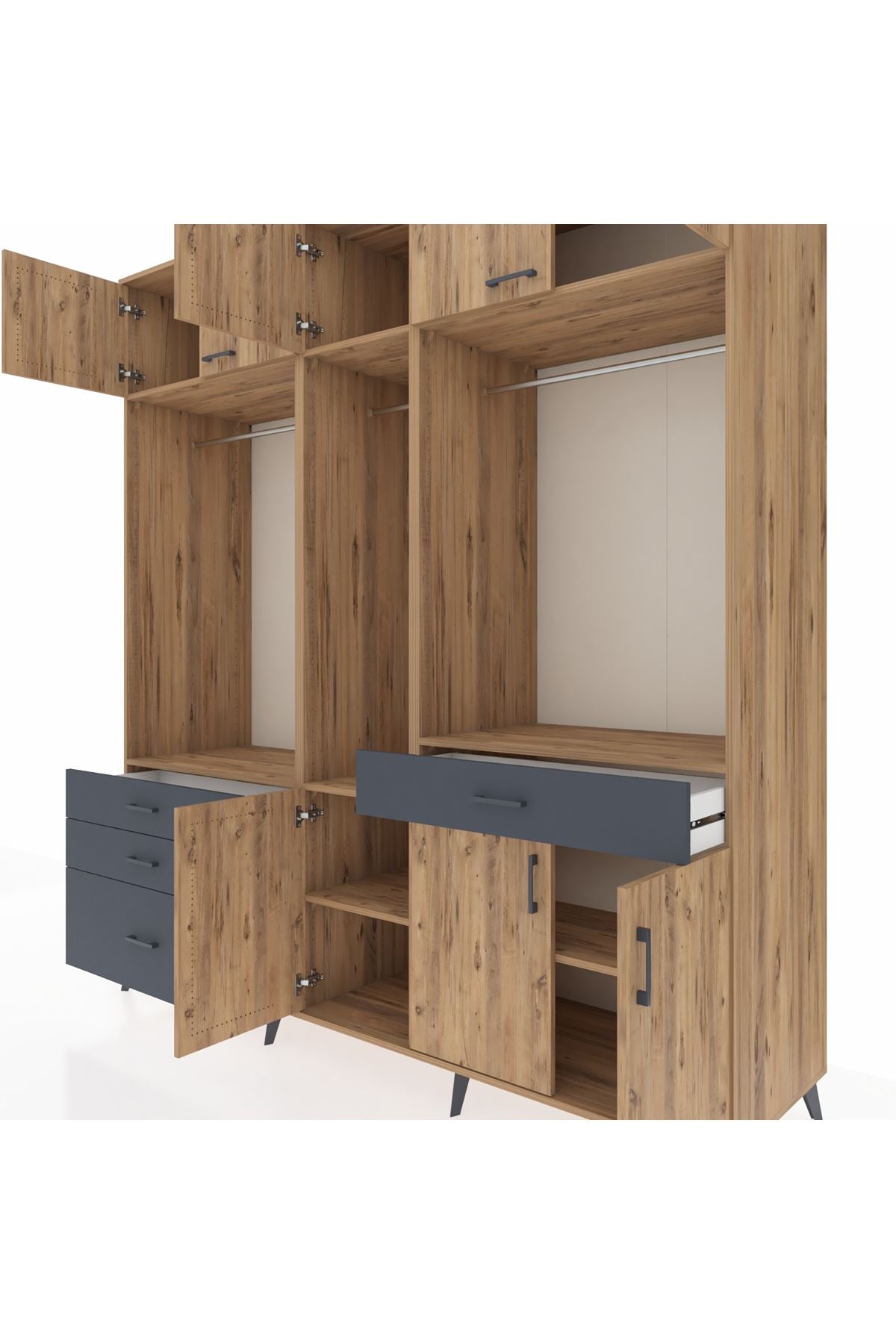Kronos Dolap 8 Raflı 4 Çekmeceli 3 Askılı 220x59x243 Çam-Çam/Antrasit