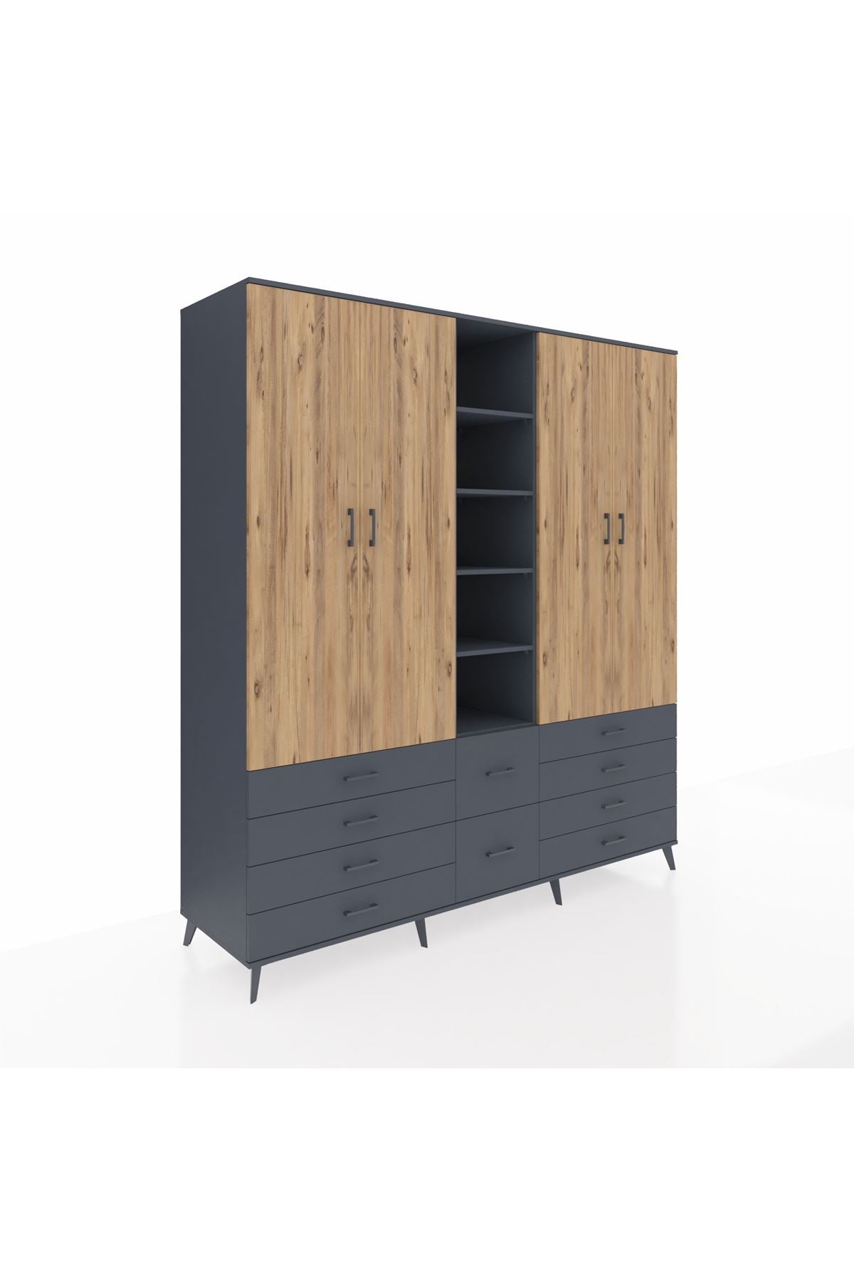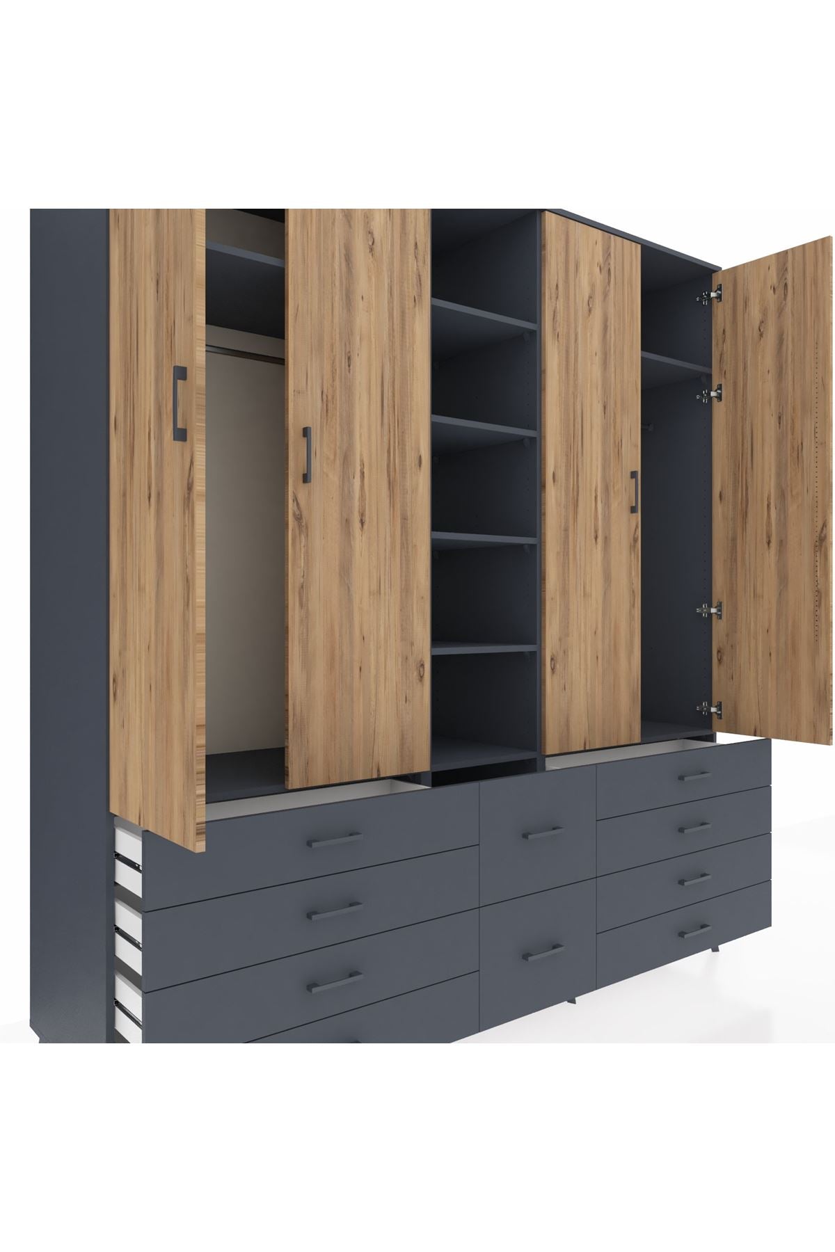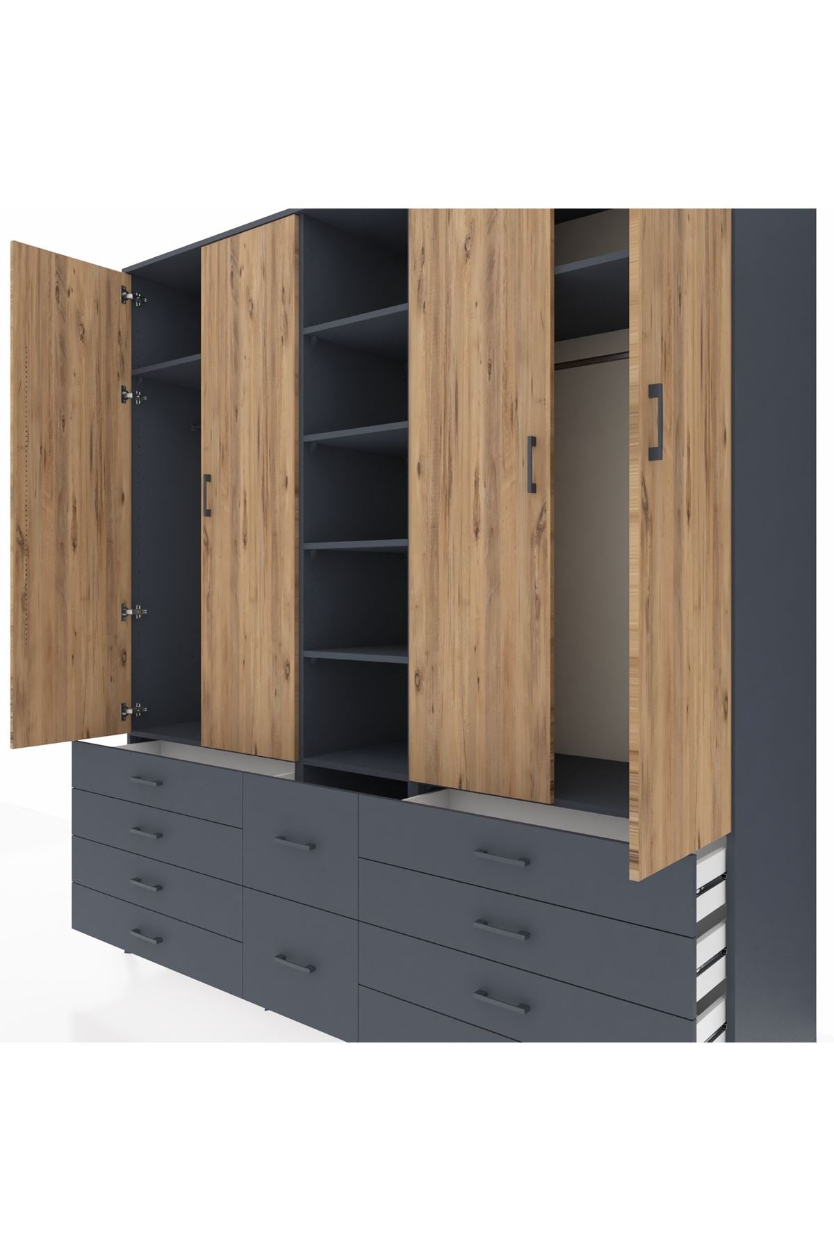 Kronos Dolap 9 Raflı 10 Çekmeceli 2 Askılı 220x59x243 Antrasit-Çam/Antrasit