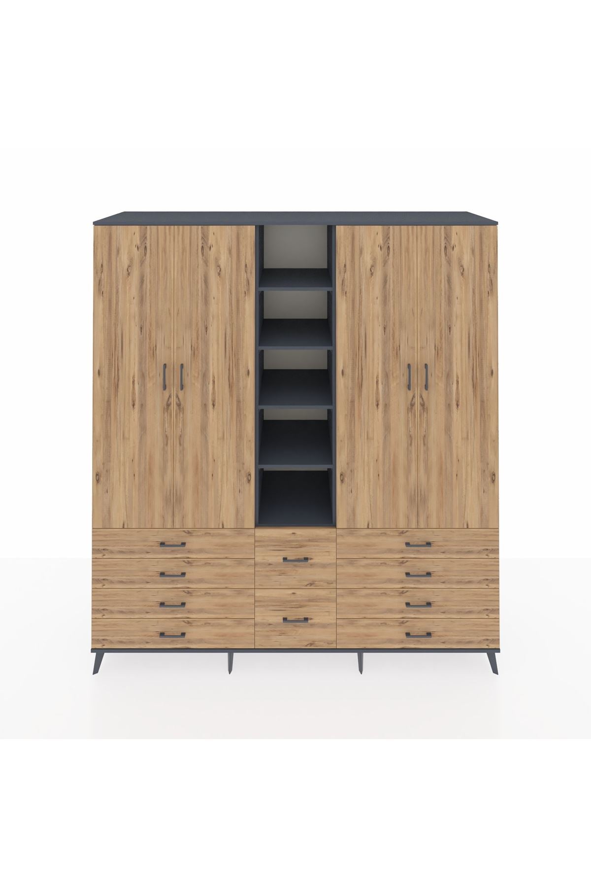 Kronos Dolap 9 Raflı 10 Çekmeceli 2 Askılı 220x59x243 Antrasit-Çam/Çam
