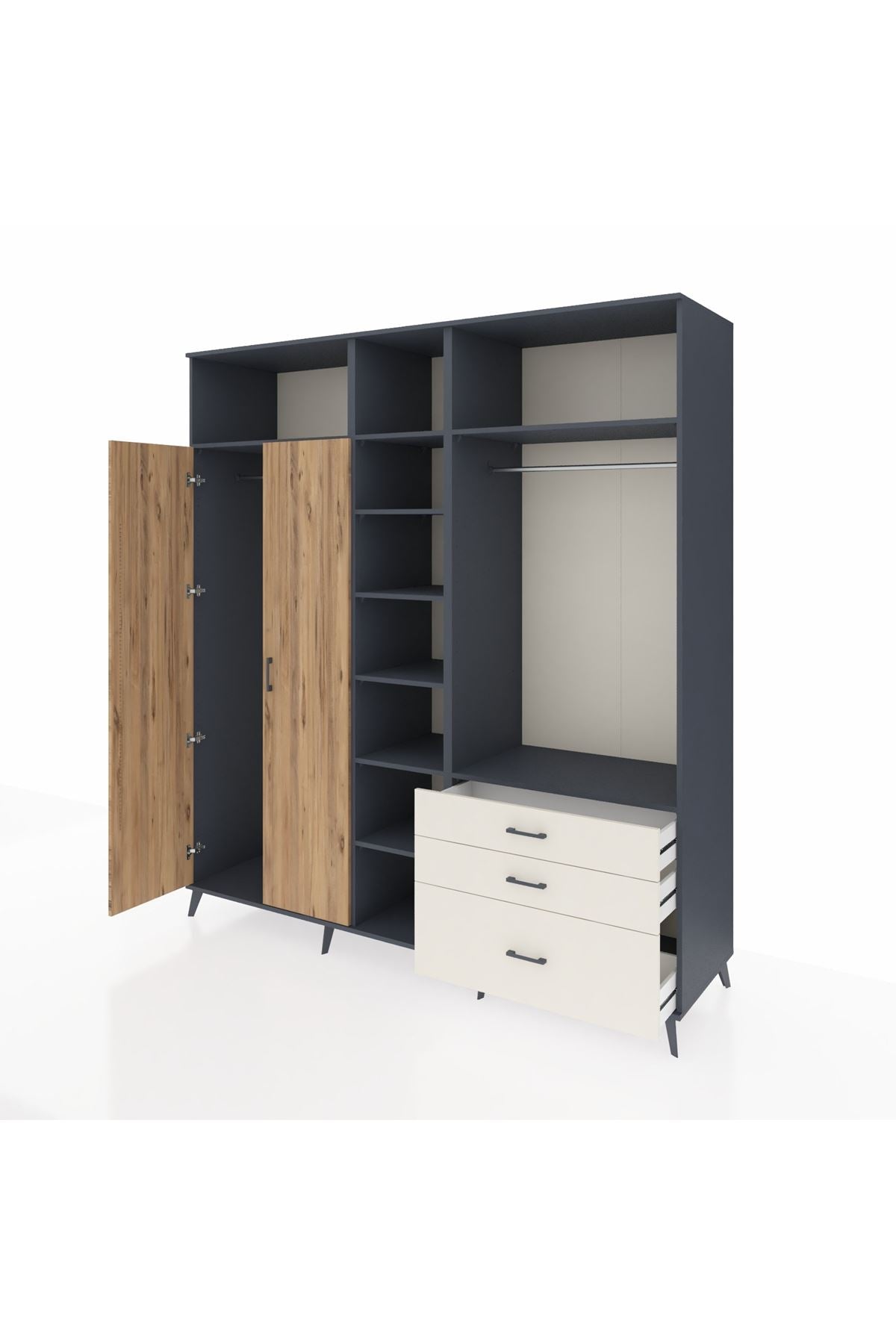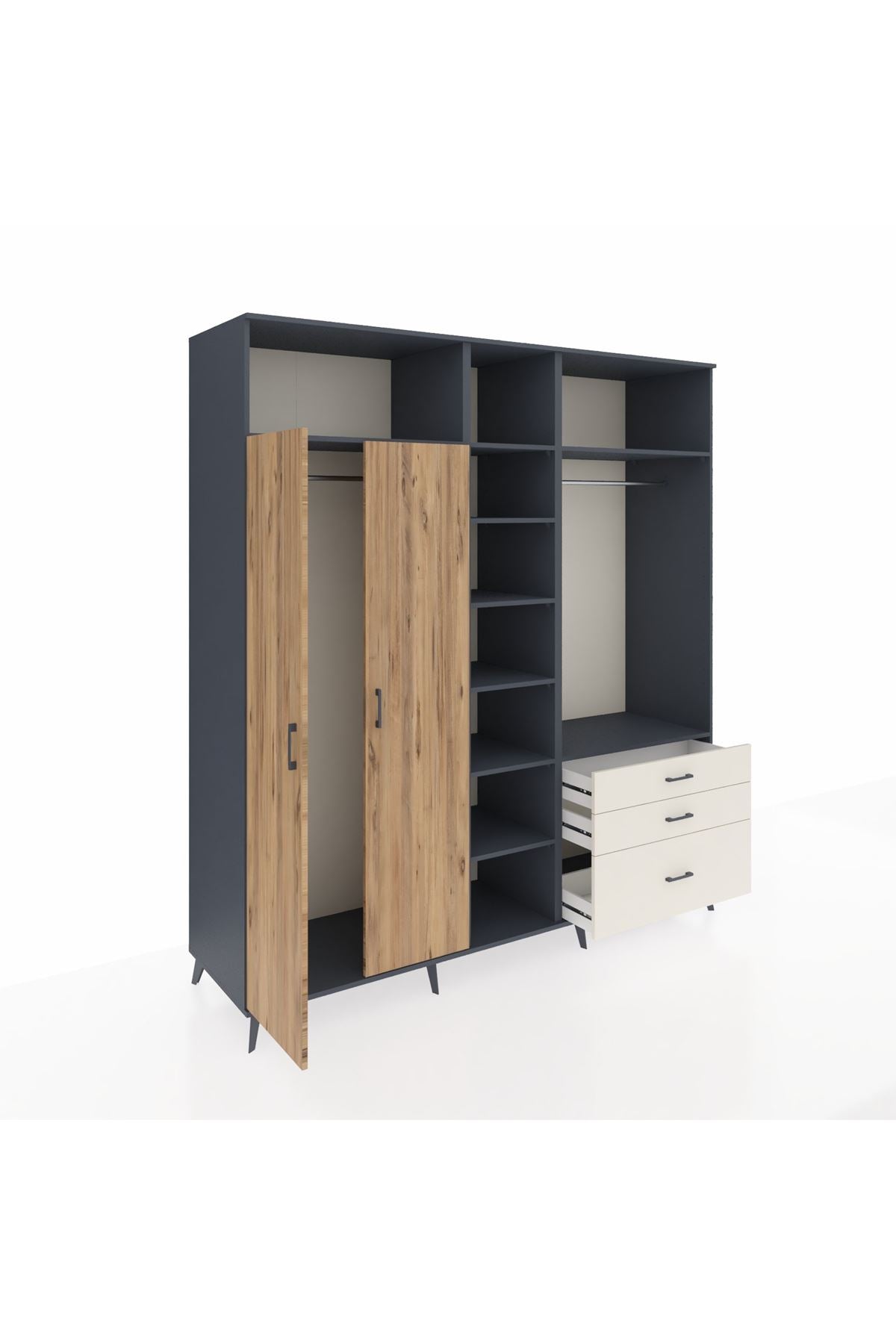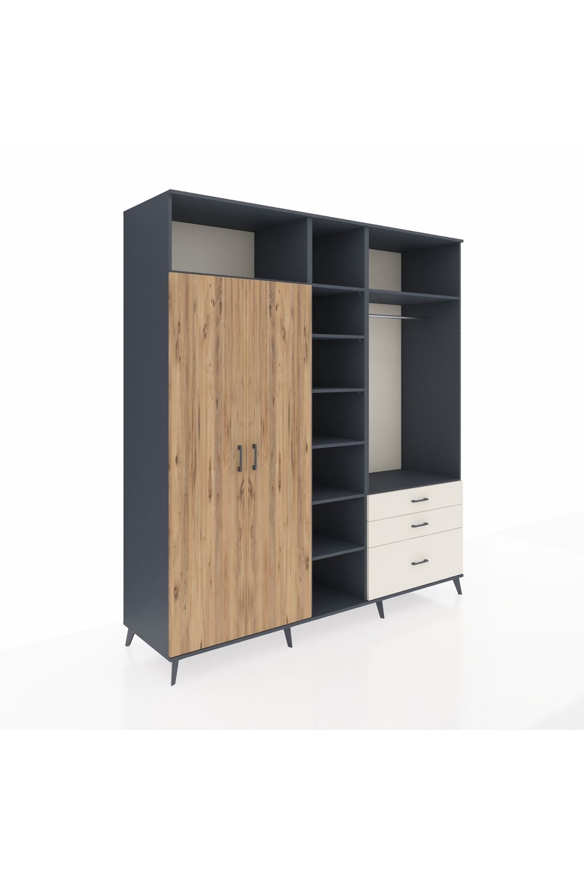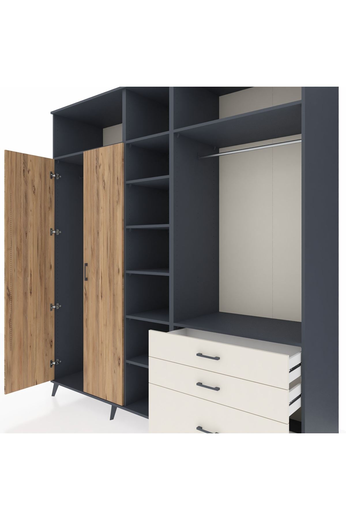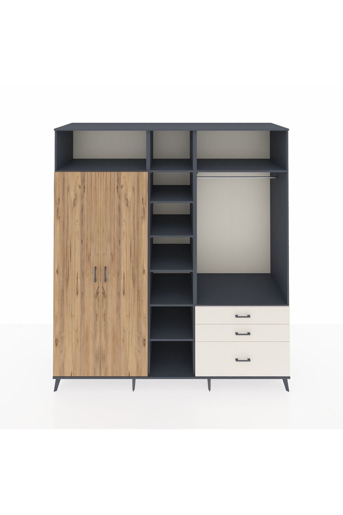 Kronos Dolap 9 Raflı 3 Çekmeceli 2 Askılı 220x59x243 Antrasit-Çam/Aytaşı