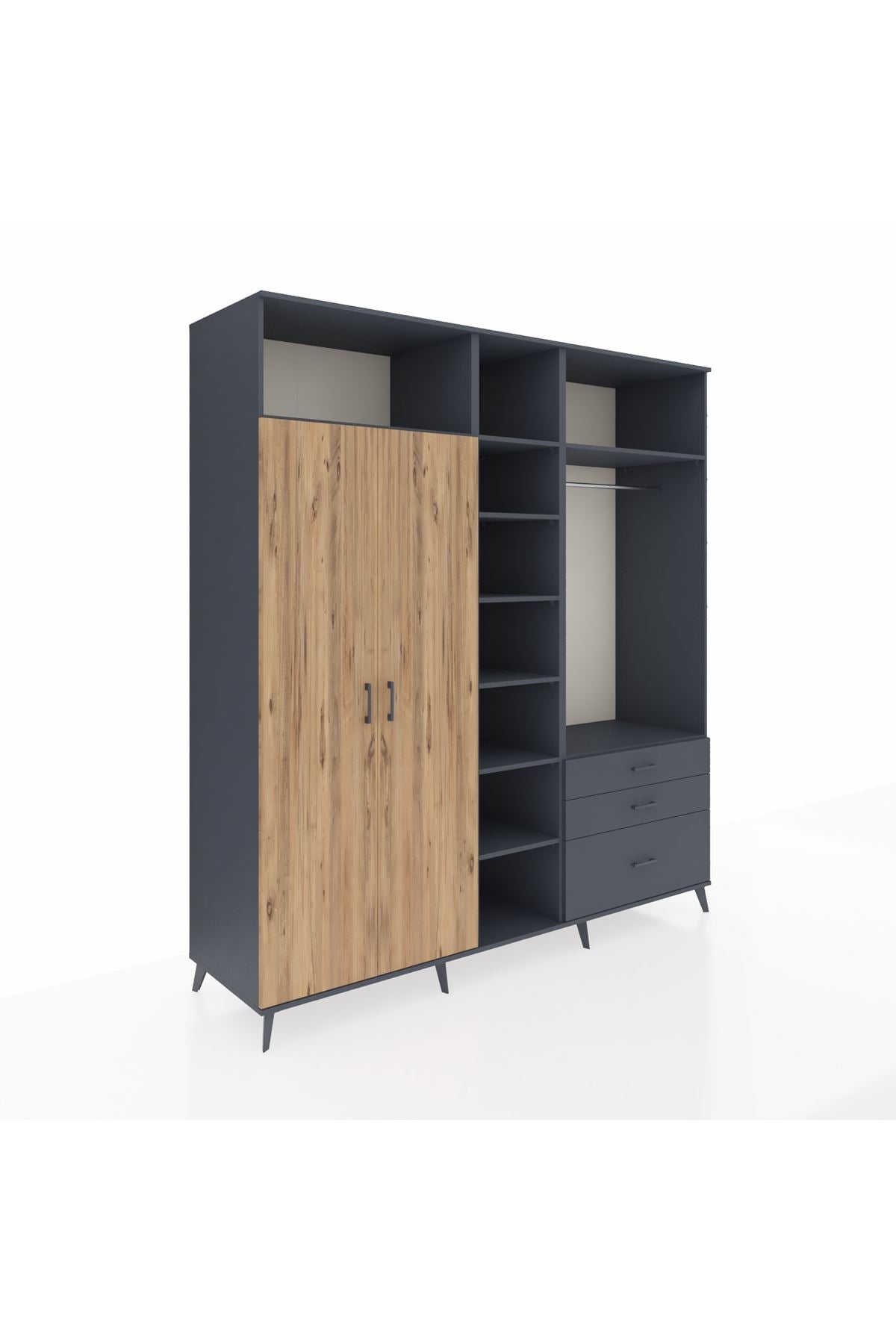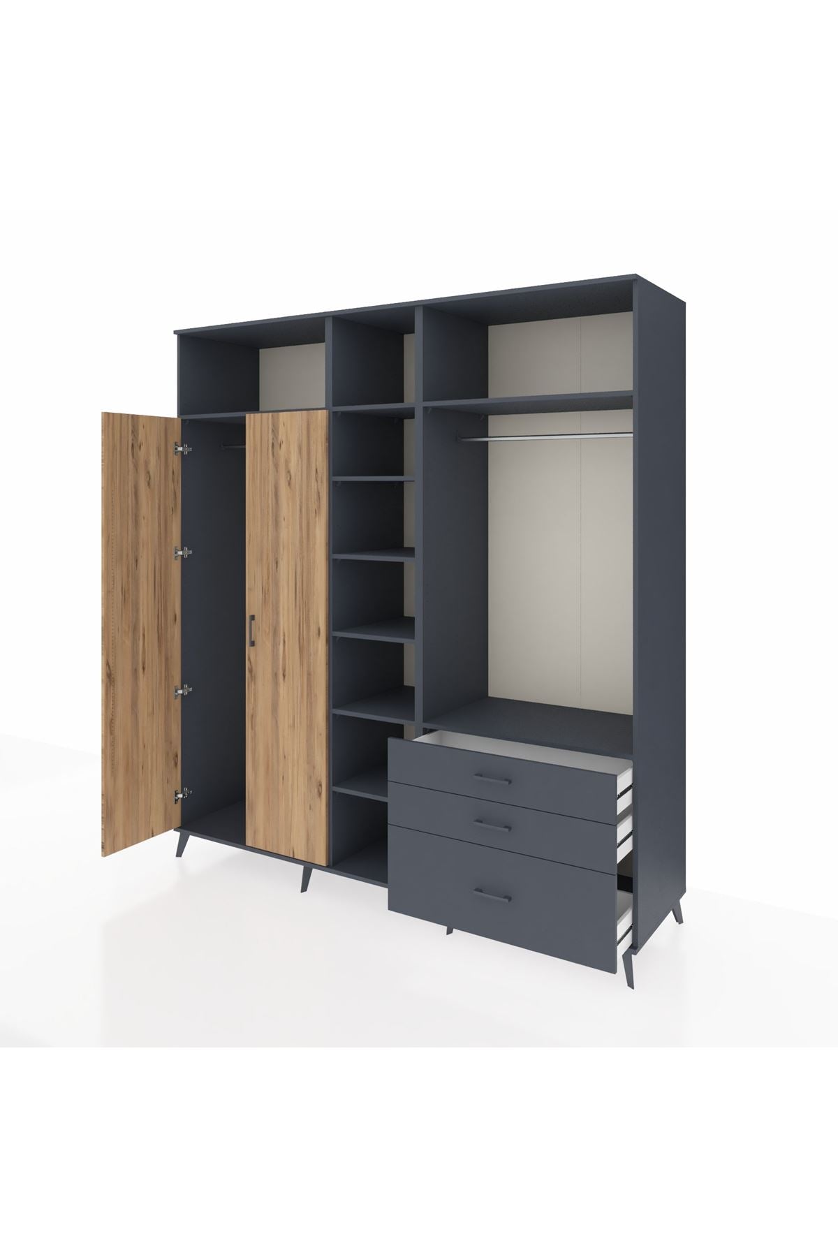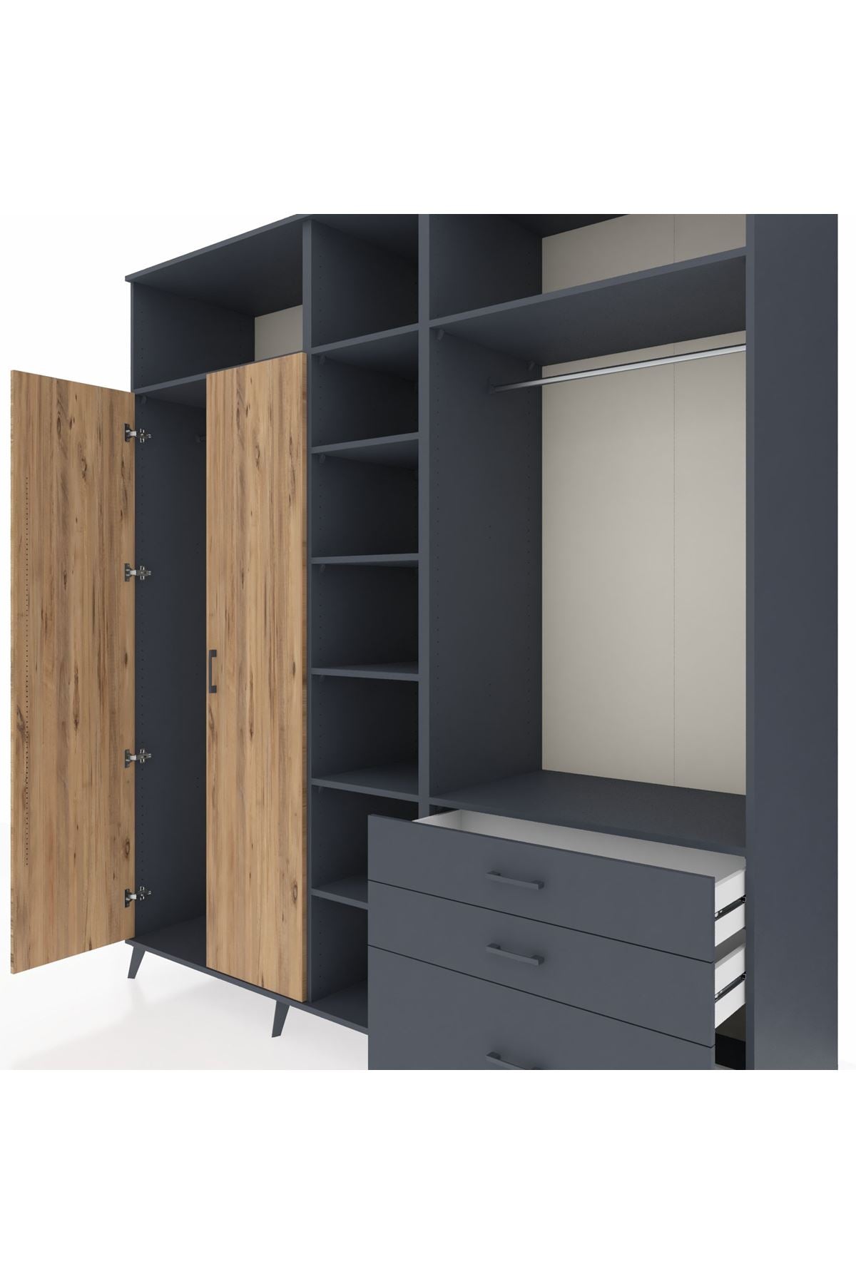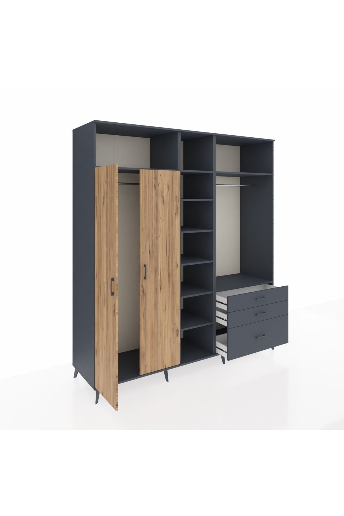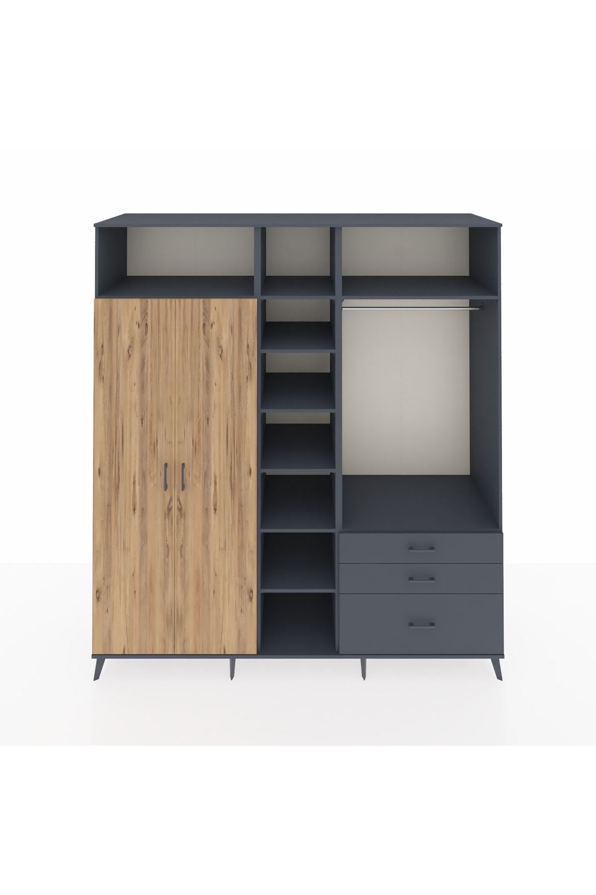 Kronos Dolap 9 Raflı 3 Çekmeceli 2 Askılı 220x59x243 Antrasit-Çam/Antrasit