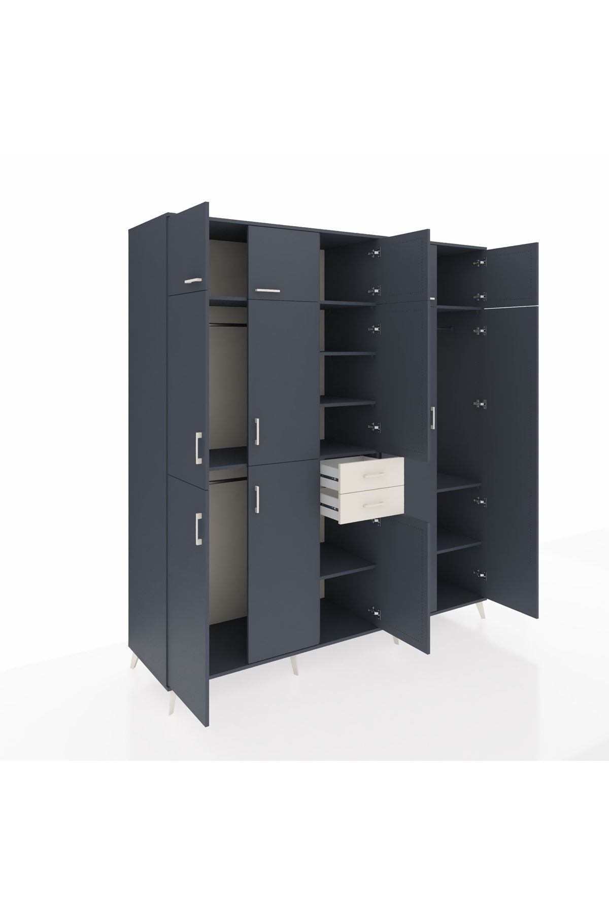 🪶 Özel metal ayakları ve kulplarıyla göz alıcı bir dayanıklılık sunarken, Kastamonu Entegre’nin 1. sınıf suntalam malzemesi ile mobilyanıza uzun ömür kazandırır. 1.2 mm kenar bandı, dolabınıza estetik bir incelik katıyor. Çekmeceler 27 cm açılma mesafesi sunar.