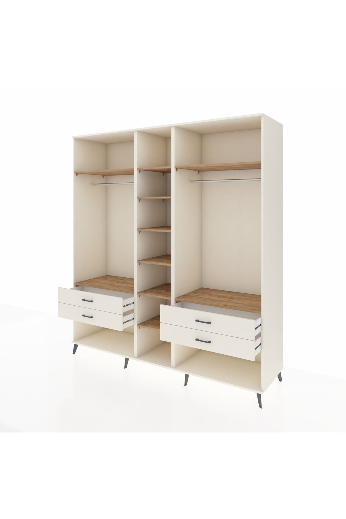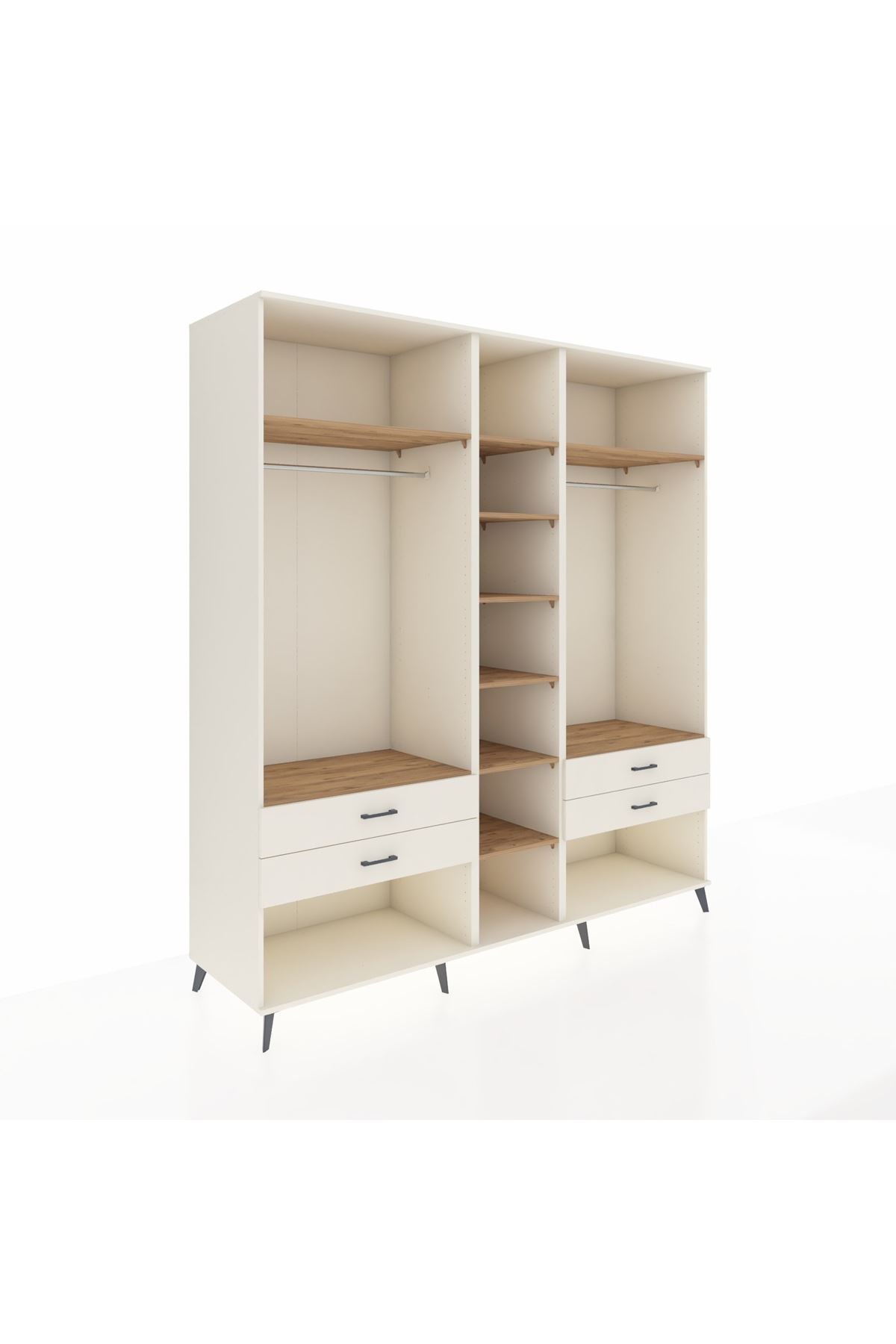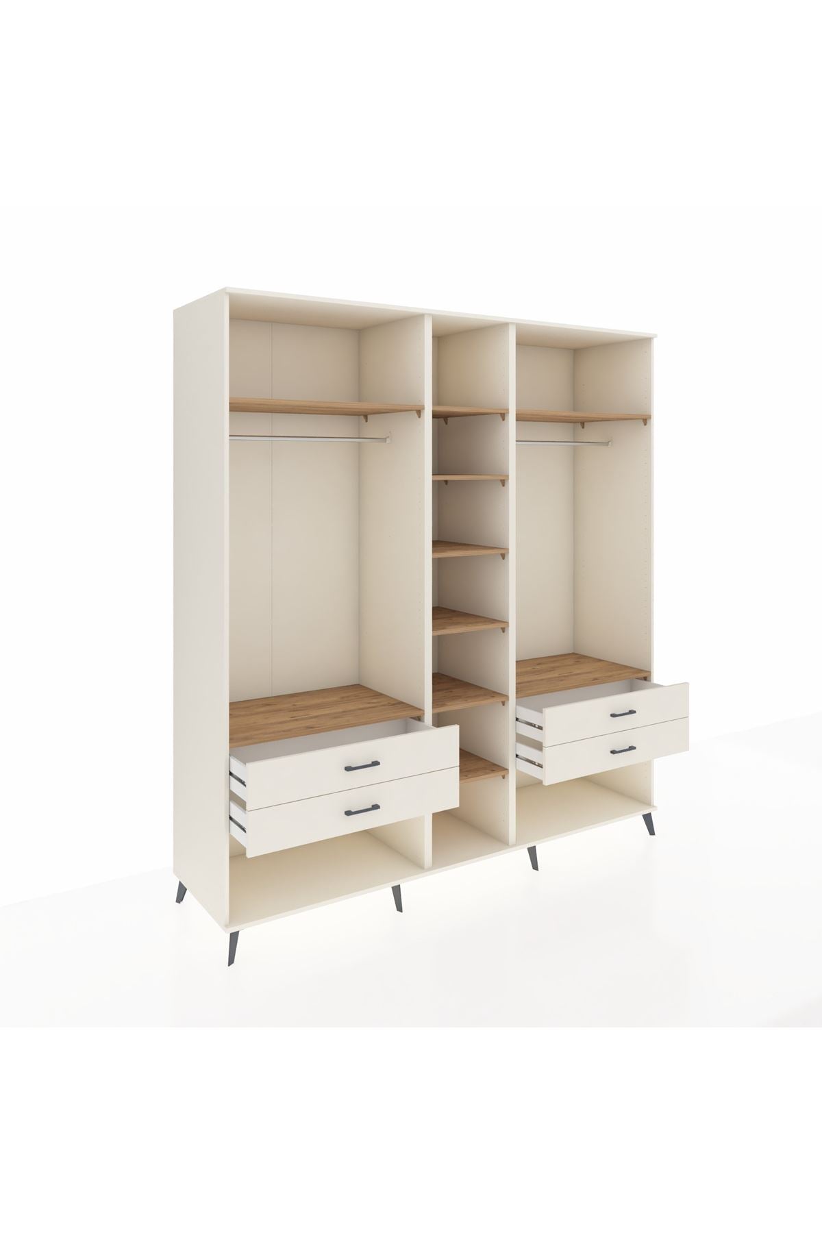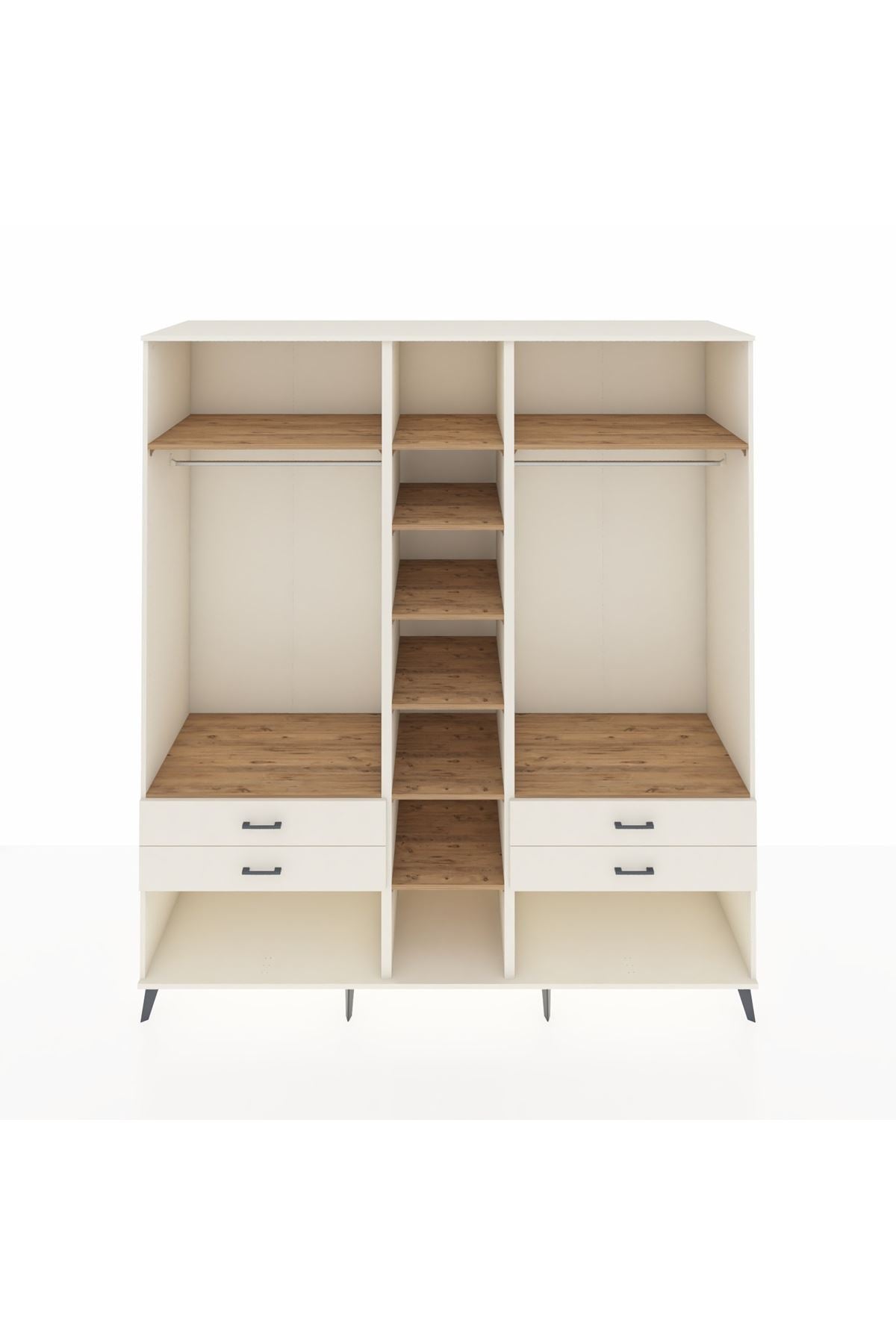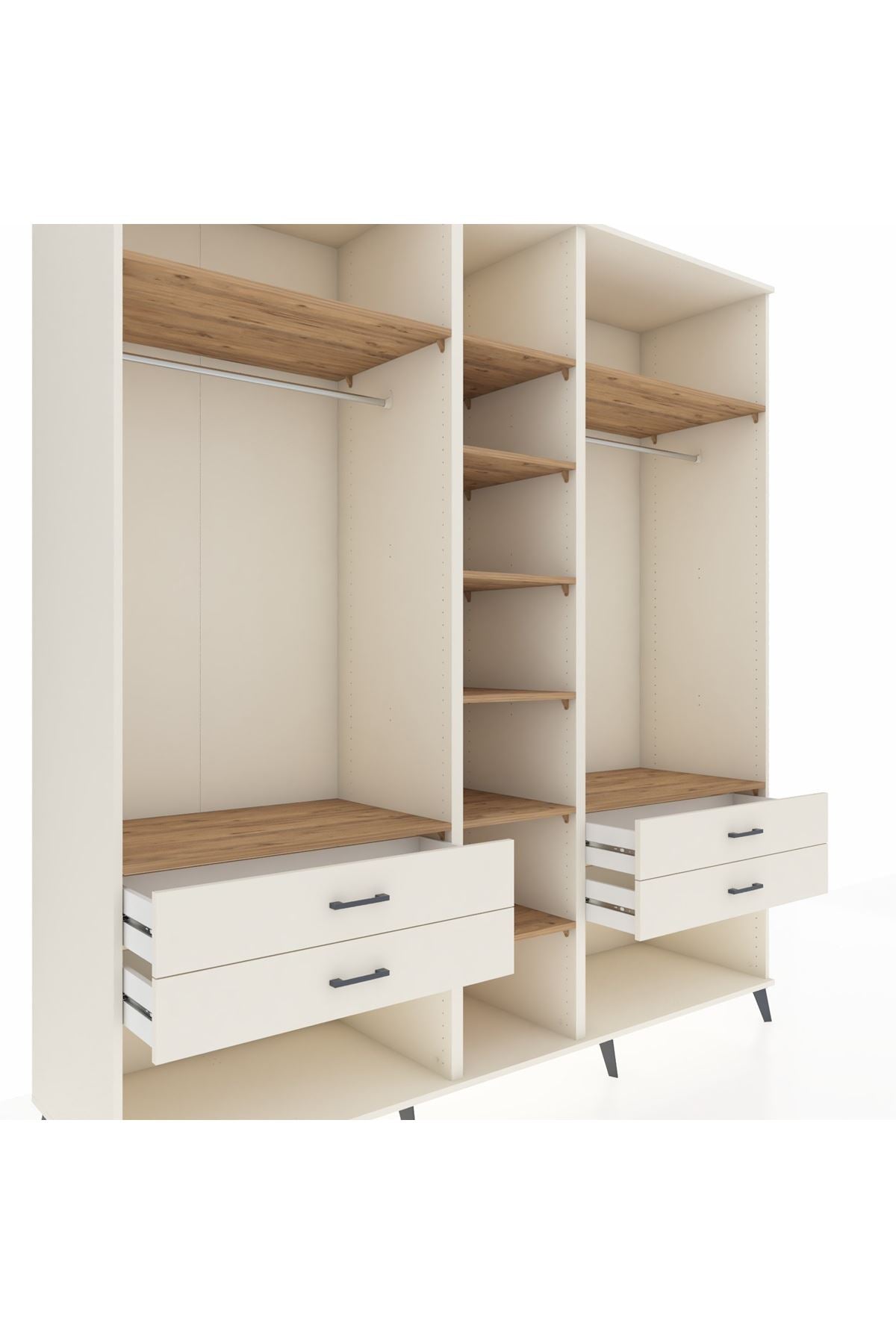 💪 10 güçlü raf, iki askı alanı ve dört geniş çekmeceli yapısıyla, çok amaçlı bir depolama sihirbazı olarak öne çıkıyor. Çekmeceler 27 cm açılma mesafesi sunar. Bu sayede, büyük eşyaları dahi rahatça yerleştirebilir ve aradıklarınızı hızla bulursunuz.