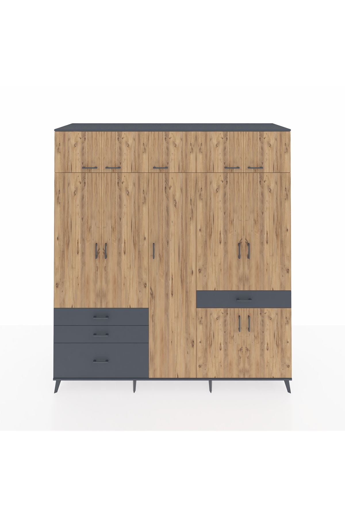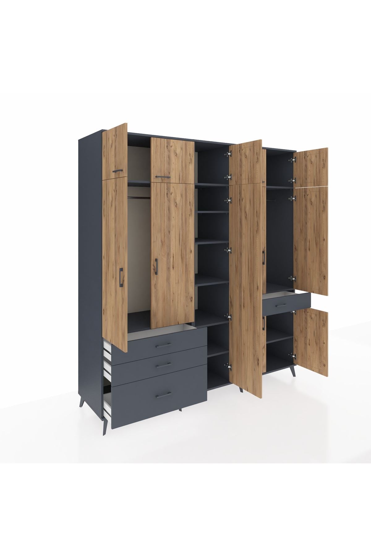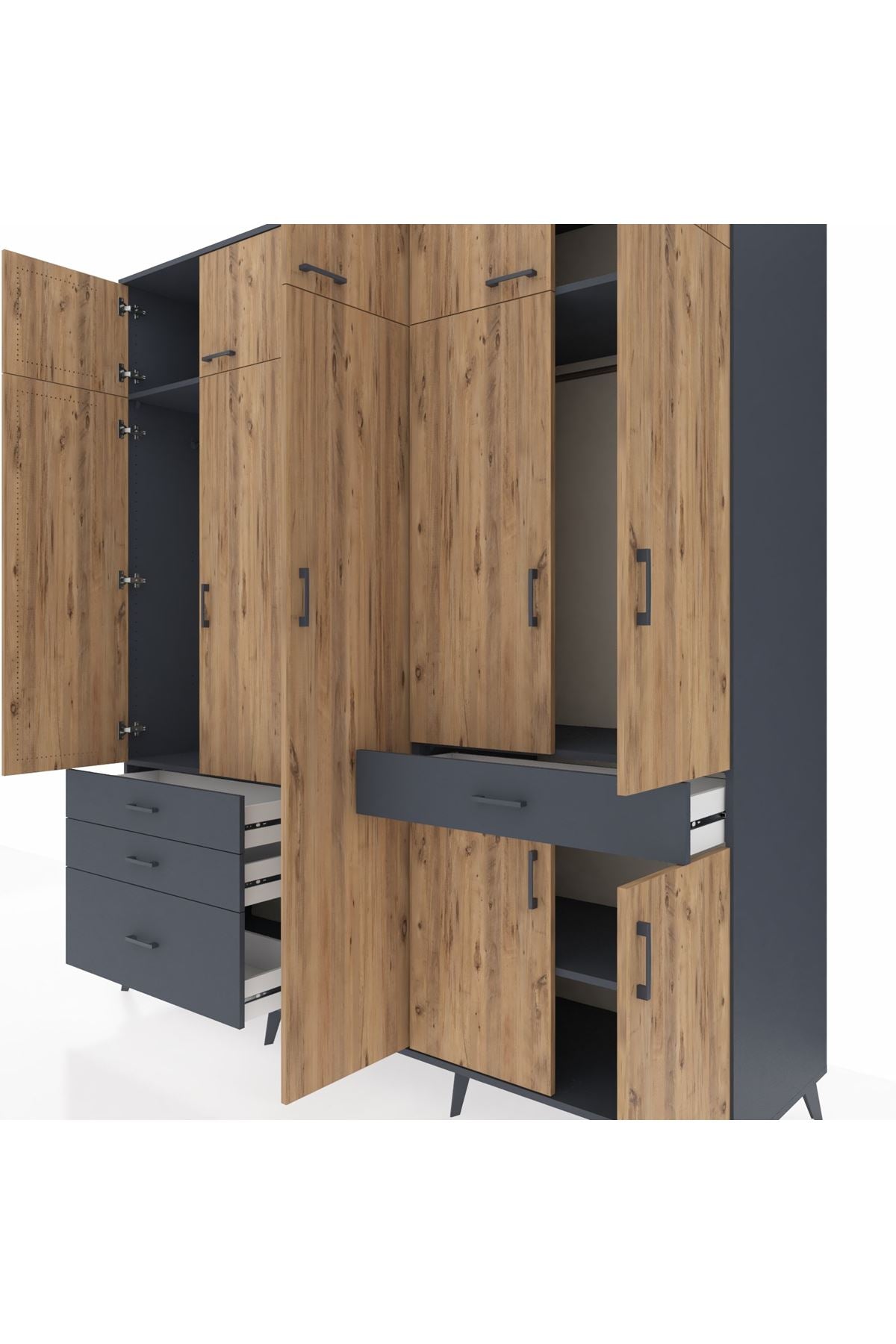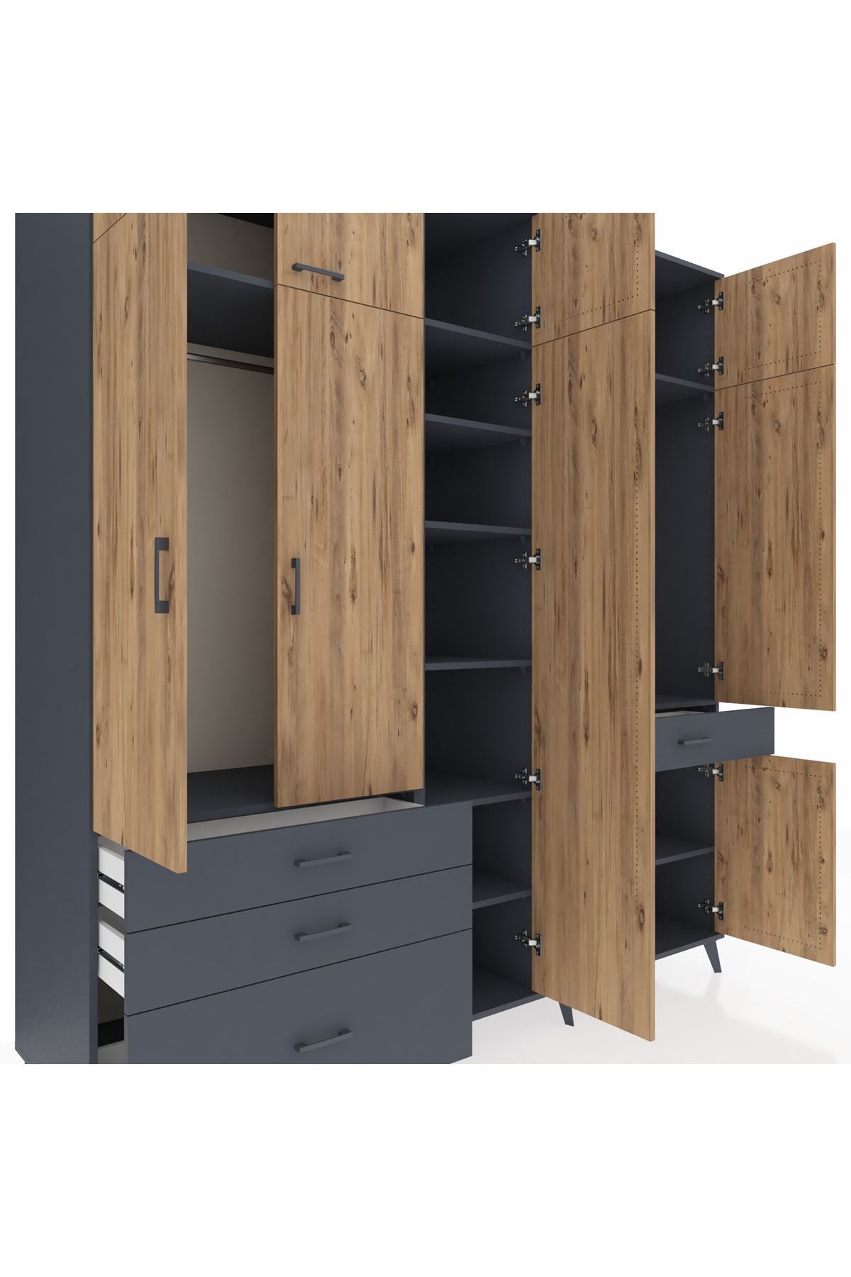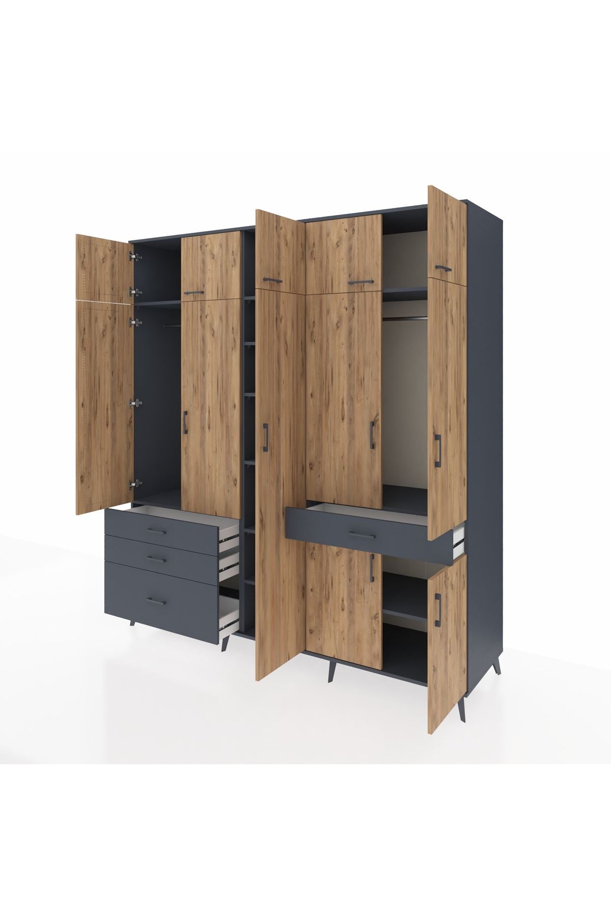 Kronos Dolap 11 Raflı 4 Çekmeceli 2 Askılı 220x59x243 Antrasit-Çam/Antrasit