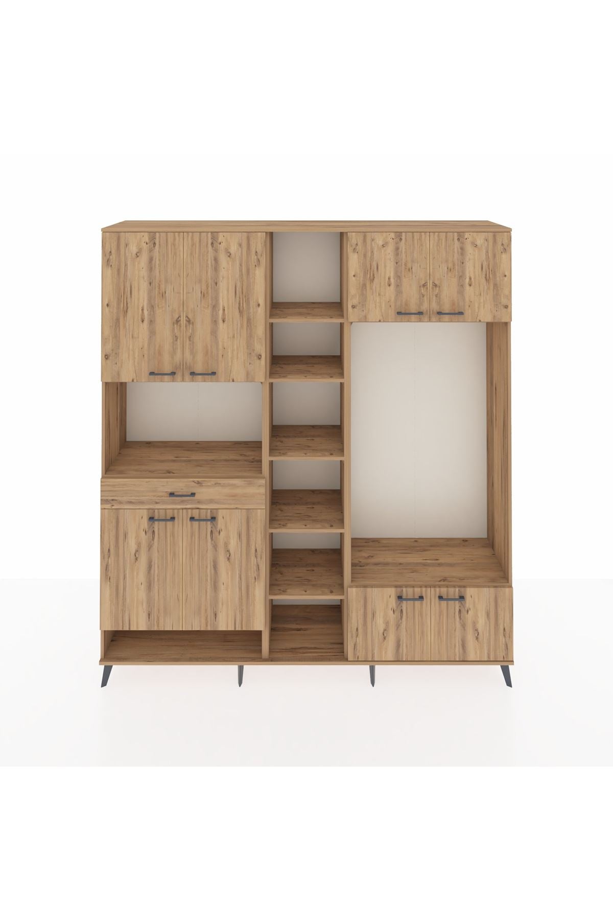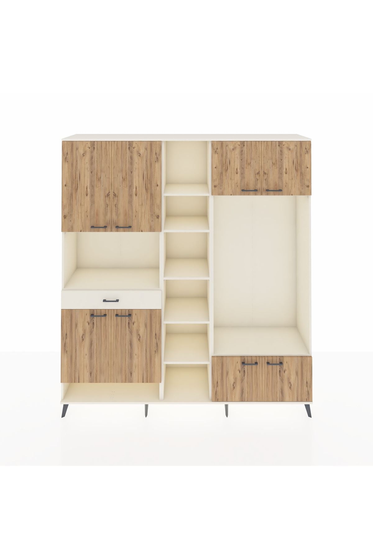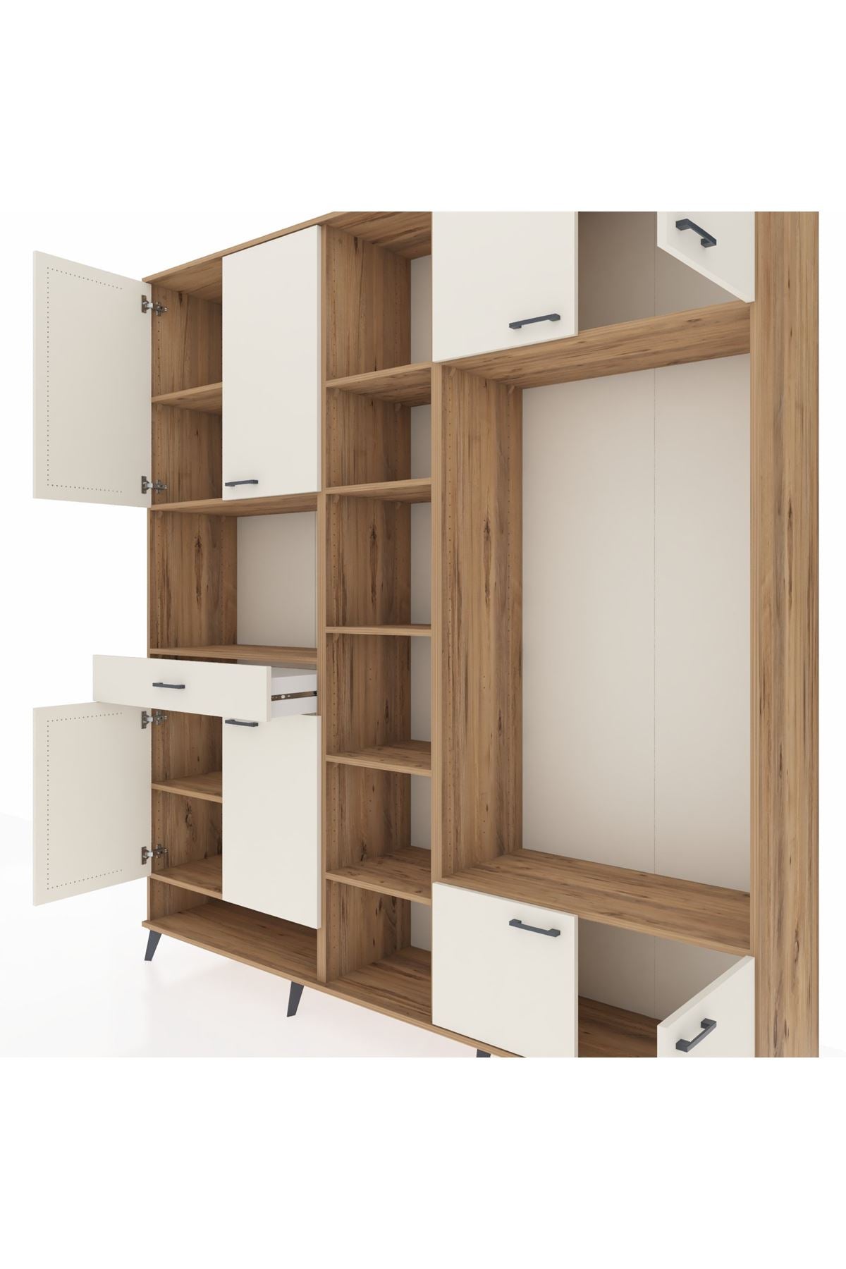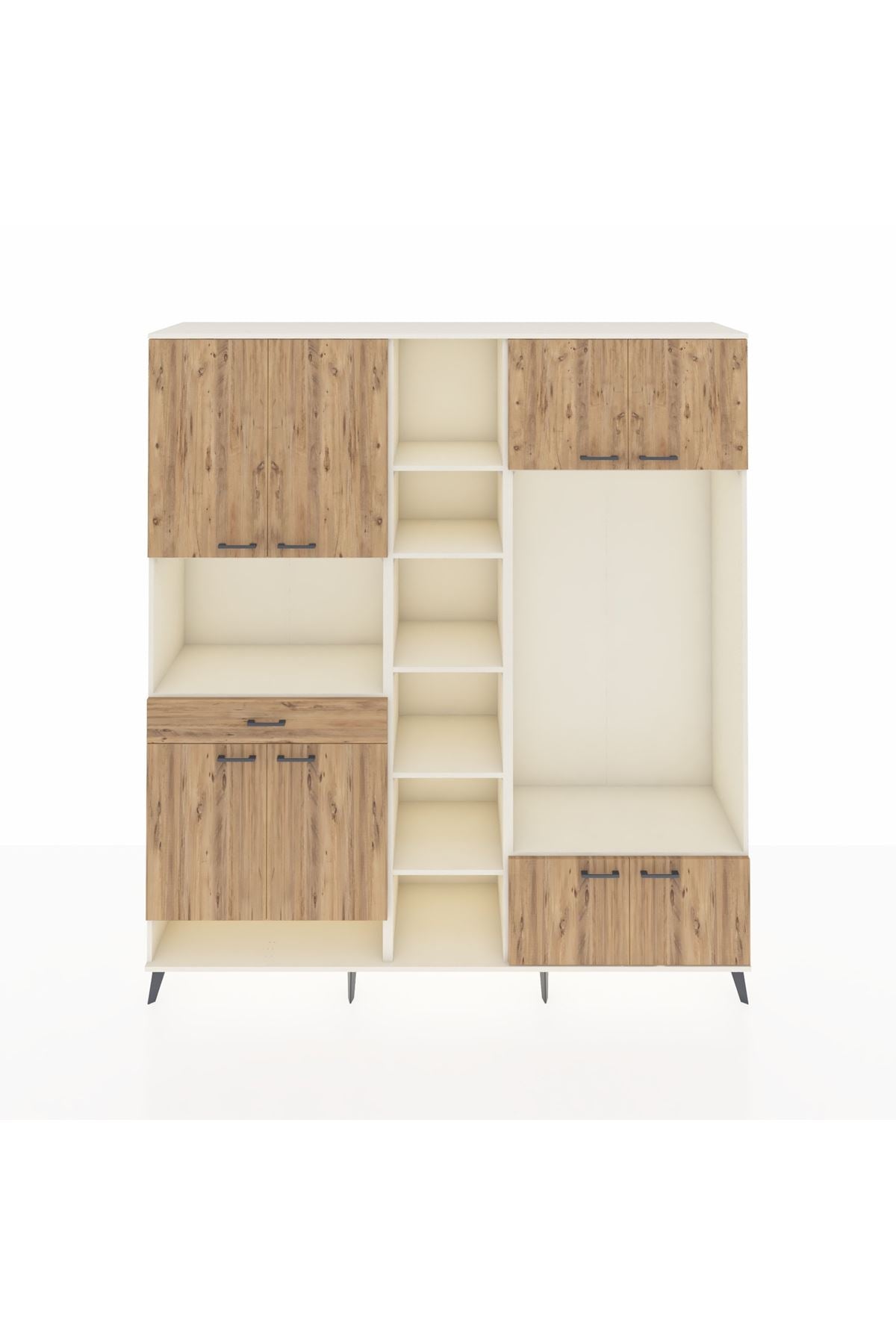 🦾 Metal ayaklar, dolaba modern bir hava katarken aynı zamanda yerden yüksek yapısıyla temizlik kolaylığı sağlar. Metal kulplar ise dolabın genel tasarımını tamamlayarak estetik bir bütünlük oluşturur.
