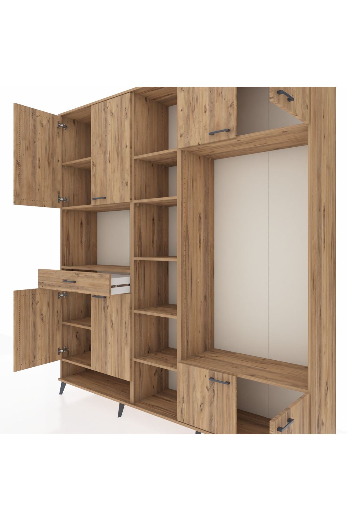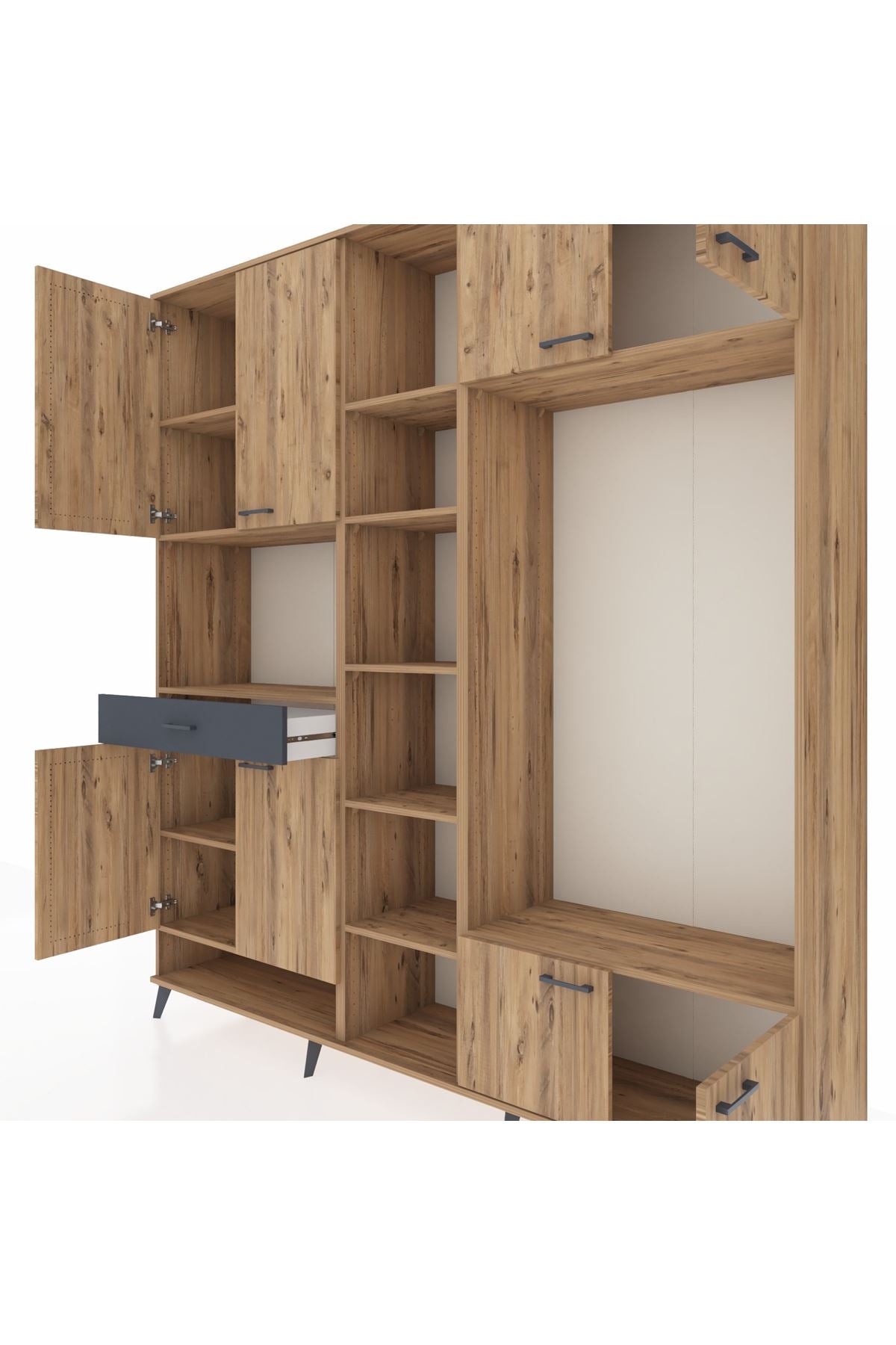 Sadece kıyafetleriniz için değil, kitaplarınızı ve diğer dekoratif eşyalarınızı sergilemek için de kullanabileceğiniz Hyperion dolap, yaşam alanınıza estetik bir dokunuş katar. 12 adet rafı sayesinde geniş bir kitap koleksiyonunu barındırabilir.