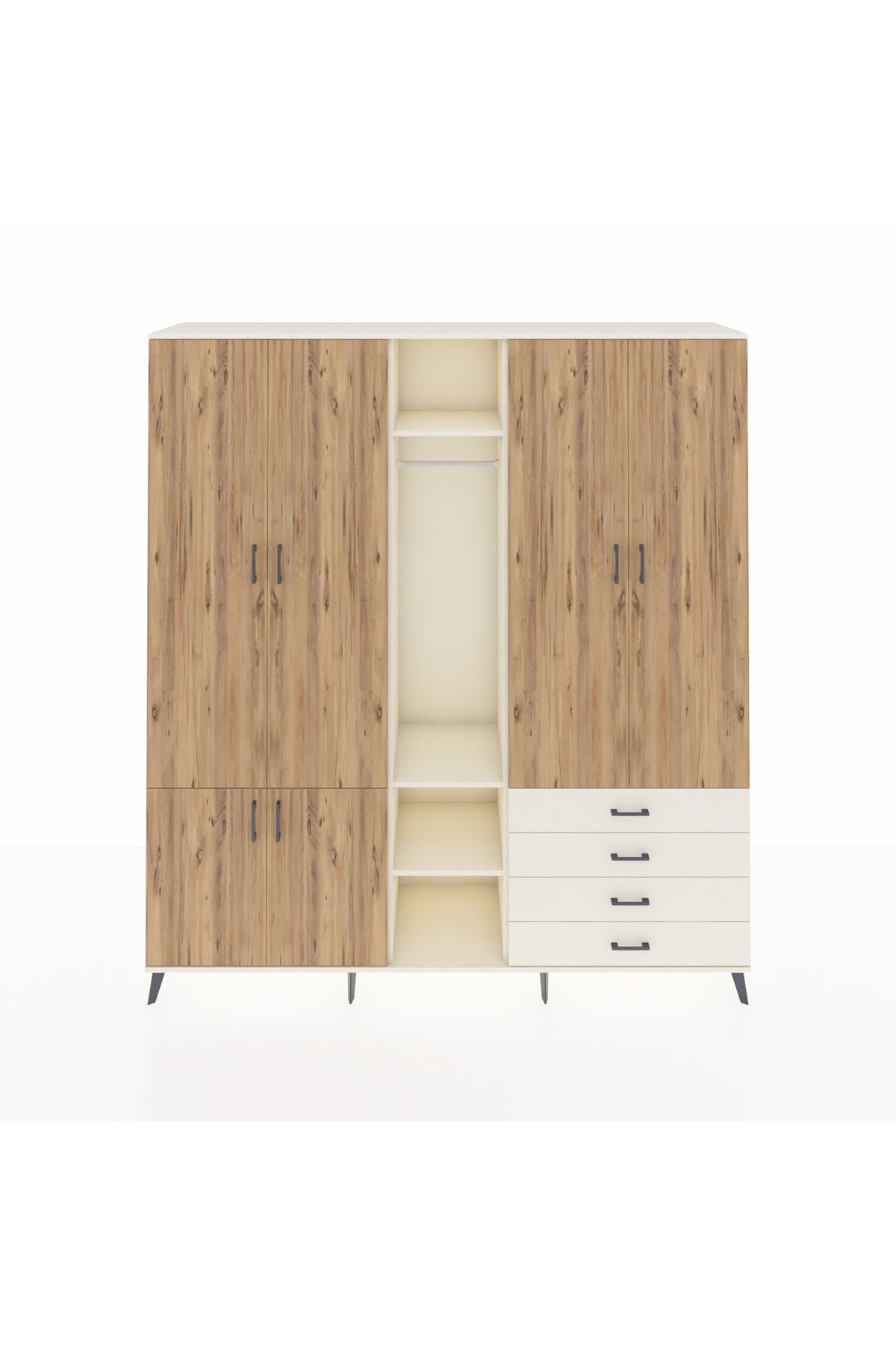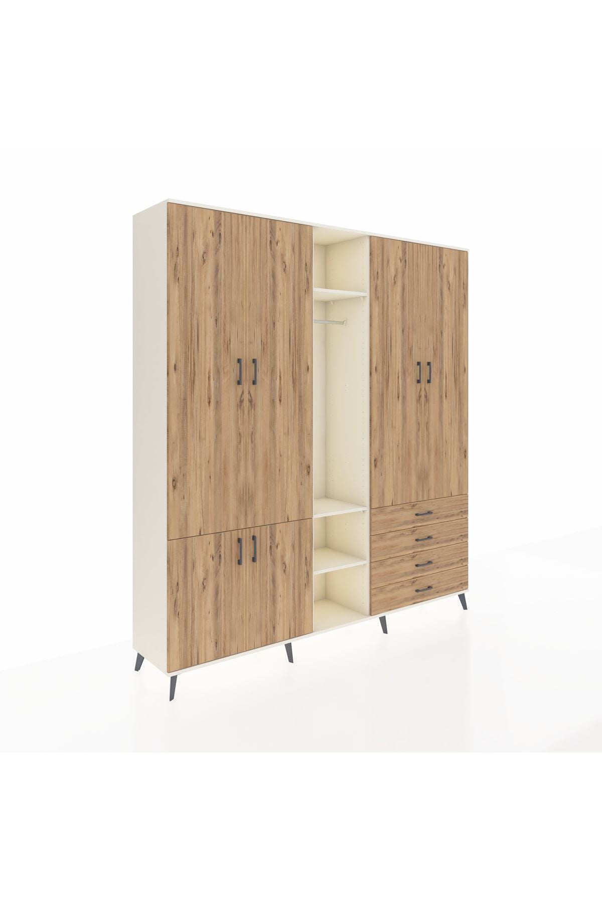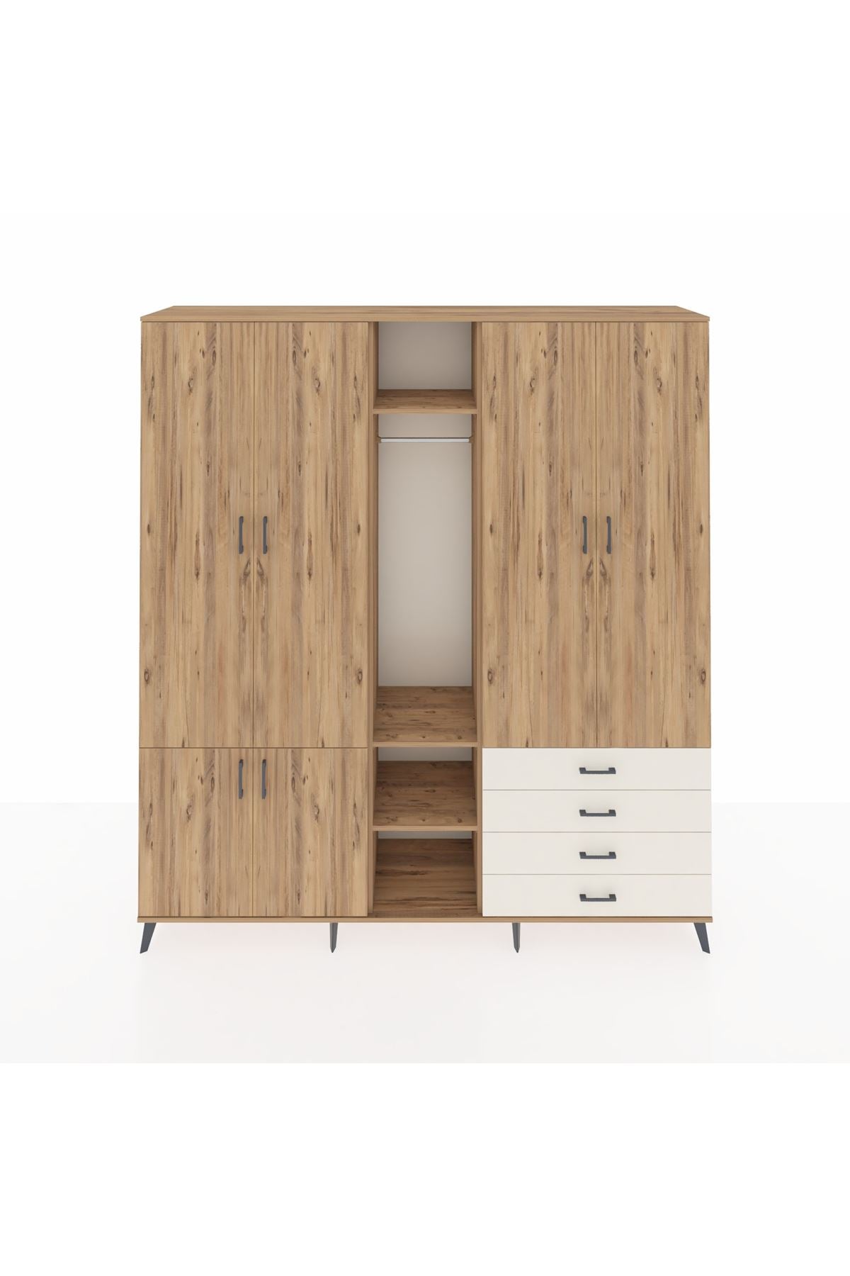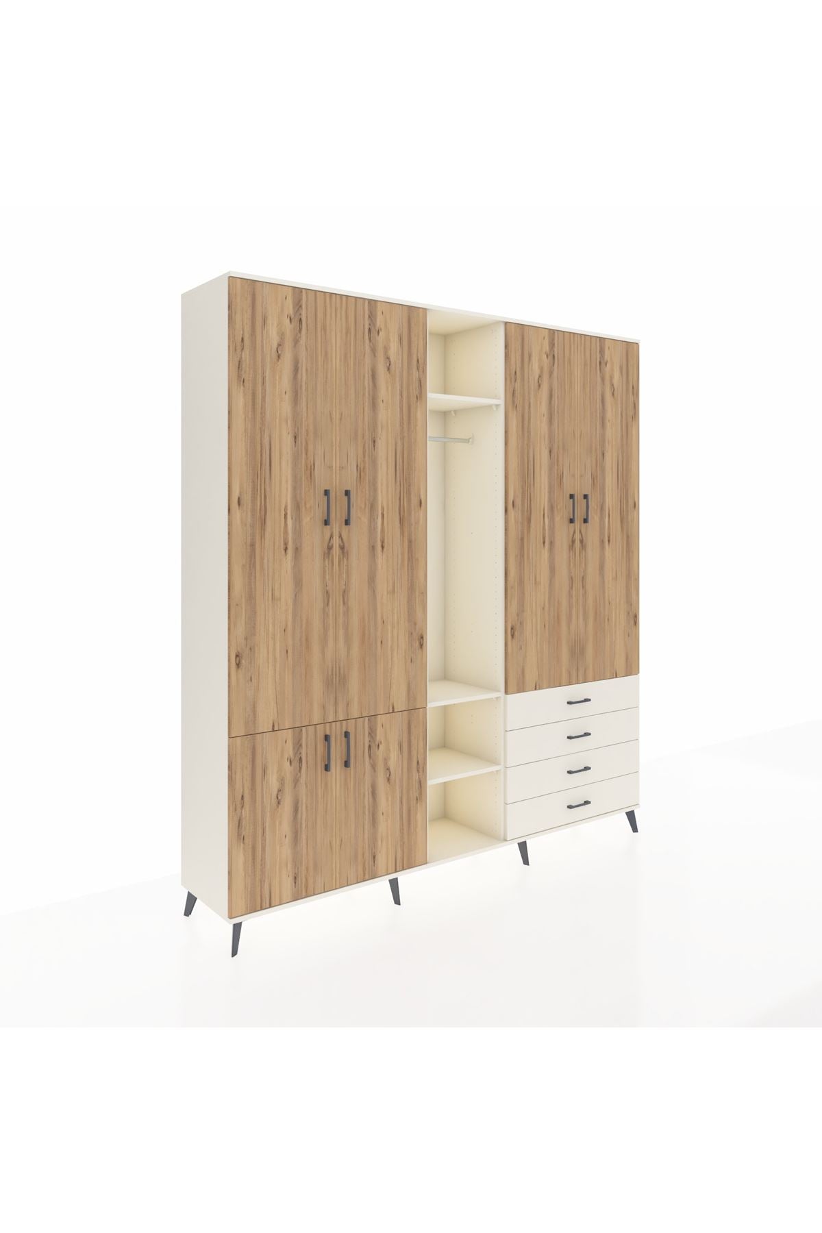 🦾 Metal ayaklar, dolaba modern bir görünüm kazandırırken, aynı zamanda sağlam bir temel oluşturur. Metal kulplar ise, dolabın açılıp kapanmasını kolaylaştırır ve şık bir detay olarak öne çıkar.