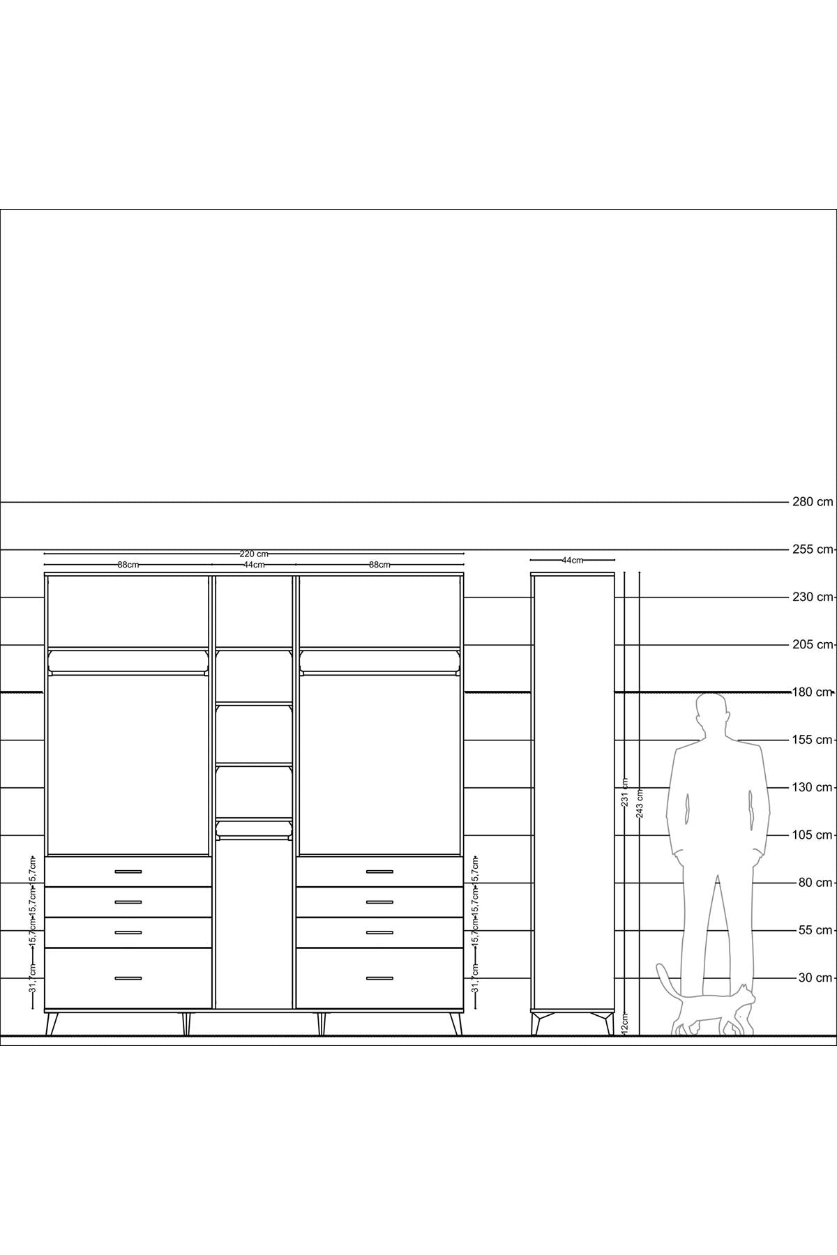 📌 Hyperion Dolap 8 Raflı 8 Çekmeceli 3 Askılı 220x44x243
