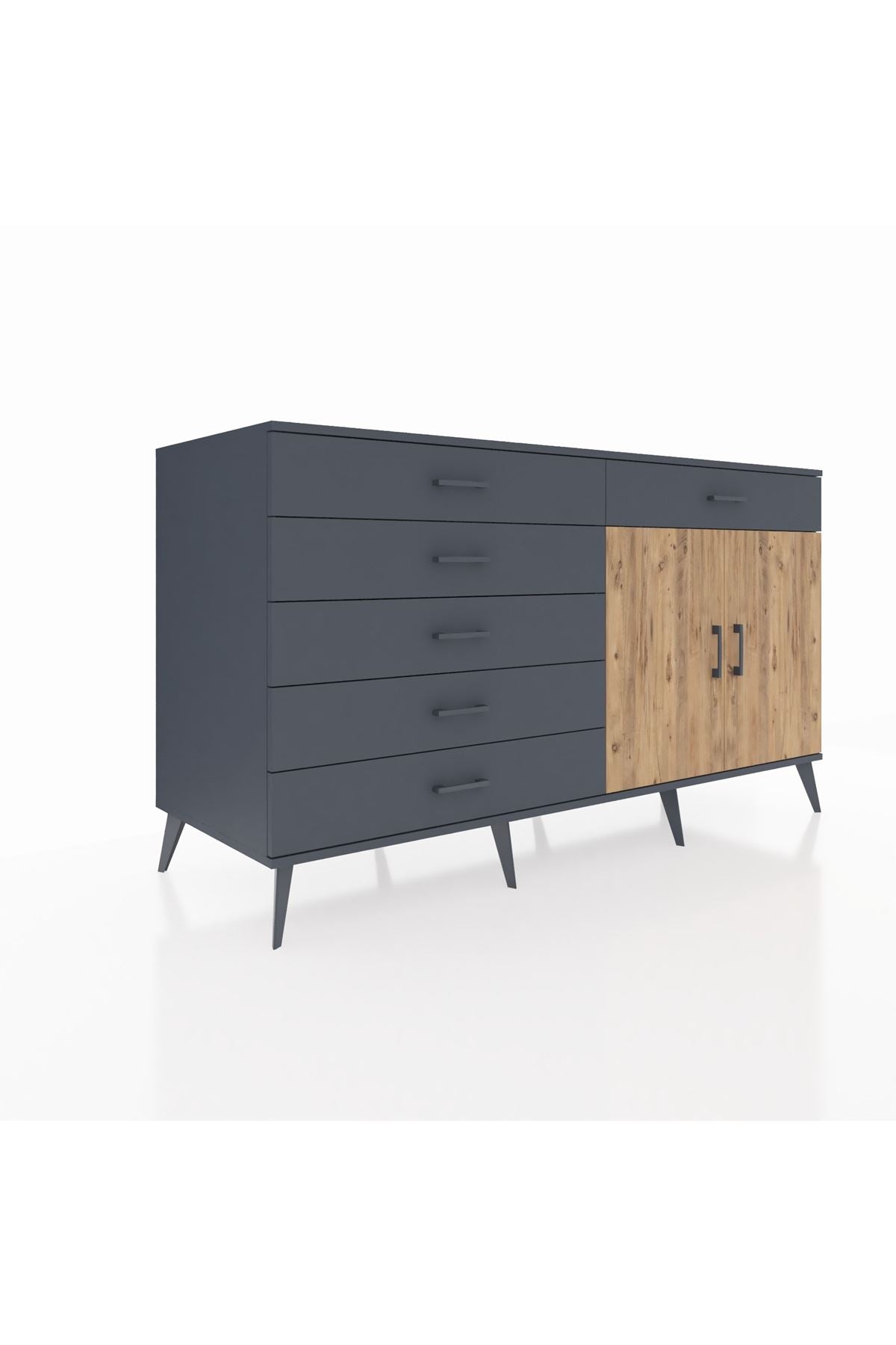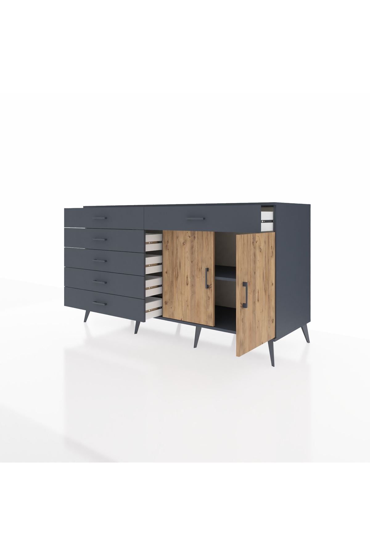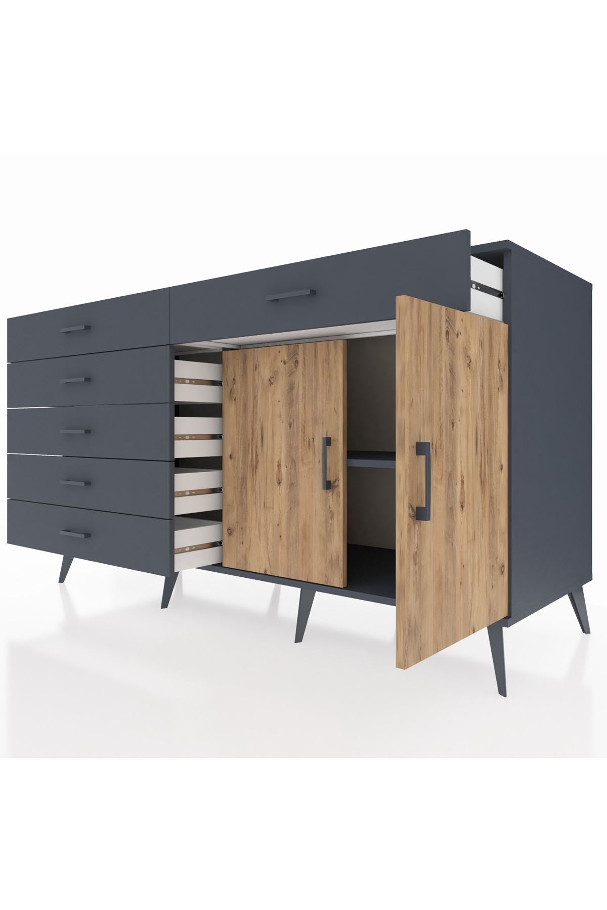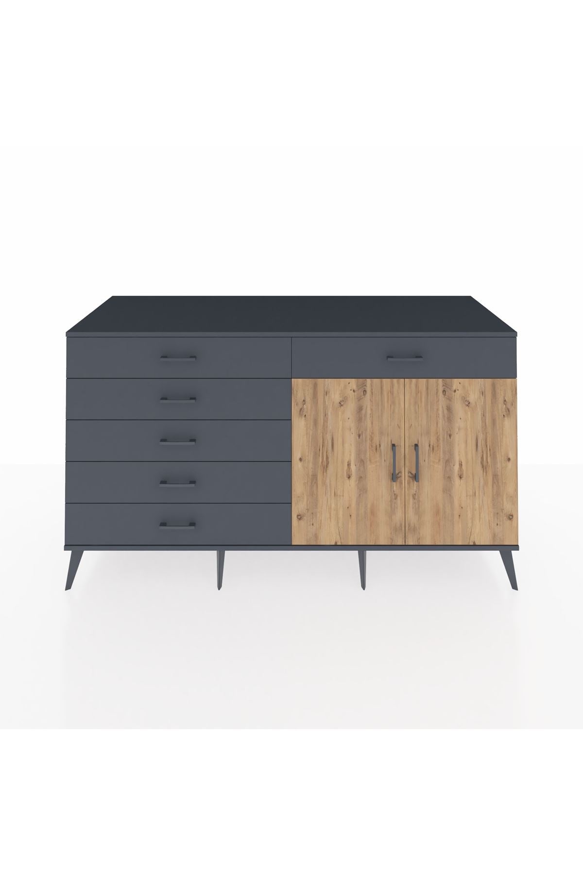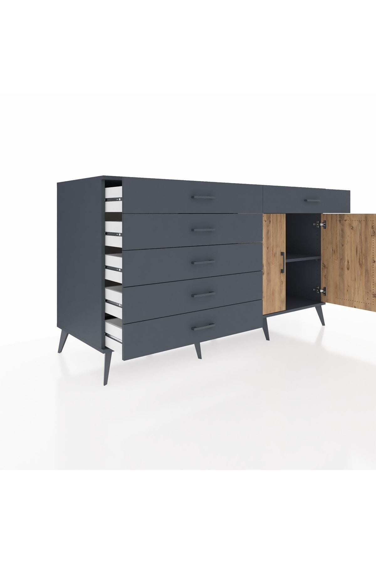 Kronos Konsol Tek Raflı 6 Çekmeceli 2 Kapaklı 176x59x99 Antrasit-Çam/Antrasit