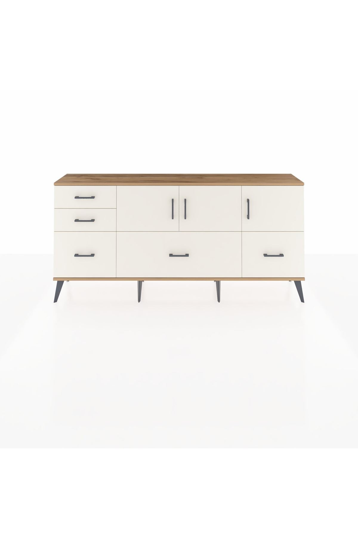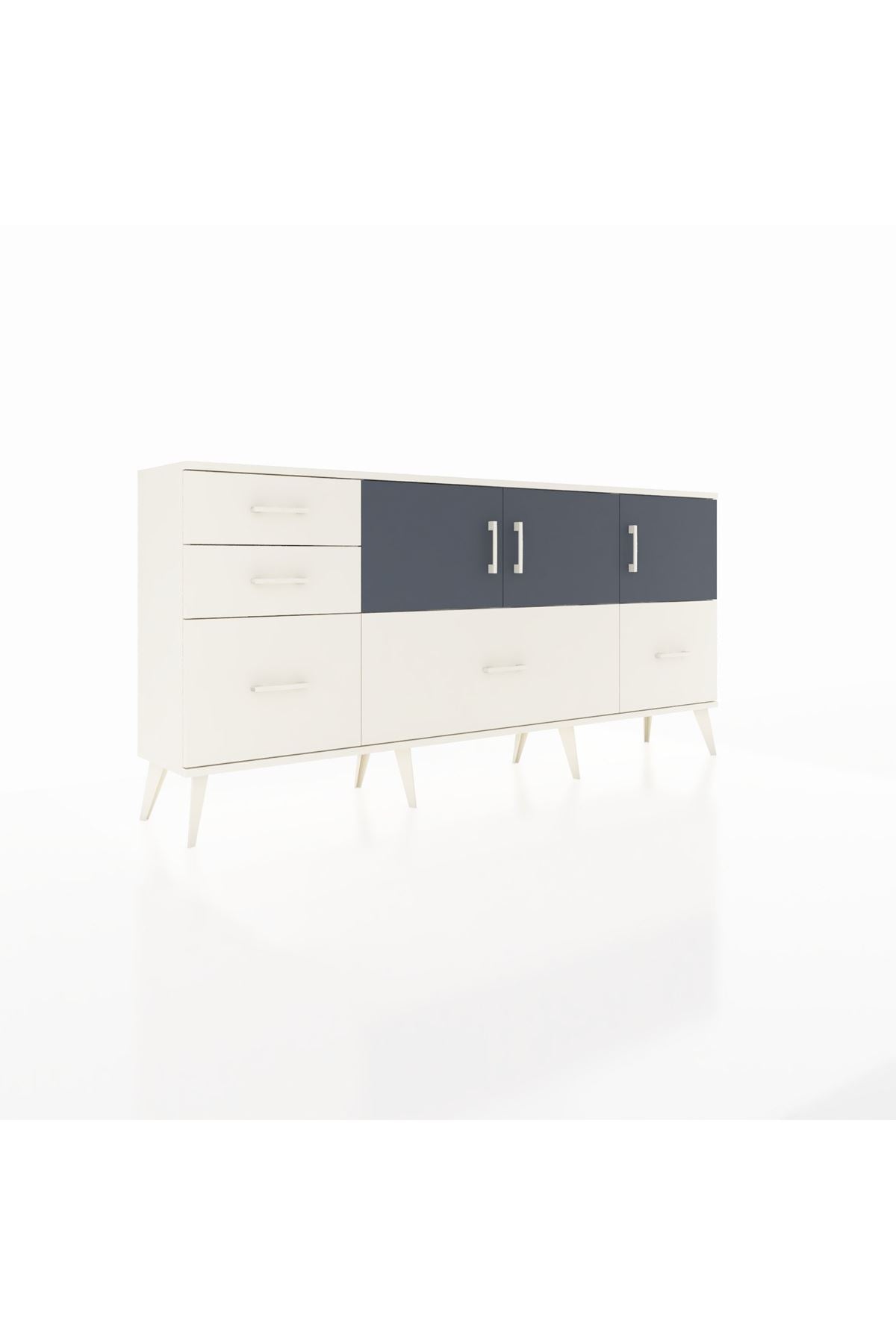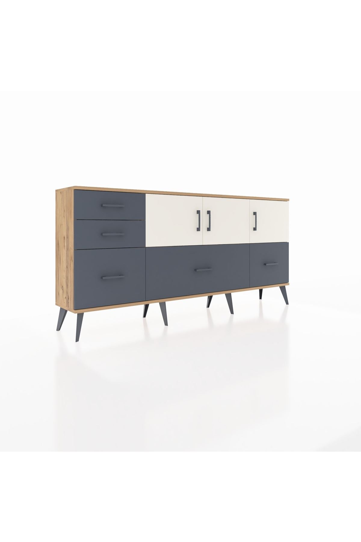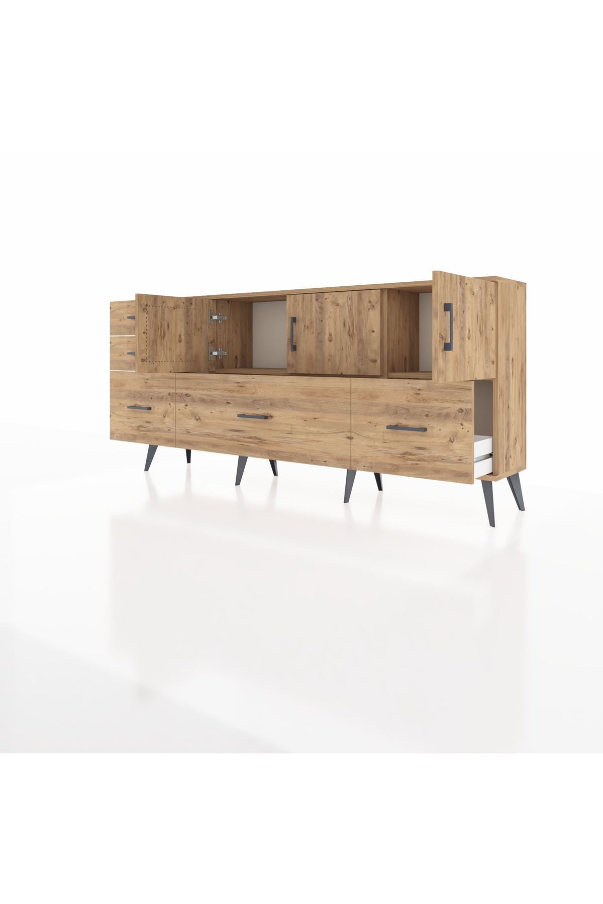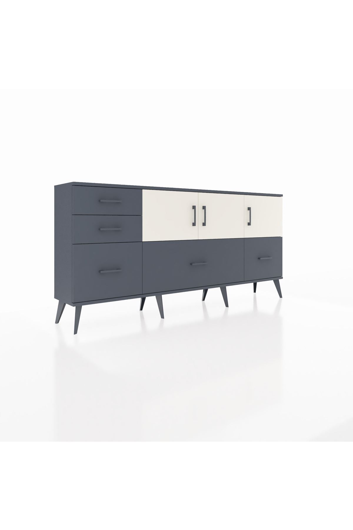 ✨ Arges Konsol 2 Raflı 5 Çekmeceli 3 Kapaklı (176x30x83 cm) ile yaşam alanlarınıza şıklık ve düzen katın! Fonksiyonel tasarımı ve modern görünümü ile bu konsol, evinizin her köşesine uyum sağlayacak.