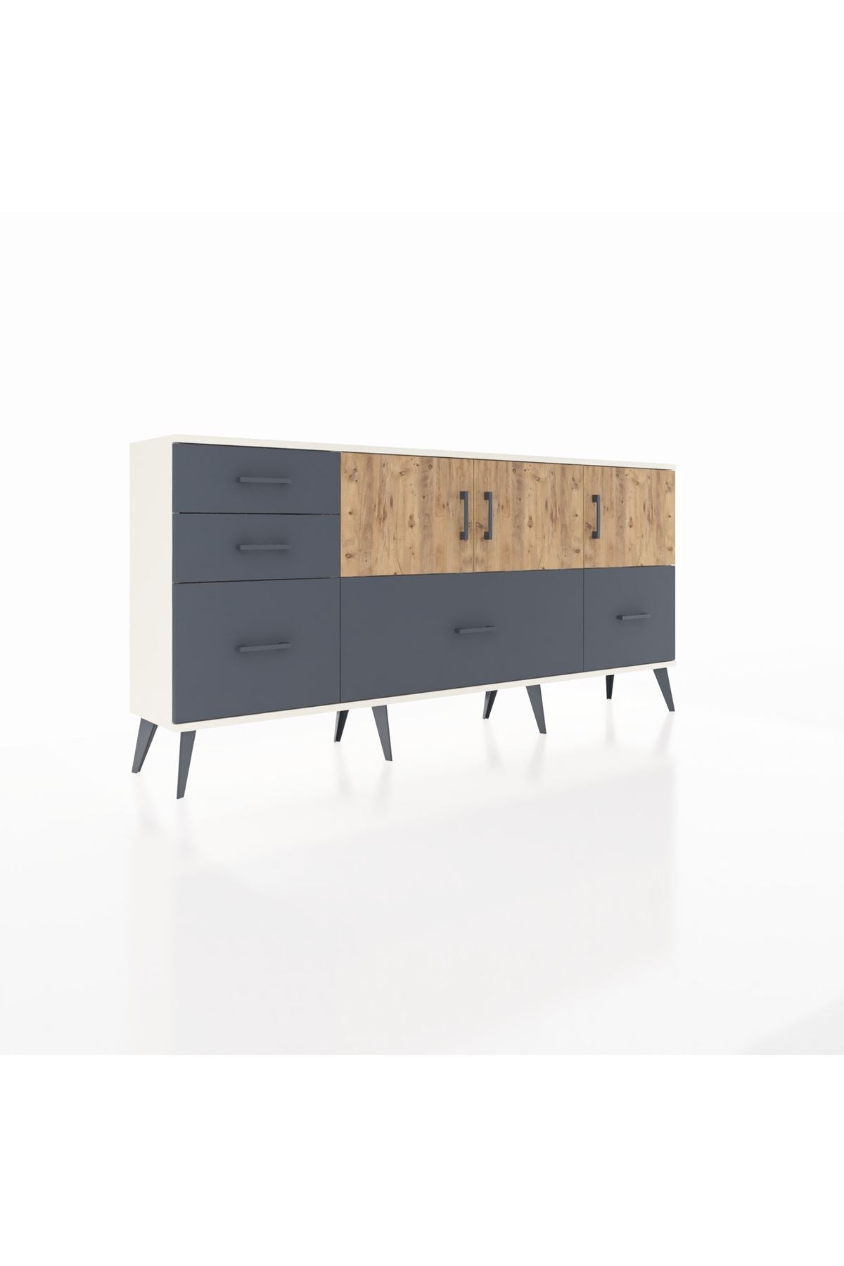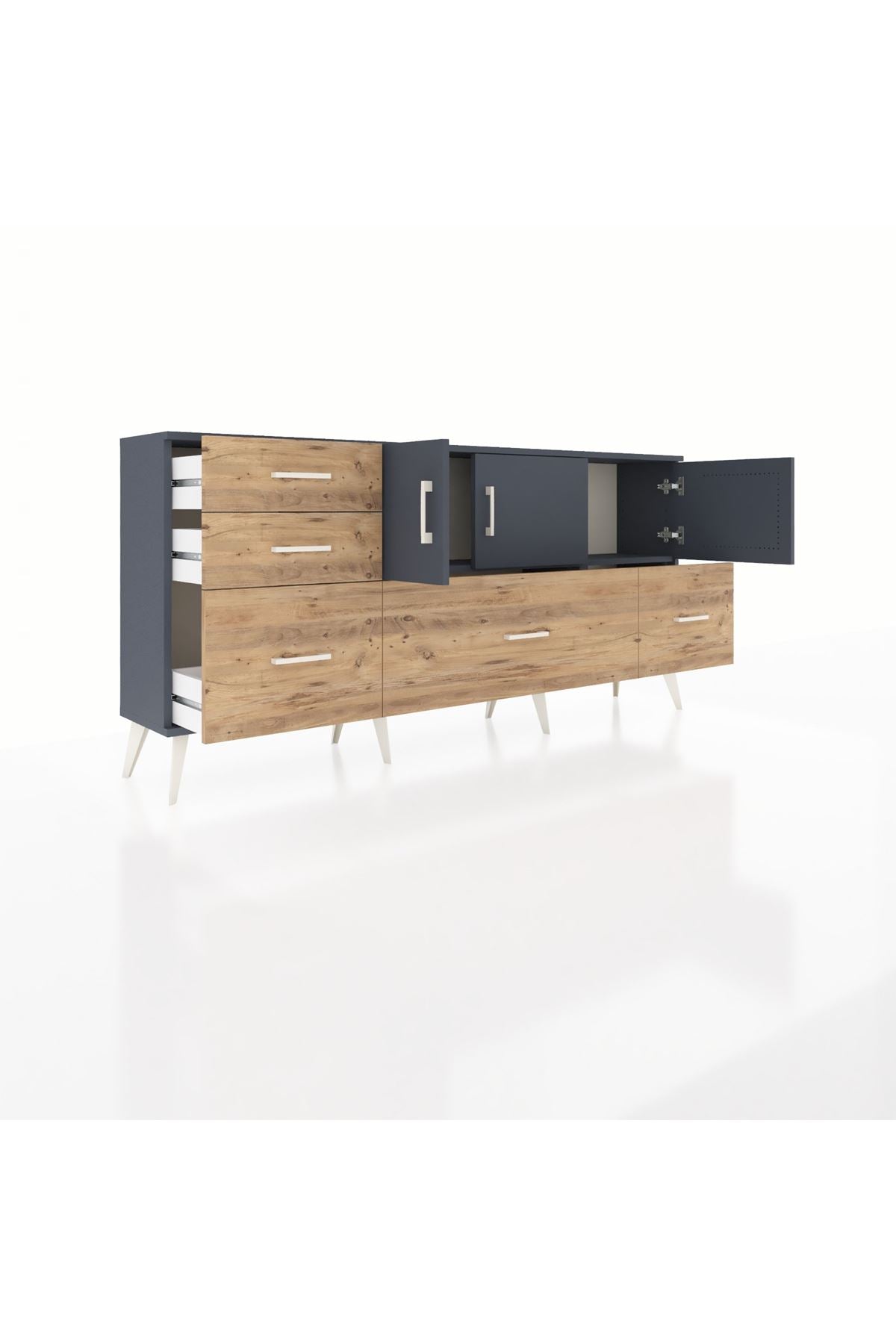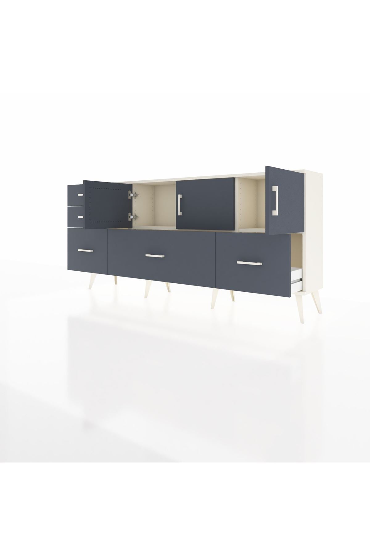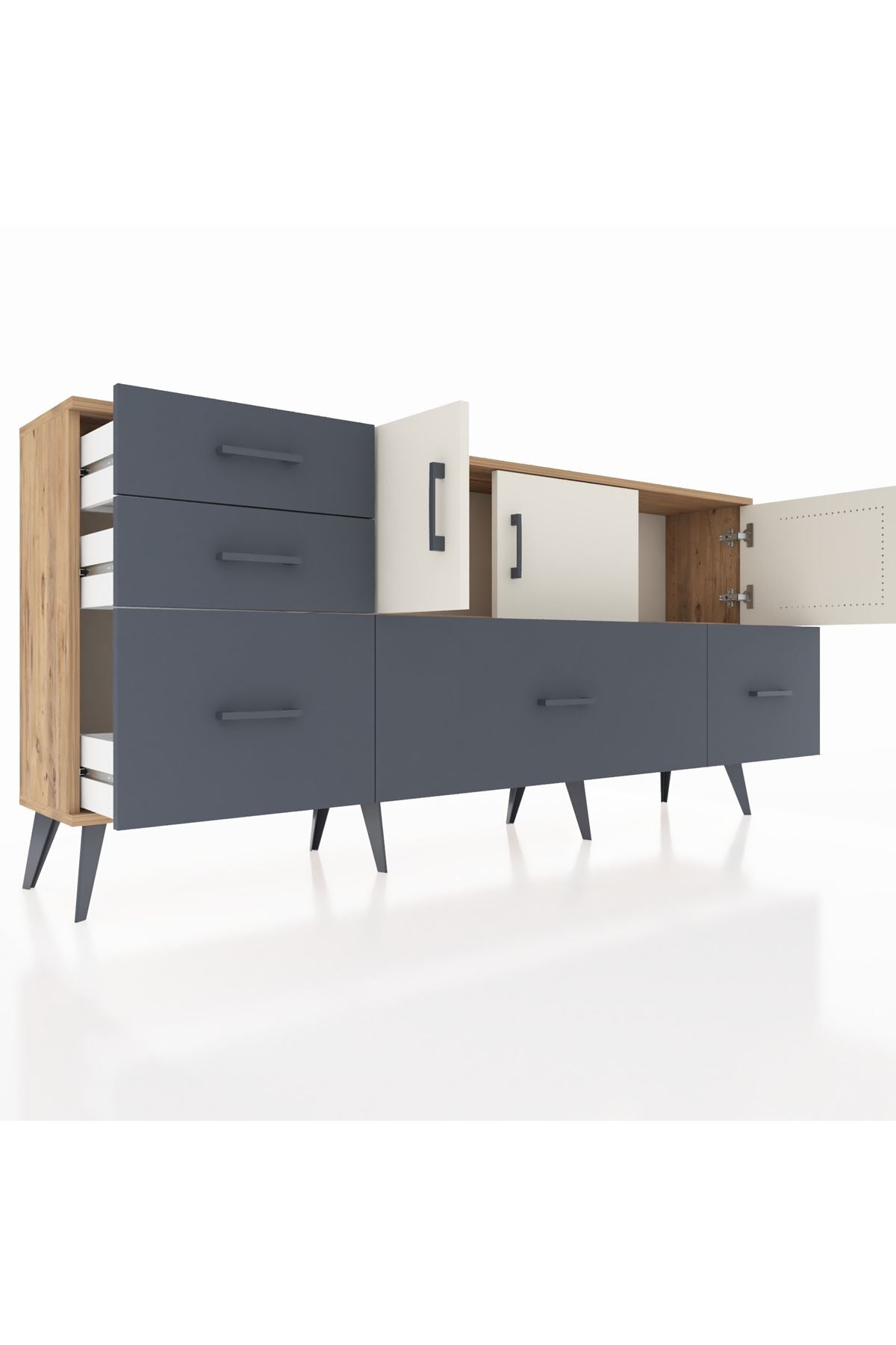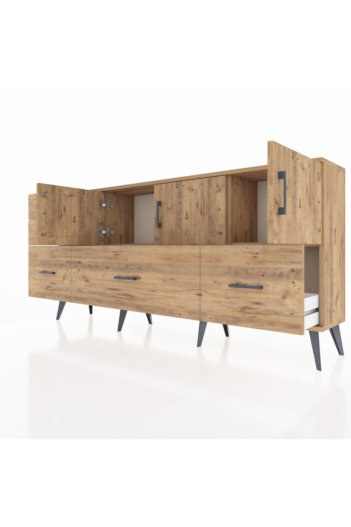 ✨ Arges Konsol 2 Raflı 5 Çekmeceli 3 Kapaklı (176x30x83 cm) ile yaşam alanlarınıza şıklık ve düzen katın! Fonksiyonel tasarımı ve modern görünümü ile bu konsol, evinizin her köşesine uyum sağlayacak.