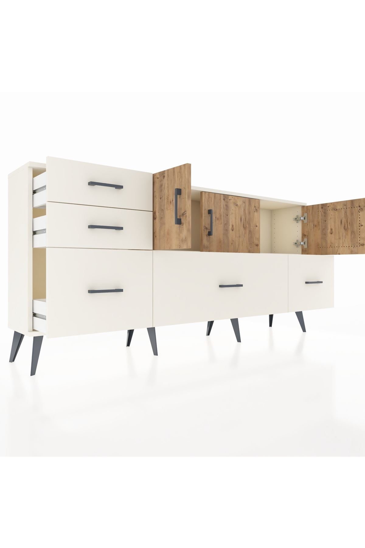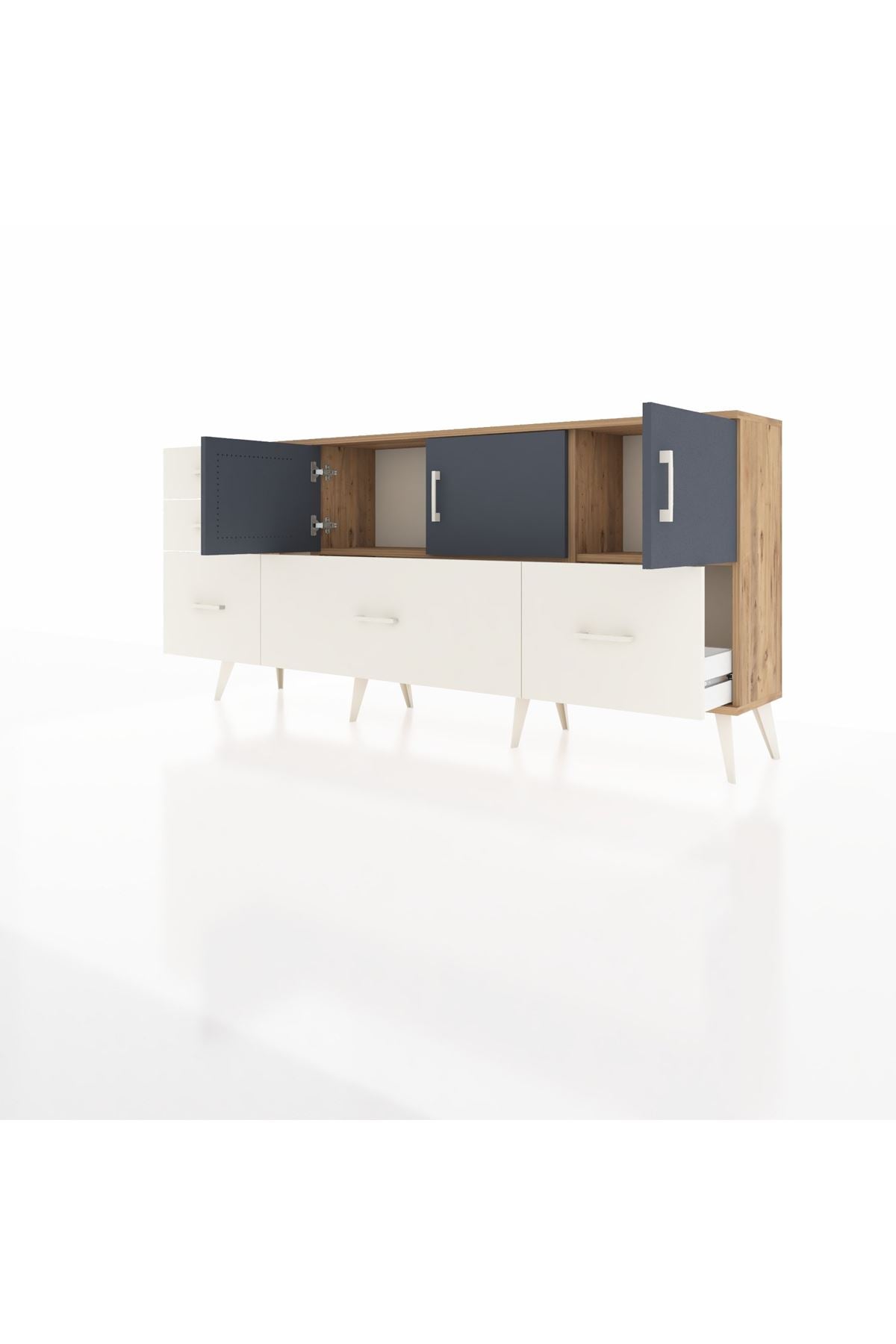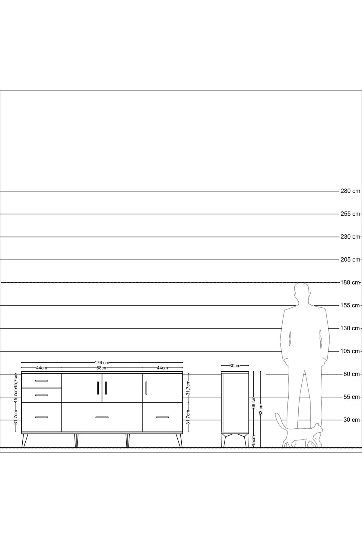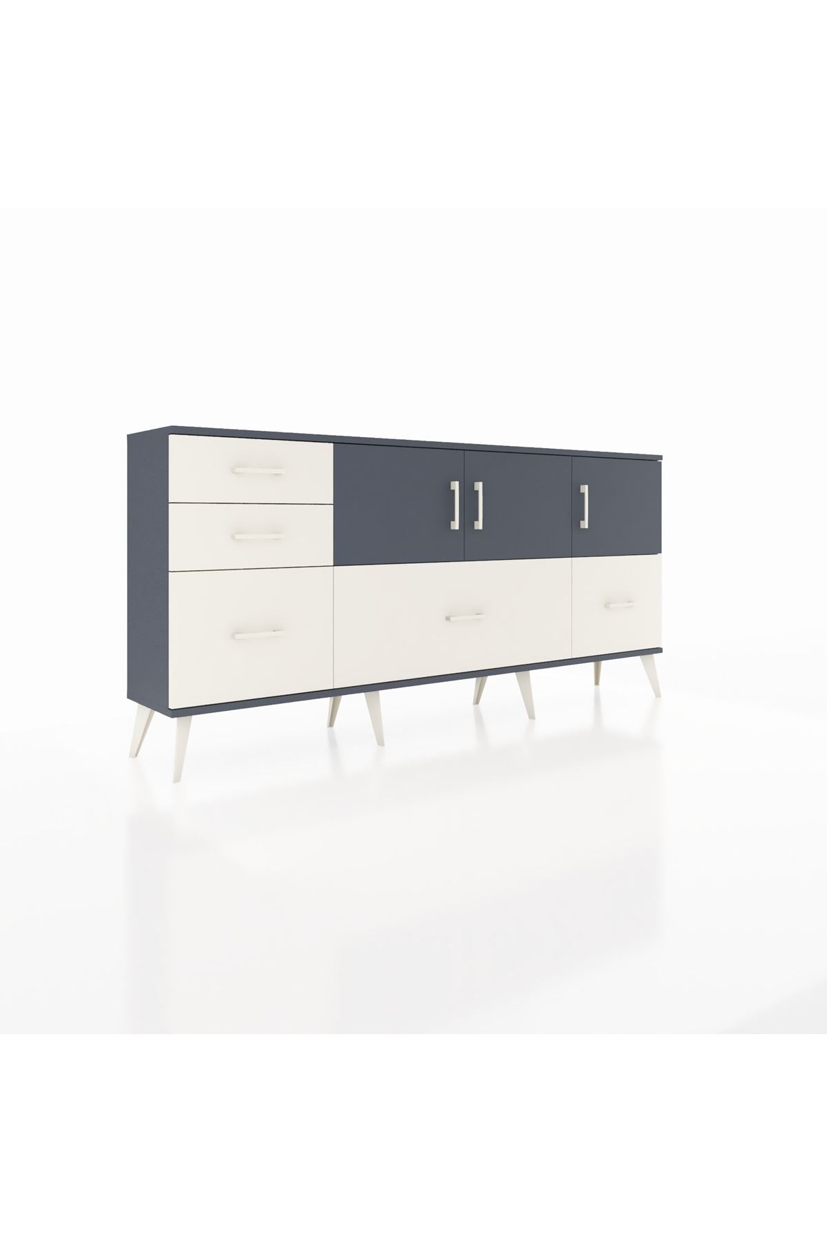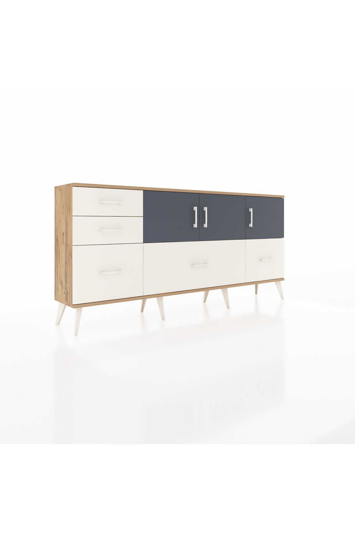 ✨ Arges Konsol 2 Raflı 5 Çekmeceli 3 Kapaklı (176x30x83 cm) ile yaşam alanlarınıza şıklık ve düzen katın! Fonksiyonel tasarımı ve modern görünümü ile bu konsol, evinizin her köşesine uyum sağlayacak.