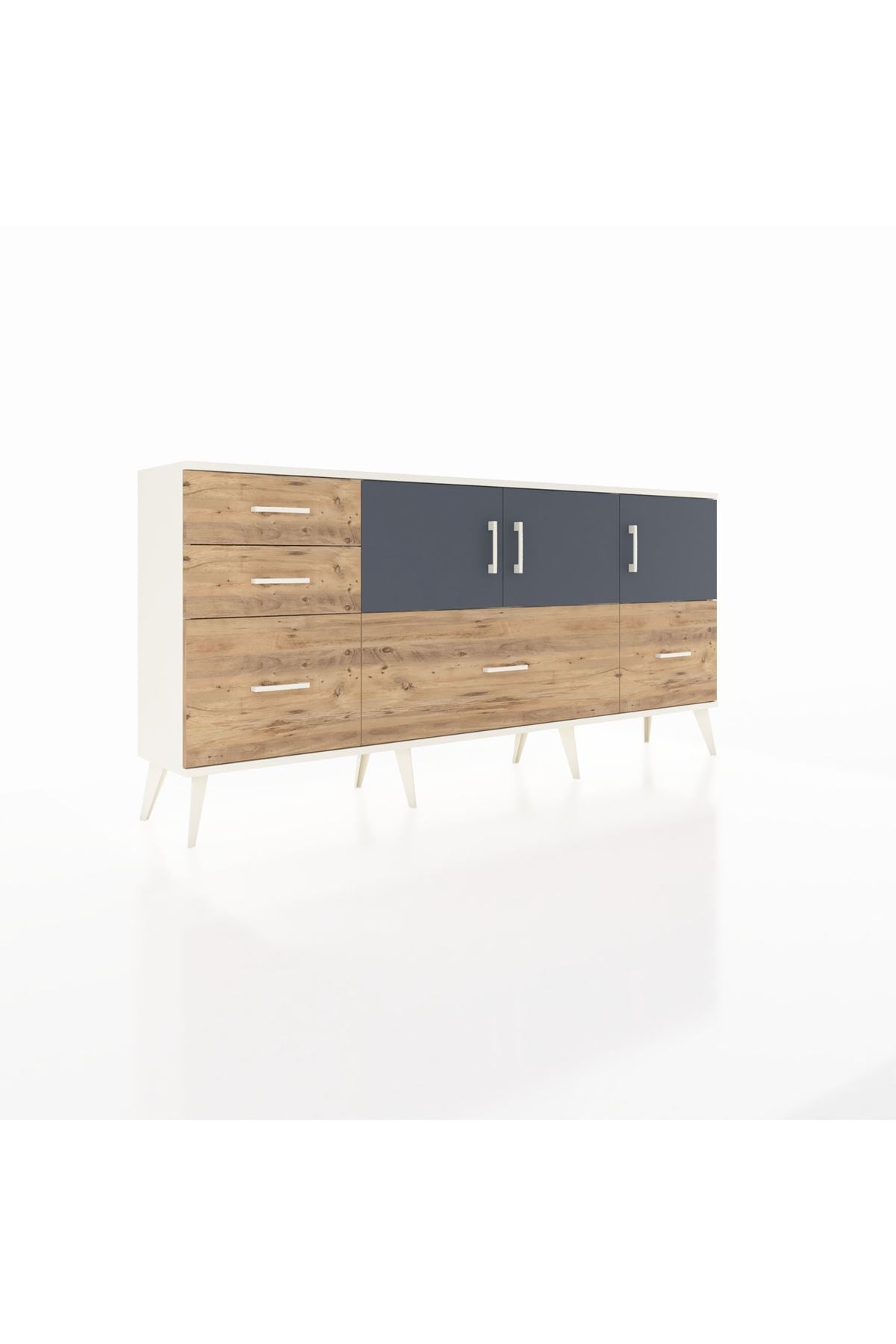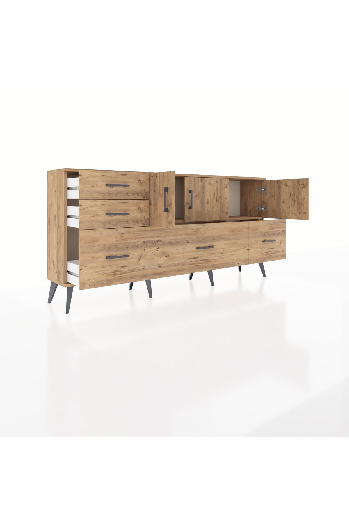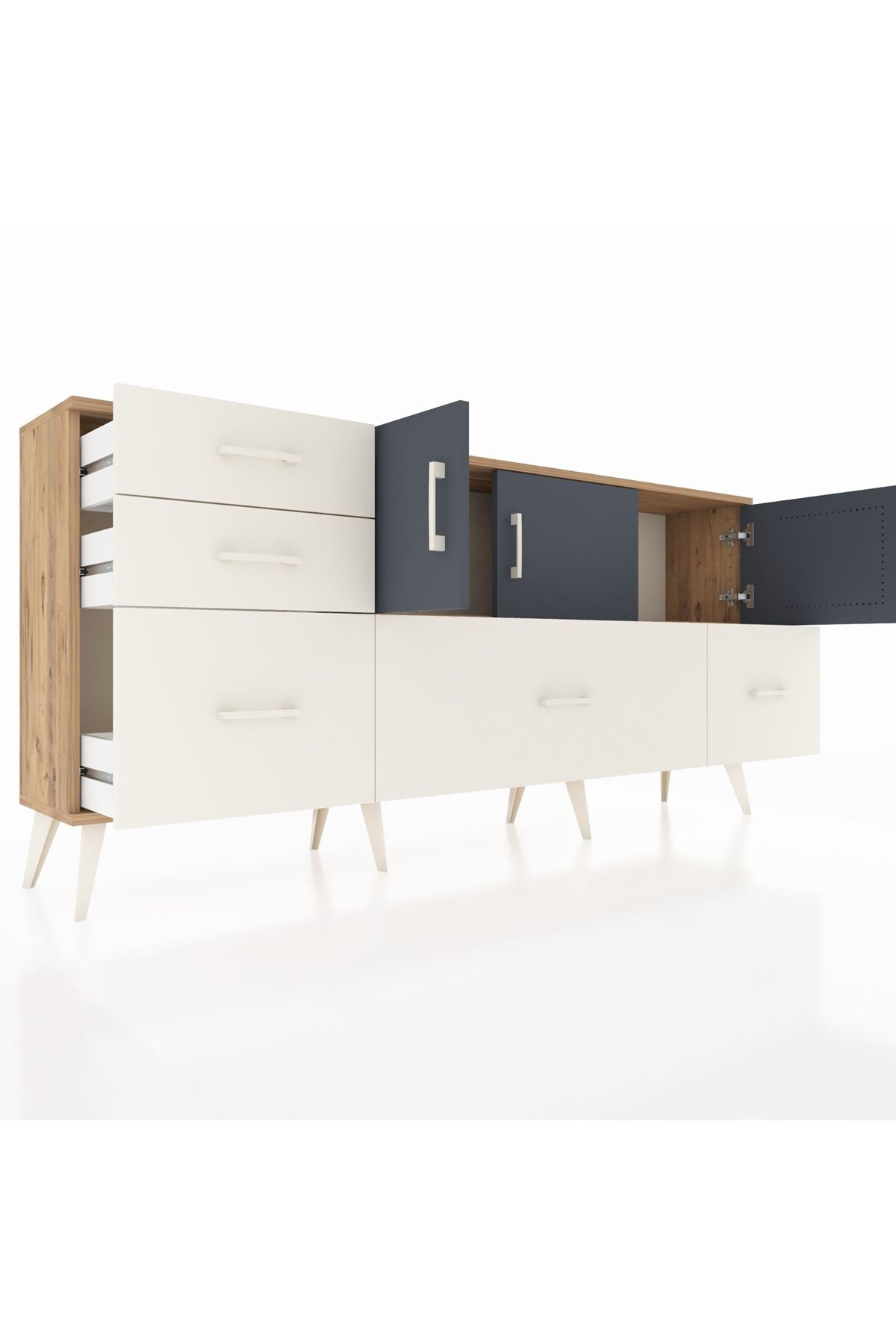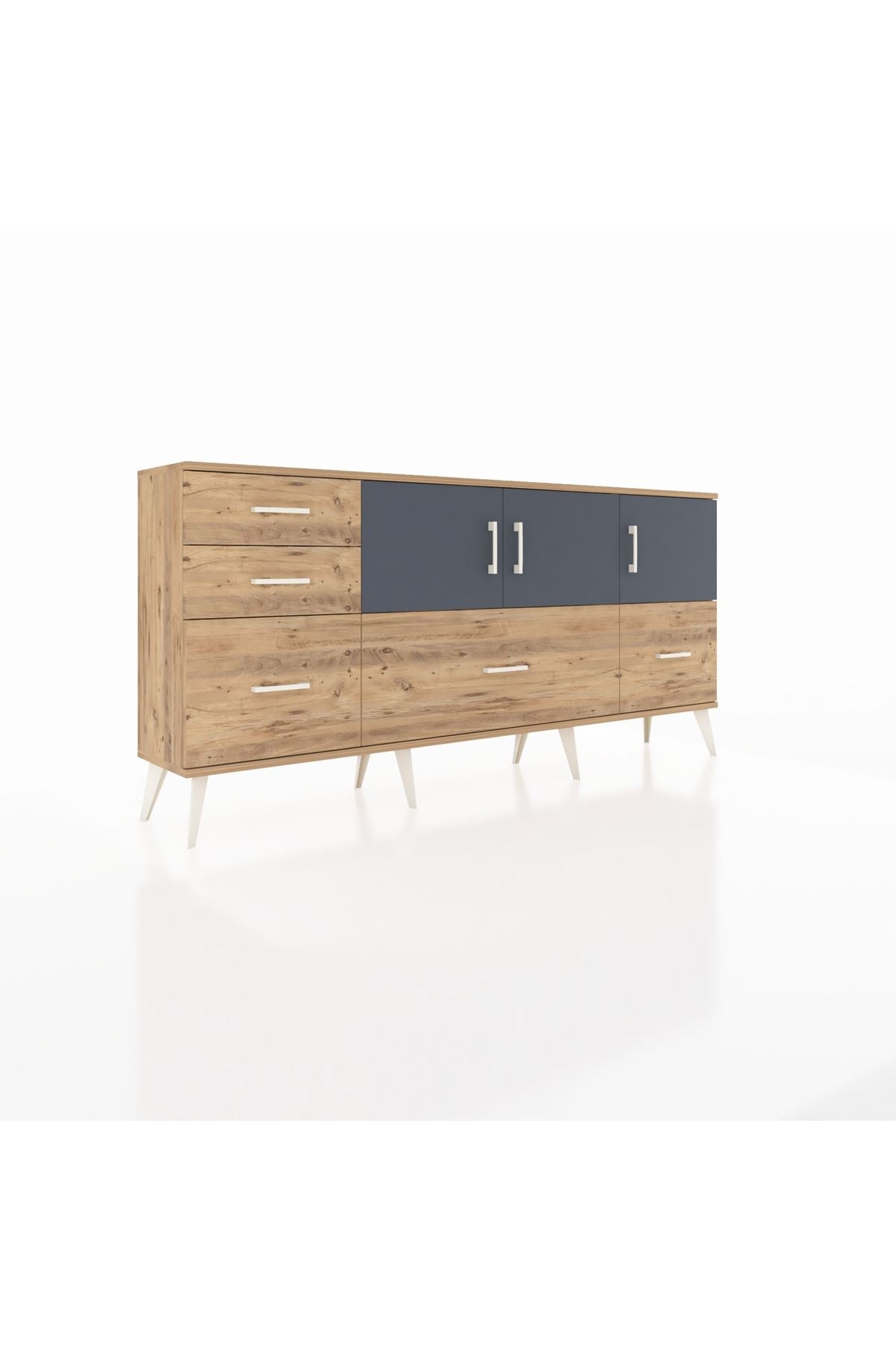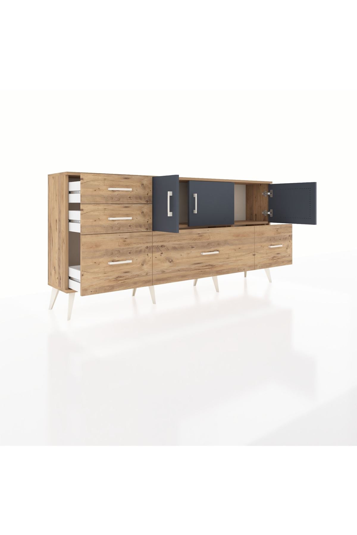 ✨ Arges Konsol 2 Raflı 5 Çekmeceli 3 Kapaklı (176x30x83 cm) ile yaşam alanlarınıza şıklık ve düzen katın! Fonksiyonel tasarımı ve modern görünümü ile bu konsol, evinizin her köşesine uyum sağlayacak.