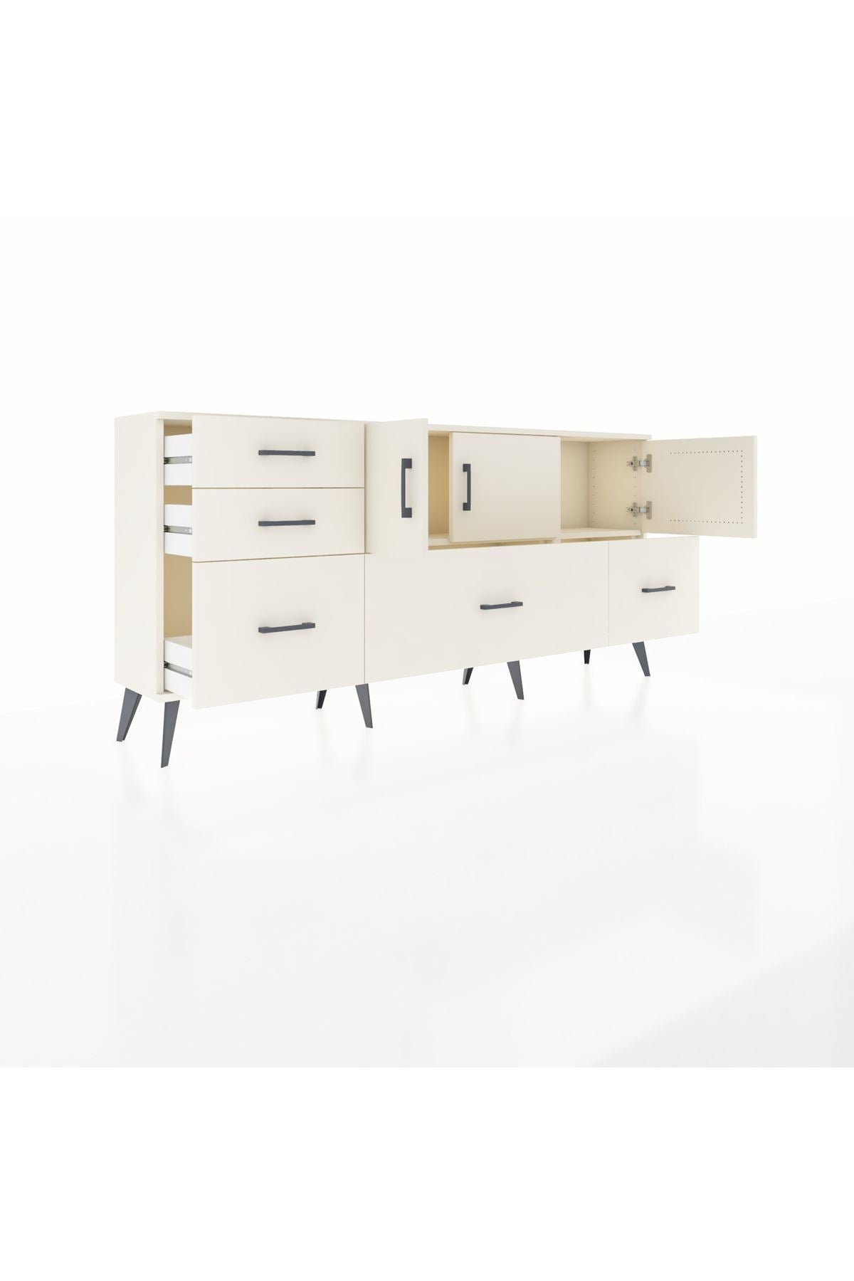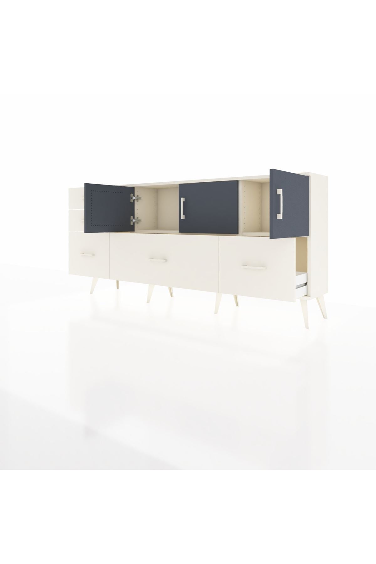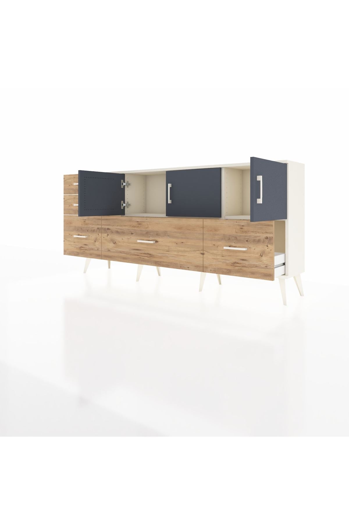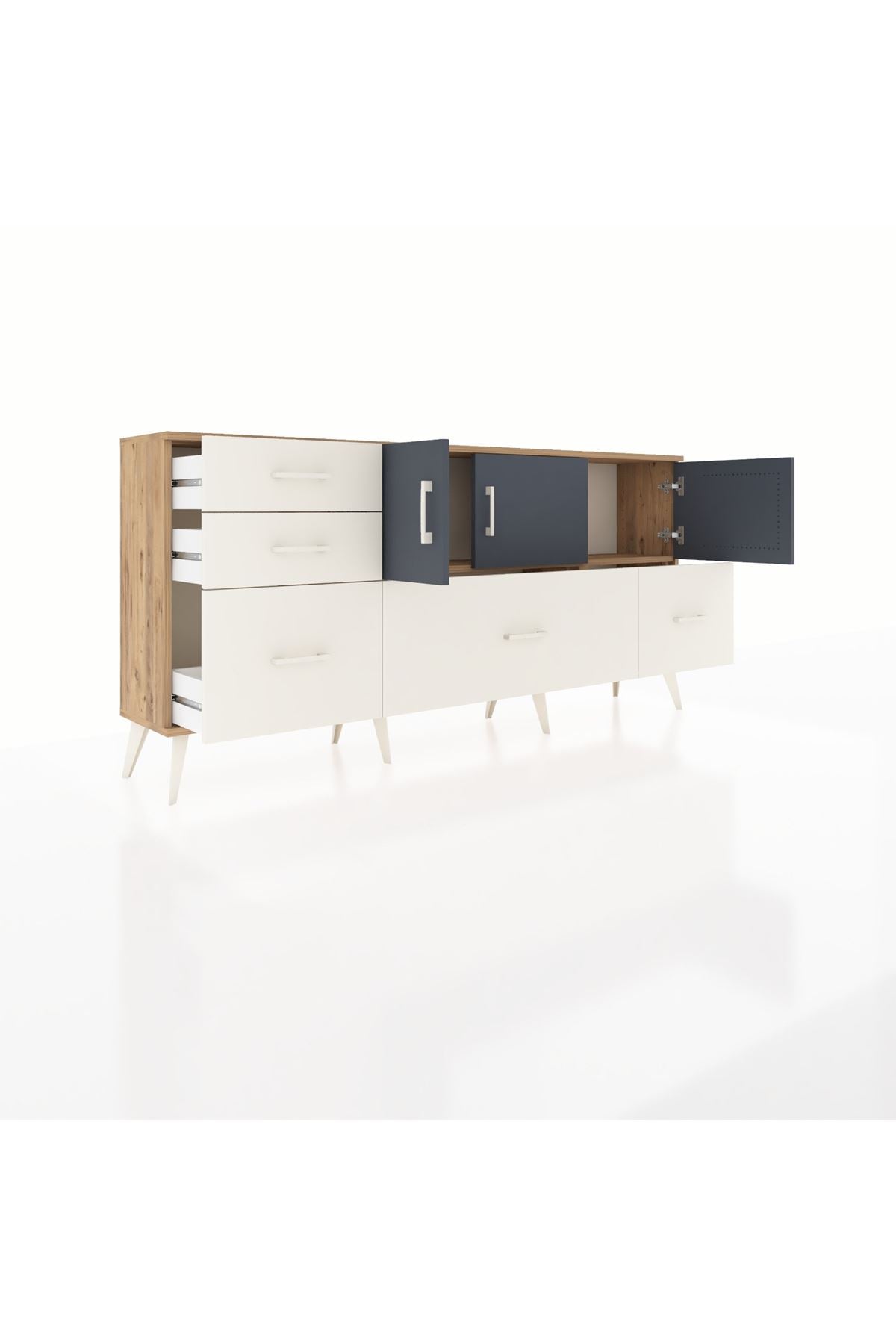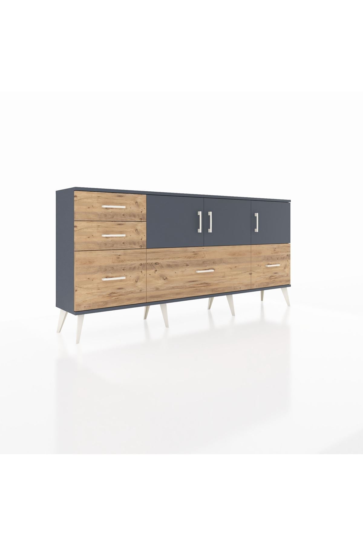 ✨ Arges Konsol 2 Raflı 5 Çekmeceli 3 Kapaklı (176x30x83 cm) ile yaşam alanlarınıza şıklık ve düzen katın! Fonksiyonel tasarımı ve modern görünümü ile bu konsol, evinizin her köşesine uyum sağlayacak.