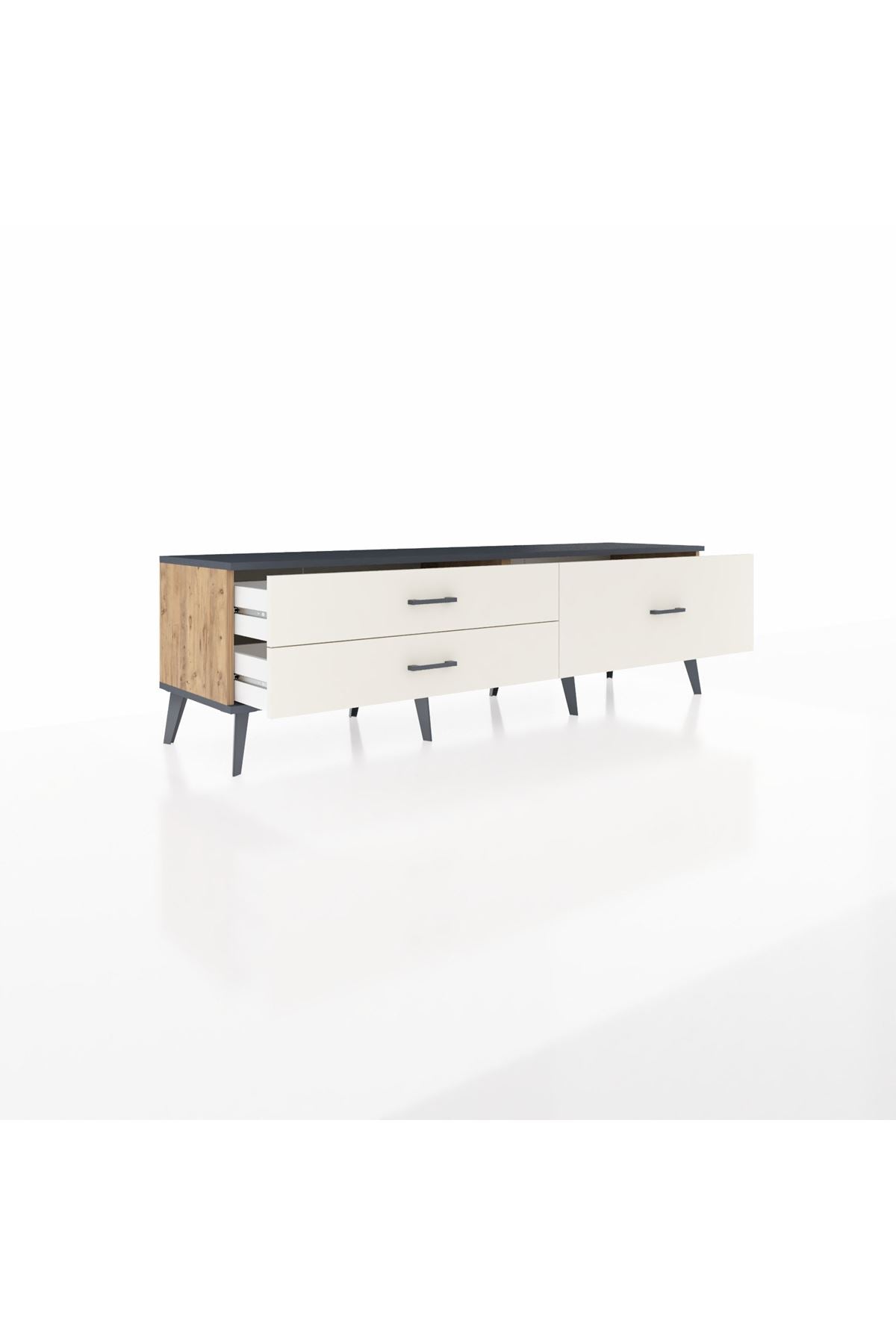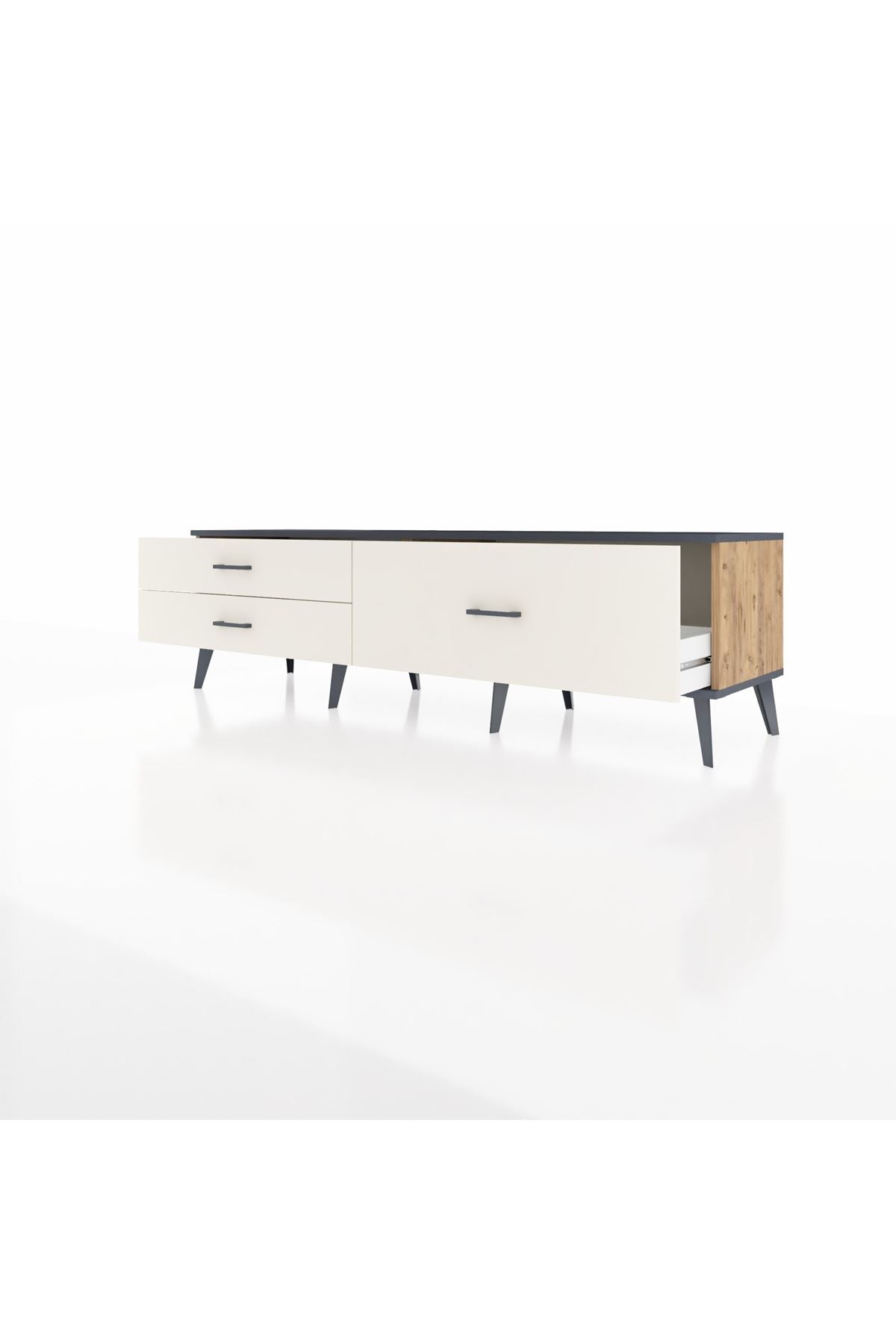 🛠️ Kastamonu Entegre'nin 1. sınıf suntalam malzemesiyle üretilmiş olan bu TV ünitesi, 1.2 mm kenar bandı ve dayanıklı metal ayakları sayesinde sağlamlık sağlar. Metal kulplarla tamamlanan çekmeceler, estetik bir görünüm sunar. Çekmeceler 23 cm açılma mesafesi sunar.