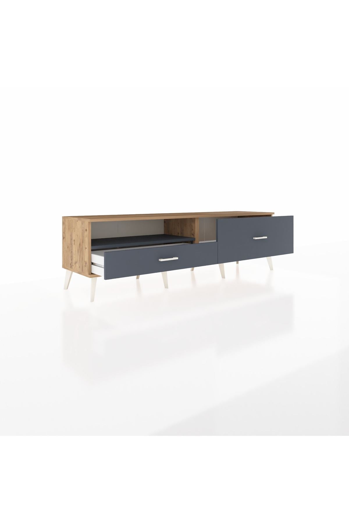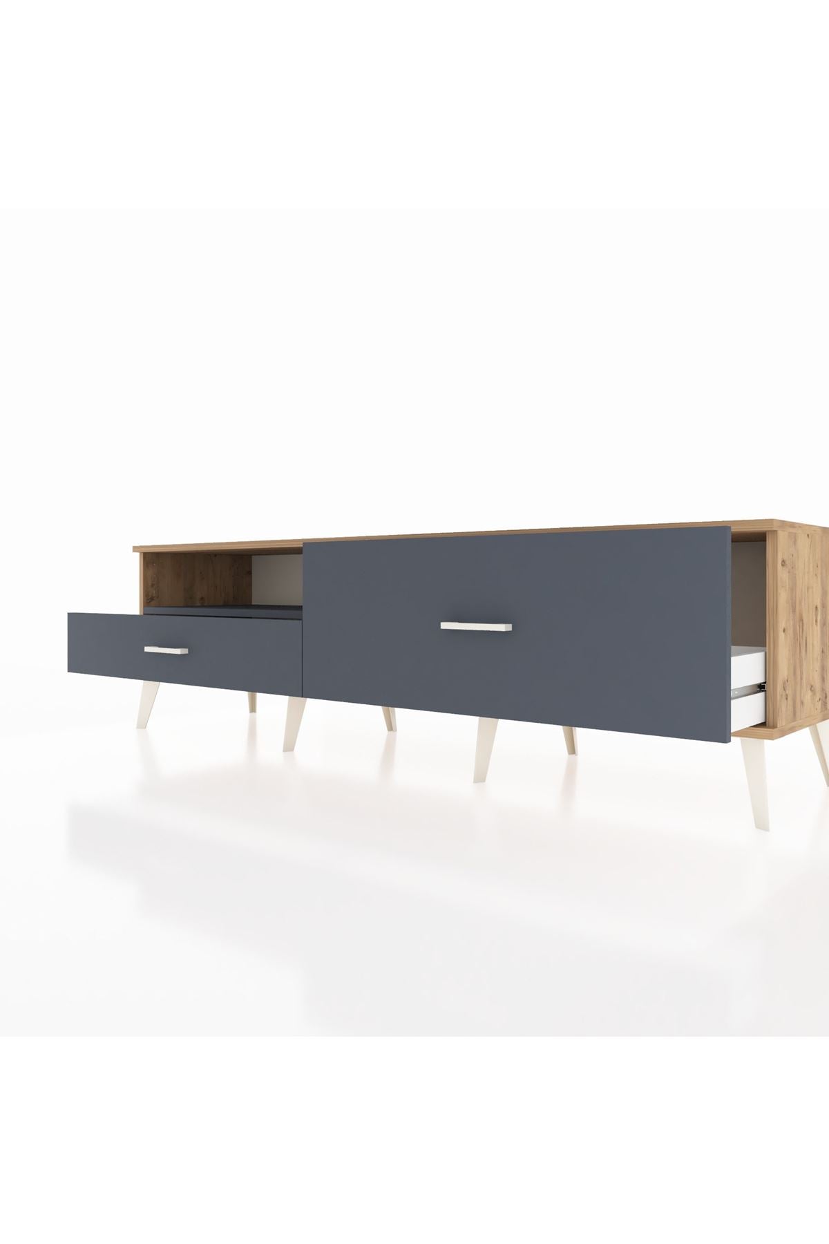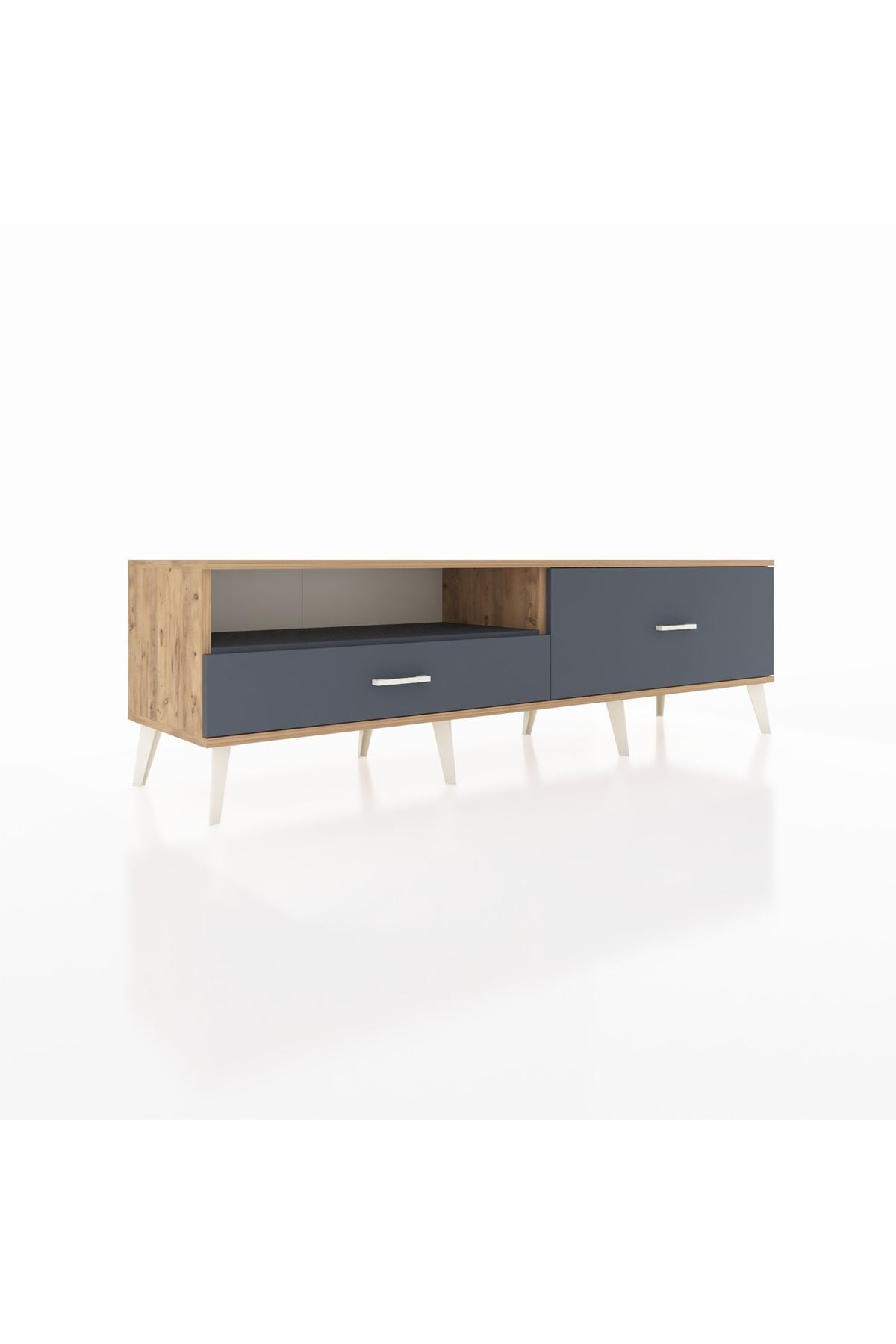 🪵 Kalitesiyle öne çıkan Hyperion TV Ünitesi'nde Kastamonu Entegre 1. sınıf suntalam gövde ve kapaklar kullanılmış olup, 1.2 mm kenar bandı dayanıklılığı artırır. Metal ayaklar ve kulp detayları, ürünün estetik ve dayanıklı yapısını tamamlar.