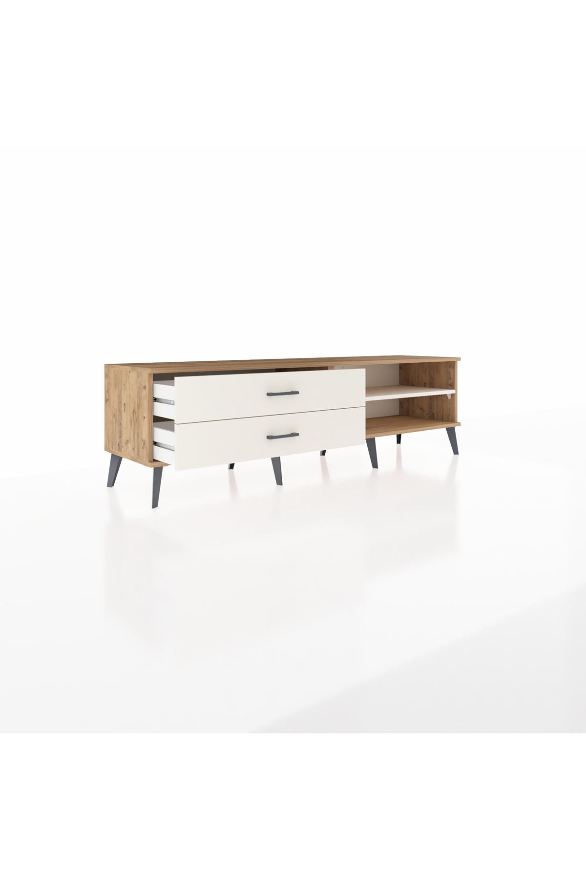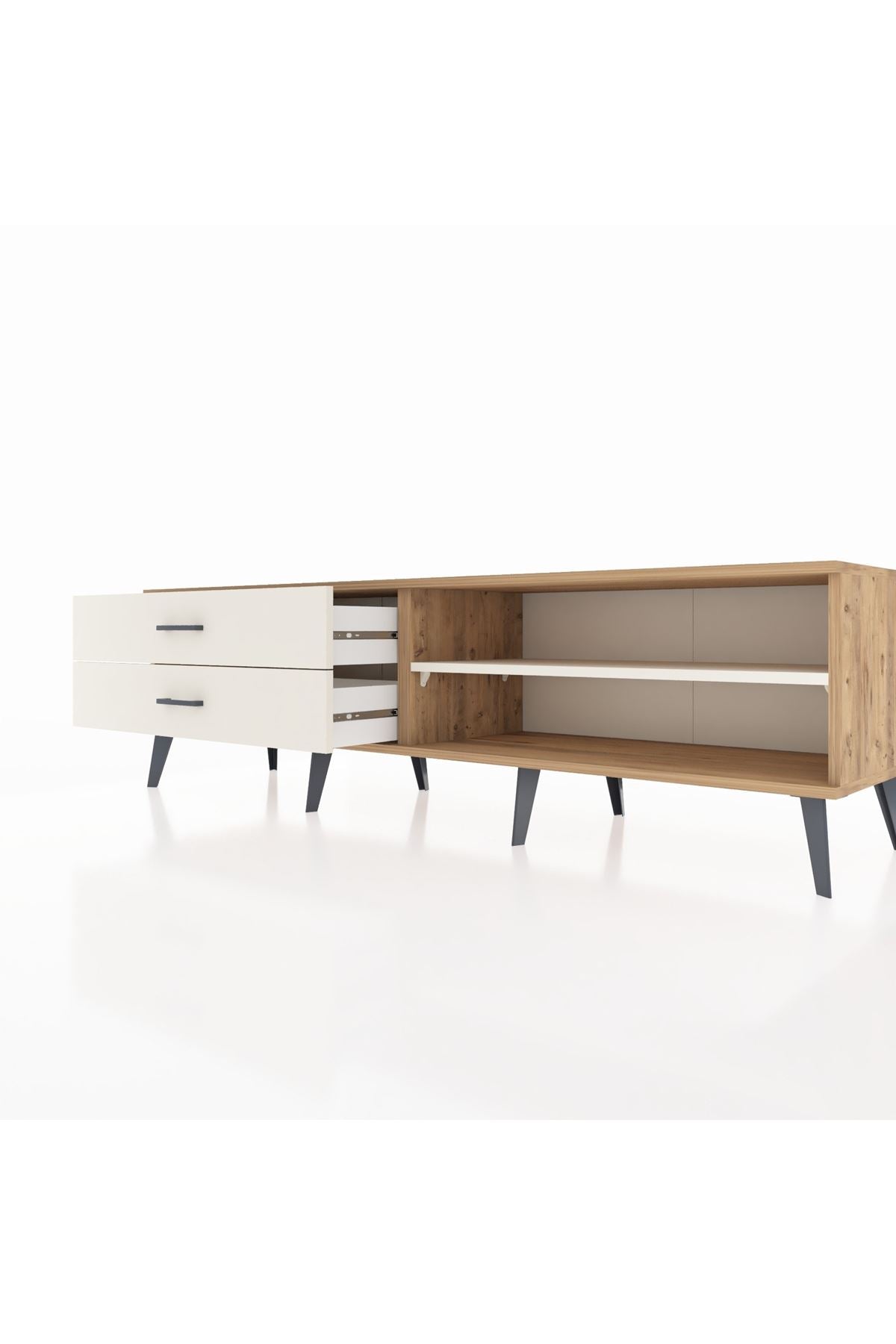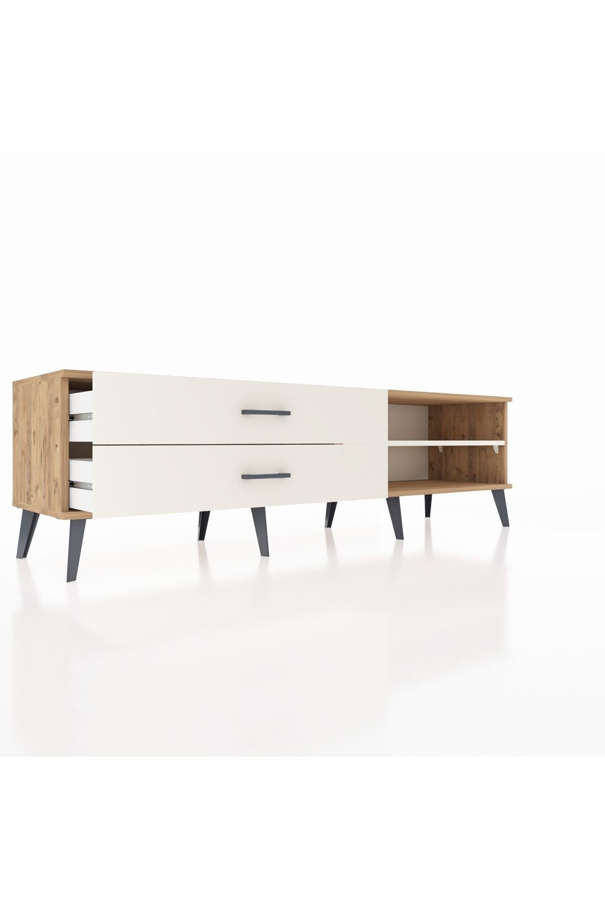 🌟 Metal ayak ve kulp detayları, mobilyanıza hem dayanıklılık hem de estetik bir değer katıyor. İster TV ünitesi olarak kullanabilir, ister dekoratif objelerle zenginleştirebilirsiniz. Kastamonu Entegre 1. sınıf suntalam gövde ve kapaklarıyla, 1.2 mm kenar bandı sayesinde uzun ömürlü ve sağlam bir yapıya sahip.