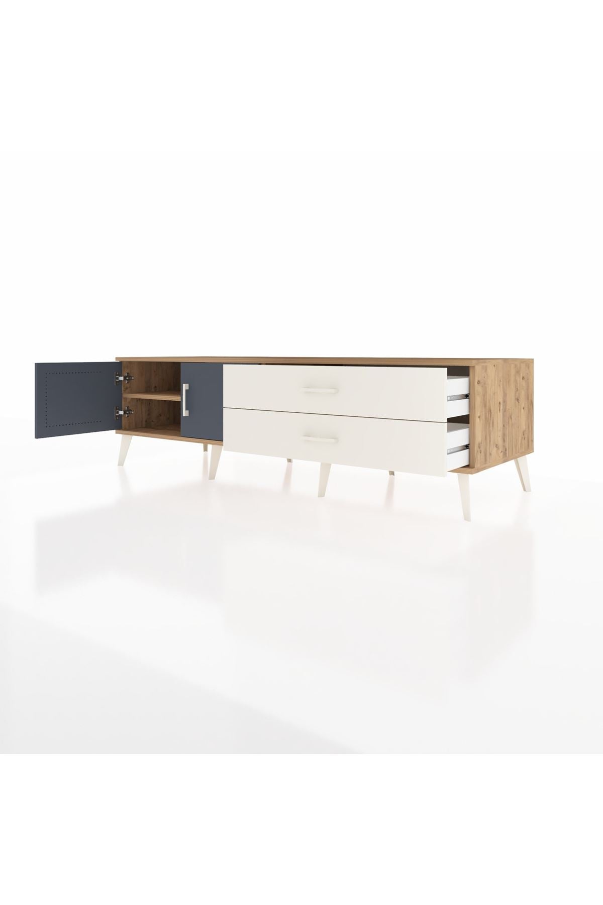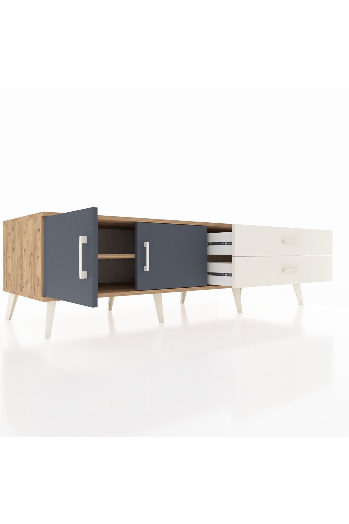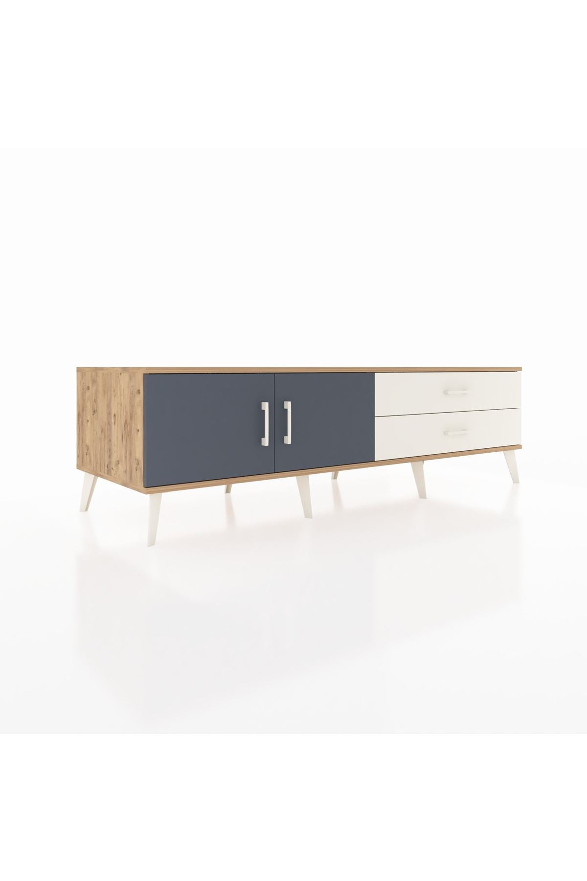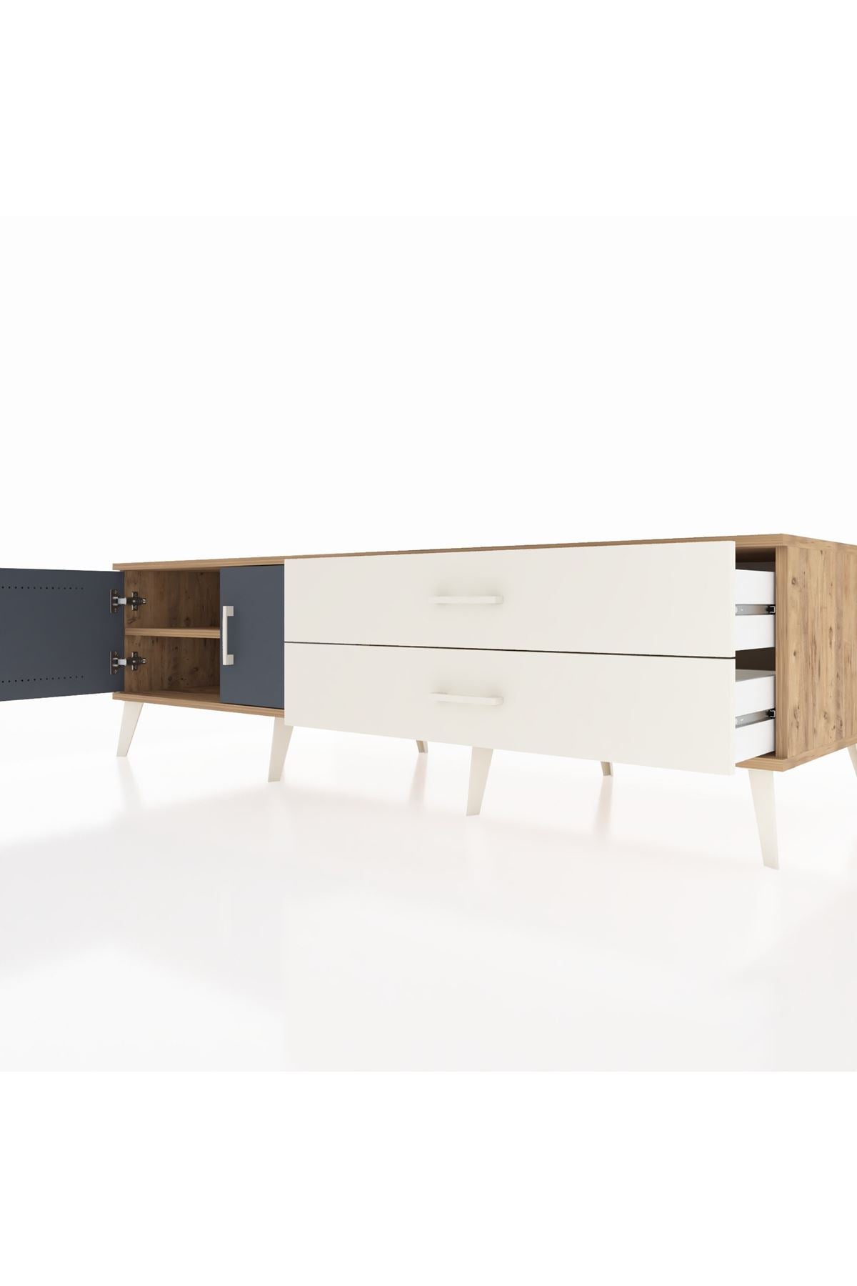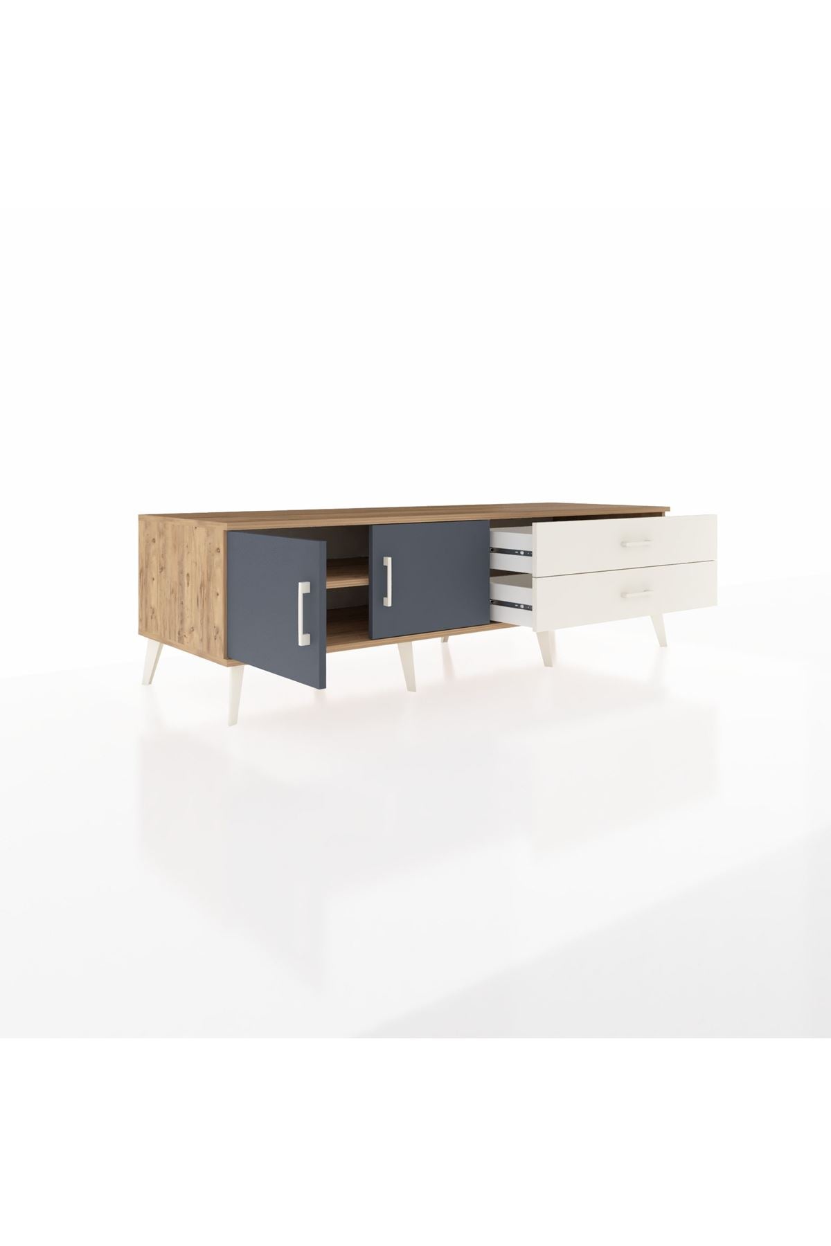 ✨ İç mekânınıza zarafet katmak için Kronos TV Ünitesi Tek Raflı 2 Çekmeceli 2 Kapaklı, dikkat çekici Çam-Antrasit ve Aytaşı renk kombinasyonuyla karşınızda! 💫