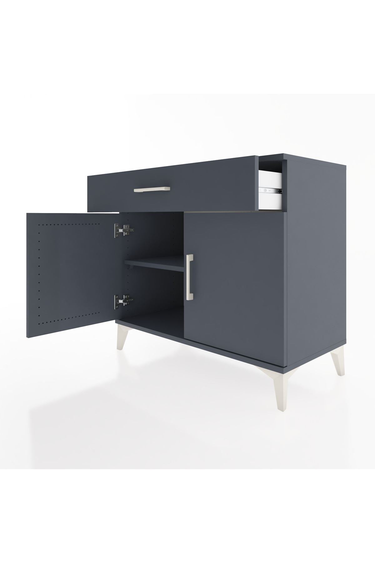 Tek çekmecesi sayesinde küçük eşyalarınızı düzenli şekilde saklayabilir, iki kapaklı alt bölmesi ile büyük eşyalar, havlu ve mevsimlik tekstilleri kolayca yerleştirebilirsiniz. Ayarlanabilir raf sistemi depolama ihtiyaçlarınıza göre esneklik sağlar; raf yüksekliğini değiştirerek farklı boyutlardaki ürünleri yerleştirebilirsiniz. Metal ayaklar zeminden yüksekte kullanım sağlayarak temizlik kolaylığı sunar ve mobilyanın uzun ömürlü olmasına katkıda bulunur. Üst yüzey dekoratif obje veya günlük kullanım için alan yaratarak hem estetik hem fonksiyonel kullanım sağlar.